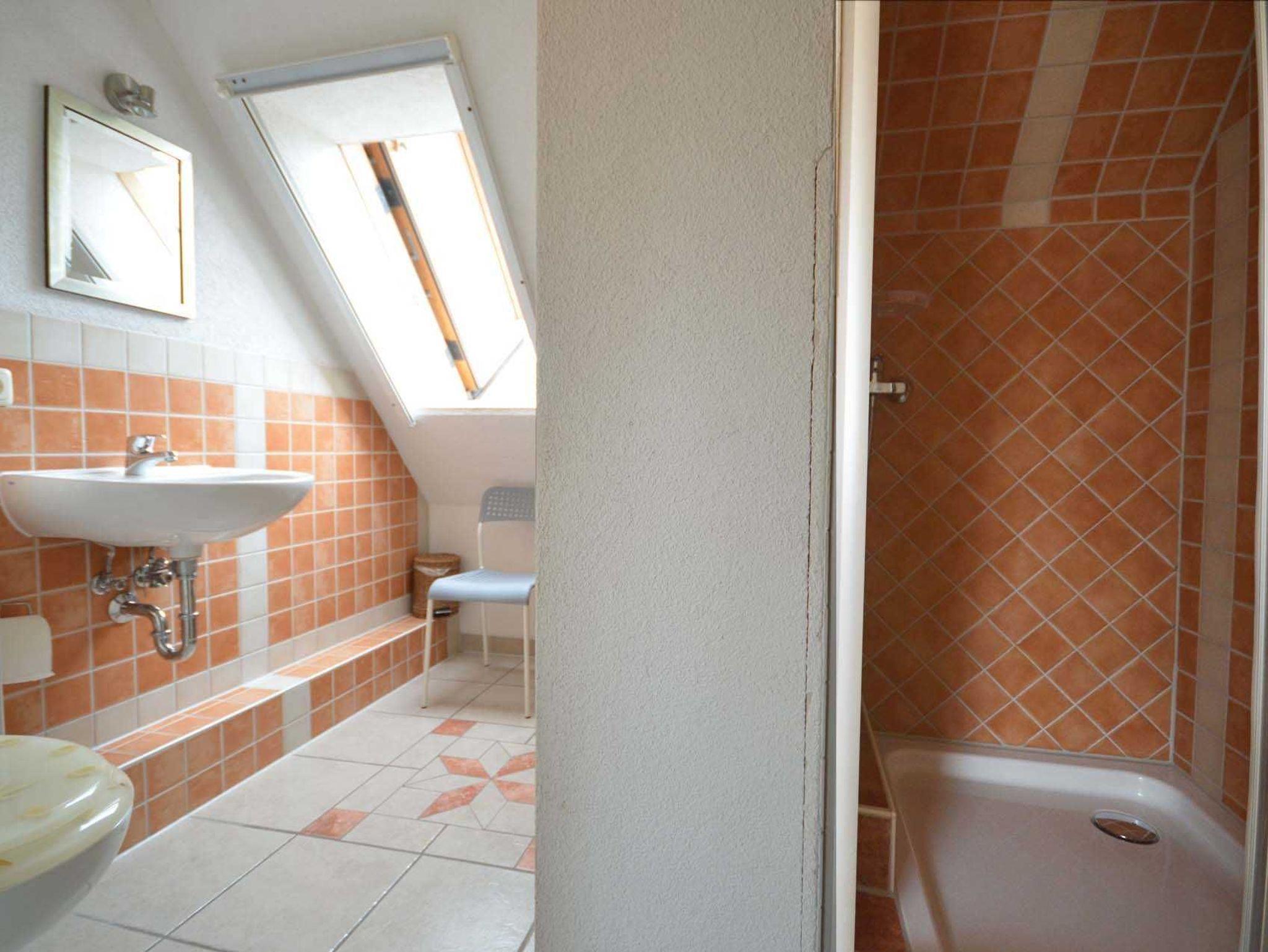 • Im Bad befindet sich die Dusche, Waschbecken, Toilette und ein Handtuchheizkörper.