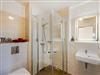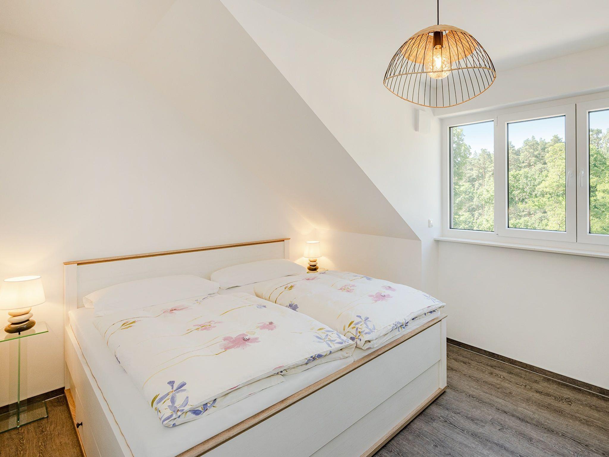 Im Obergeschoss befinden sich zwei separate Schlafräume, jeweils ausgestattet mit hochwertigem Doppelbett und Kleiderschrank. Ein weiteres Badezimmer mit ebenerdiger Dusche und WC sorgt für zusätzlichen Komfort. An den Fenstern sind Plissees montiert; einige Fenster verfügen zudem über Insektenschutz.