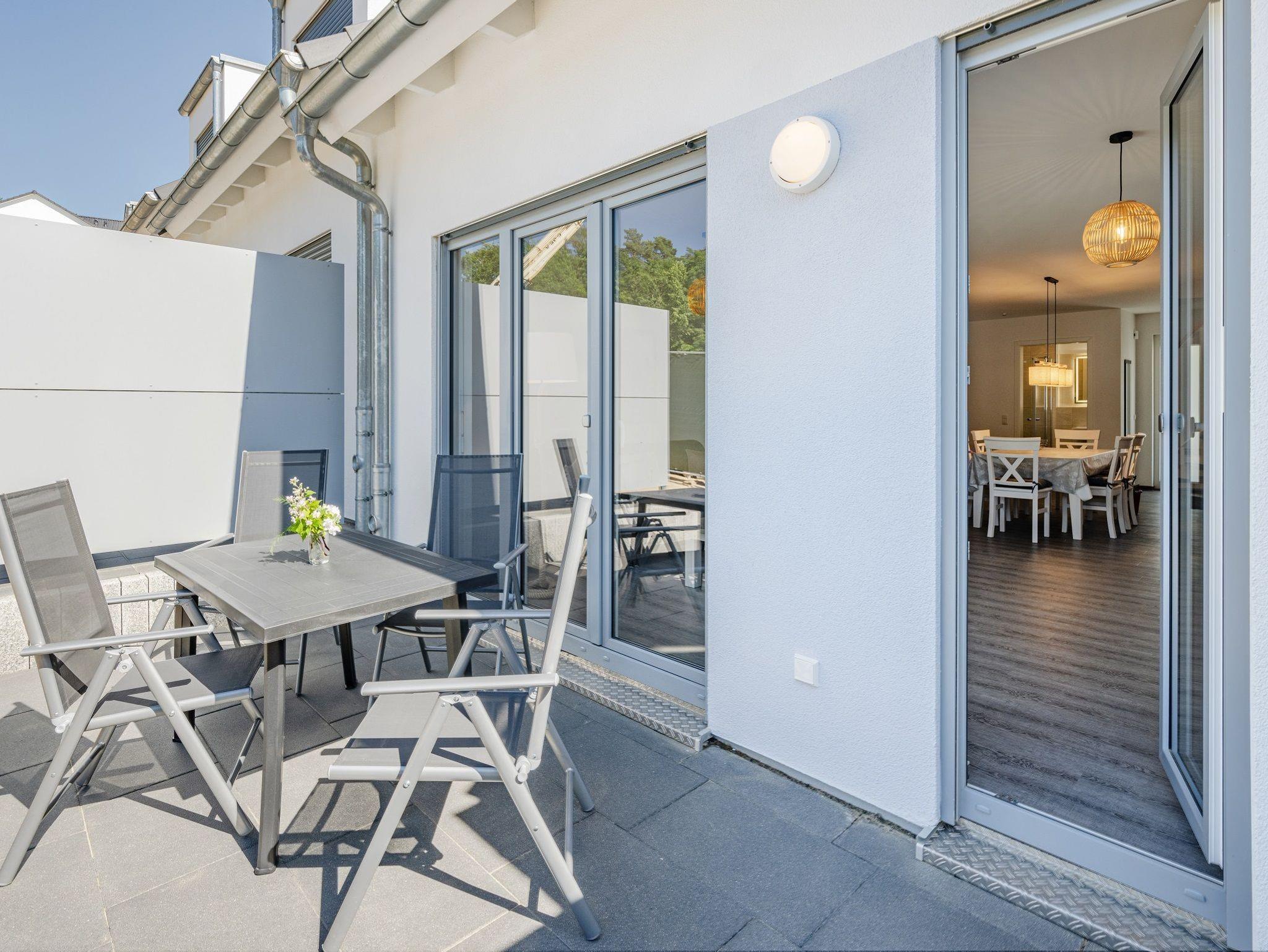 Die Sonnenterrasse mit Gartenmöbeln und kleinem Garten ist vom Wohnzimmer aus erreichbar, ideal zum Genießen der Urlaubstage.