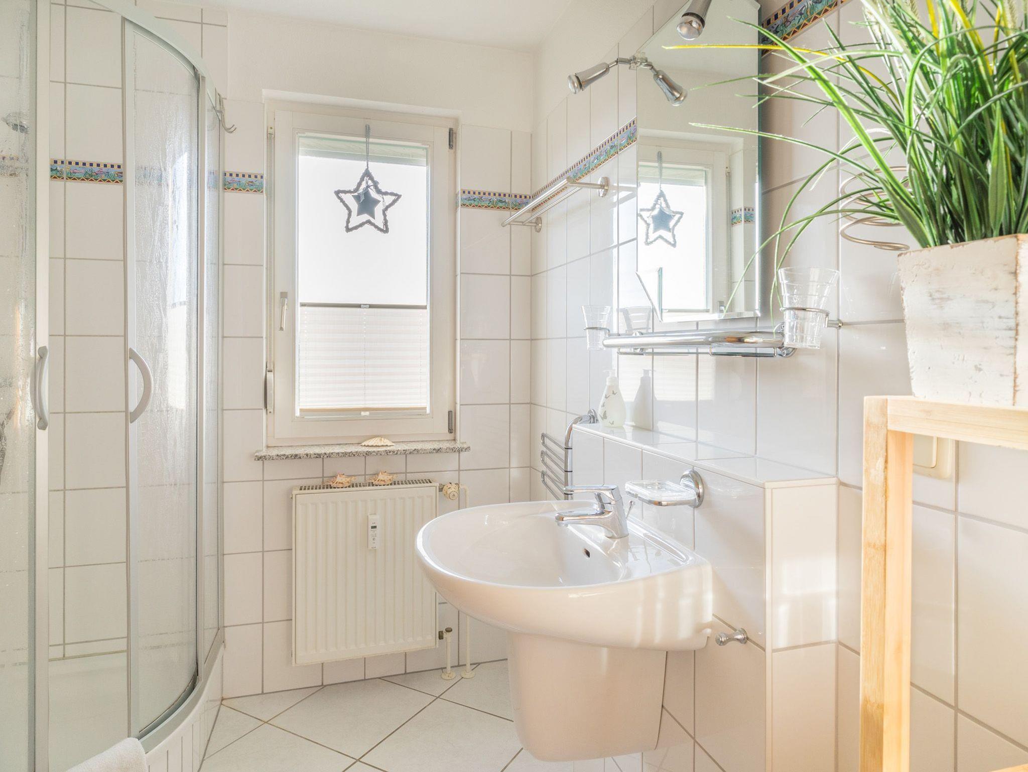 Zwei Schlafzimmer (eins mit einem Doppelbett 1,80 x 2,00 m, ein zweites kleines Schlafzimmer mit zwei Einzelbetten), ein sonniges Duschbad, Wlan, Stellplatz und ein kleines Hundebett warten auf bis zu vier große oder kleine Urlaubsgäste. Waschmaschine und Trockner stehen bei Bedarf im Souterrain gegen geringe Gebühr zur Verfügung. Die Wohnung wurde nicht nur liebevoll eingerichtet und dekoriert, sondern auch umfangreich ausgestattet. Reichlich Geschirr, Besteck, Geschirrspüler, Kühl-/Gefrierkombi, Mikrowelle, Kissen und Decken für die kühlere Jahreszeit, Sommer- und Winterbettdecken, Matratzentopper, Infomaterial zu Freizeitaktivitäten, gemütliche Beleuchtung, viel Urlaubslektüre, Außenjalousien gegen allzu viel Sommersonne,Insektenschutz in allen Zimmern, Hundebett und Näpfe… überall in der Wohnung finden sich kleine Extras für ein Gefühl von „zu Hause im Urlaub“.