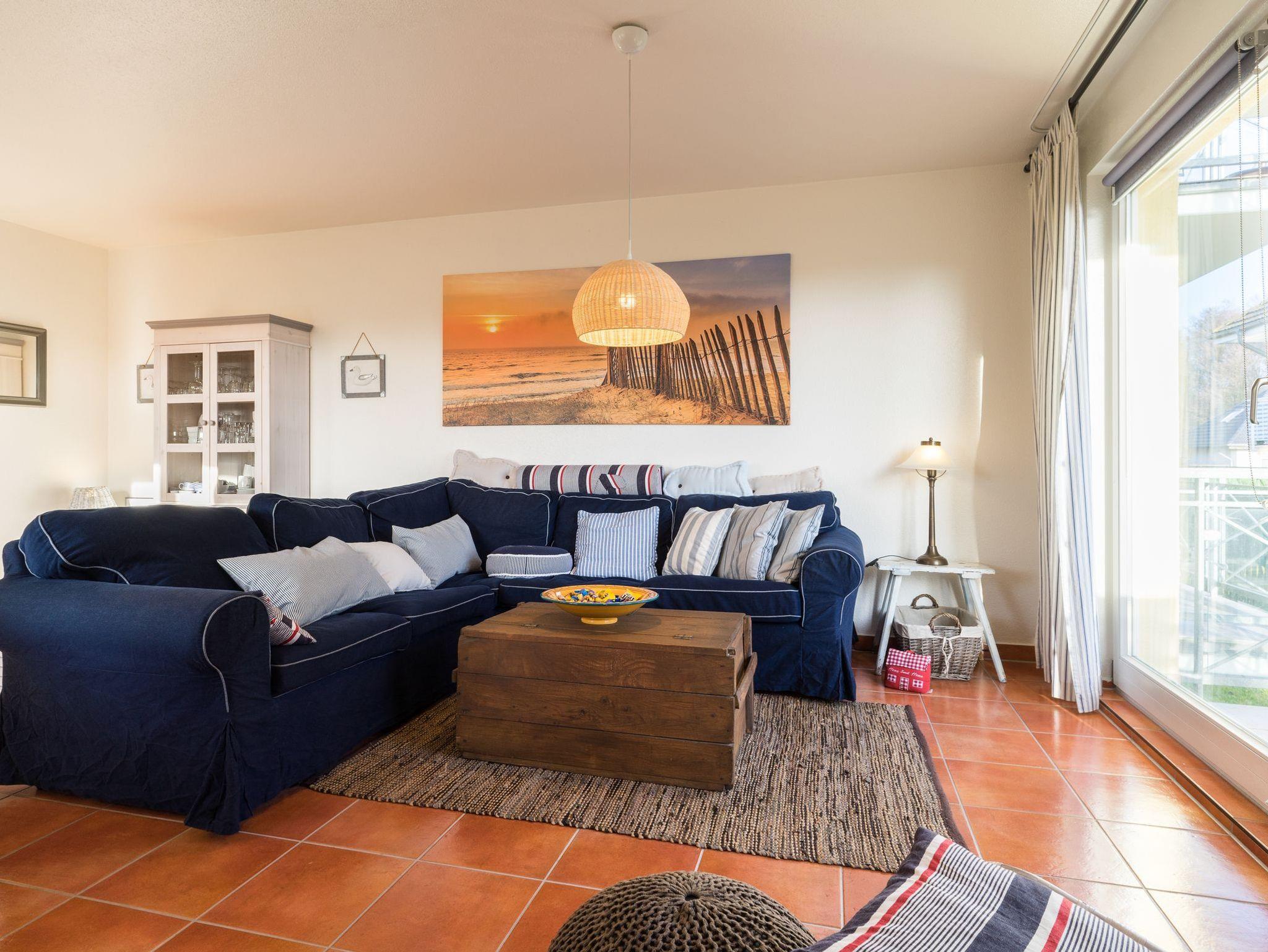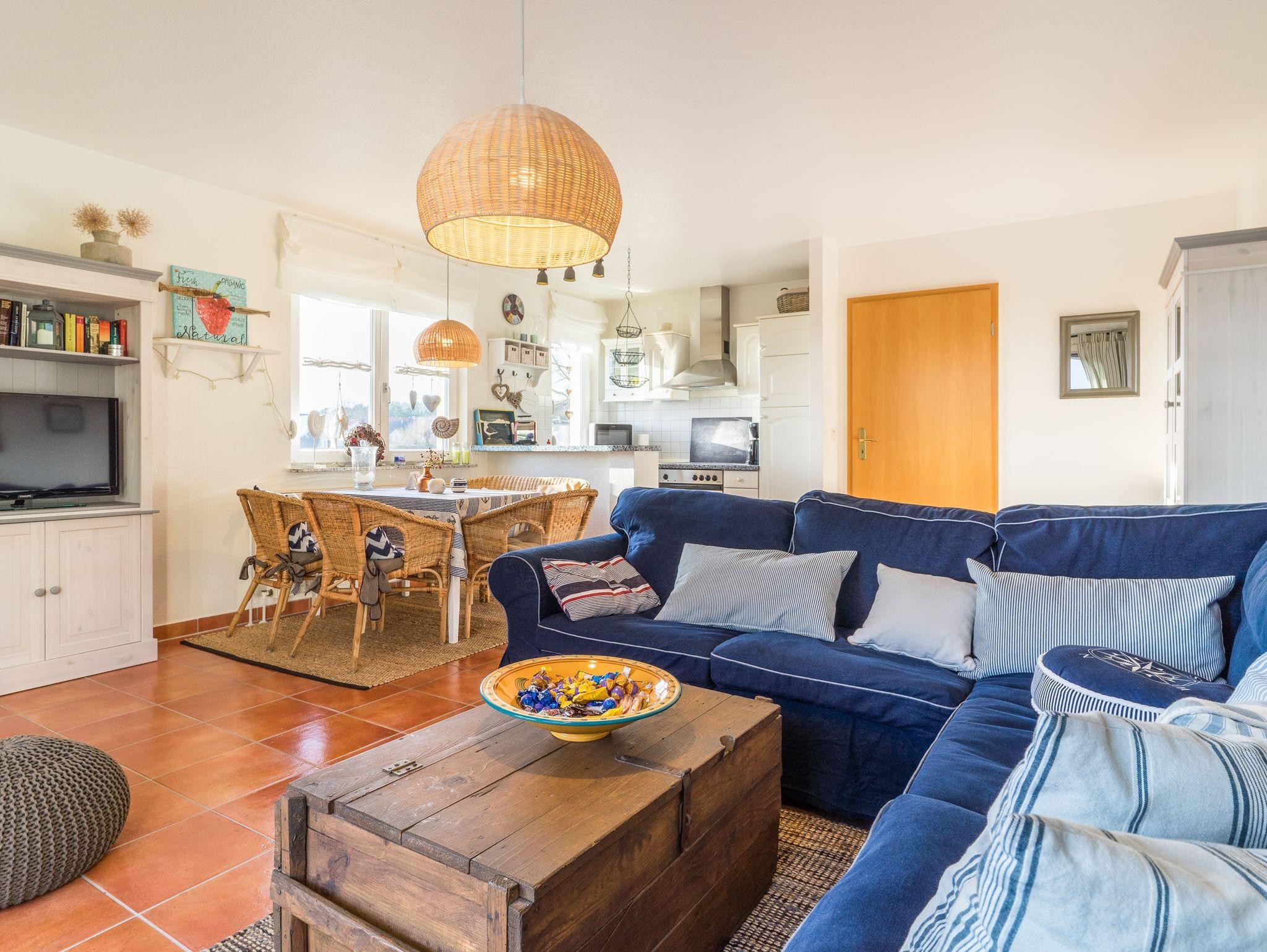 Nach einem langen Strandtag erwartet Sie in Ihrem Urlaubsdomizil ein großzügiger Wohn-, Koch- und Essbereich mit gemütlichem Ecksofa, voll ausgestatteter Küche und gemütlichem Balkon mit einem Elektrogrill. Smart-TV, Blu Ray-Player und eine Auswahl an DVDs, Spielen und Büchern sorgen für Unterhaltung. Und wenn es doch einmal richtig regnen sollte, können Sie den Nachmittag auch ganz entspannt mit einem guten Buch im Saunabereich im Souterrain vertrödeln, der allen Gästen gegen eine geringe Gebühr (2x EUR1,00 / 10 Minuten) zur Verfügung steht.