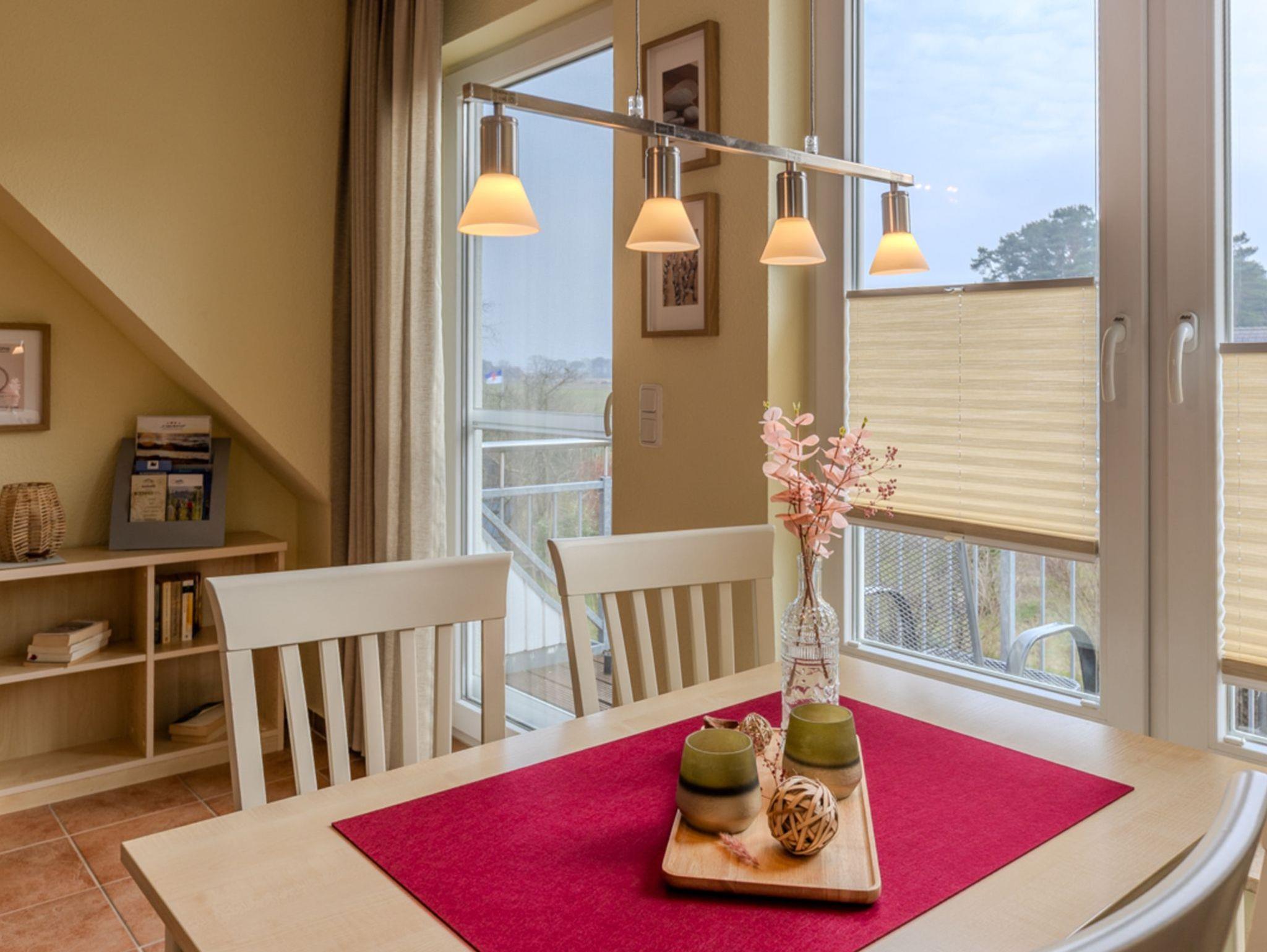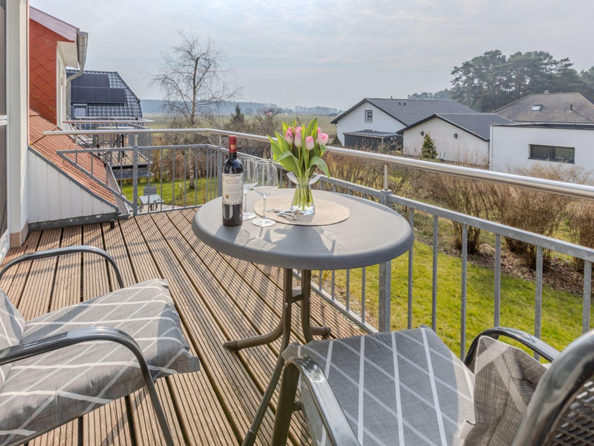 Die Dachgeschoss-Wohnung „Franziska“ ist großzügig geschnitten, ausgesprochen hell und freundlich gestaltet. Vor dem nach Süd-Westen ausgerichteten Wohnzimmer befindet sich ein geräumiger Balkon. Von diesem können Sie nicht nur zum Sonnenuntergang tief durchatmen und einen traumhaften Blick über die angrenzenden Wiesen auf das Achterwasser genießen.