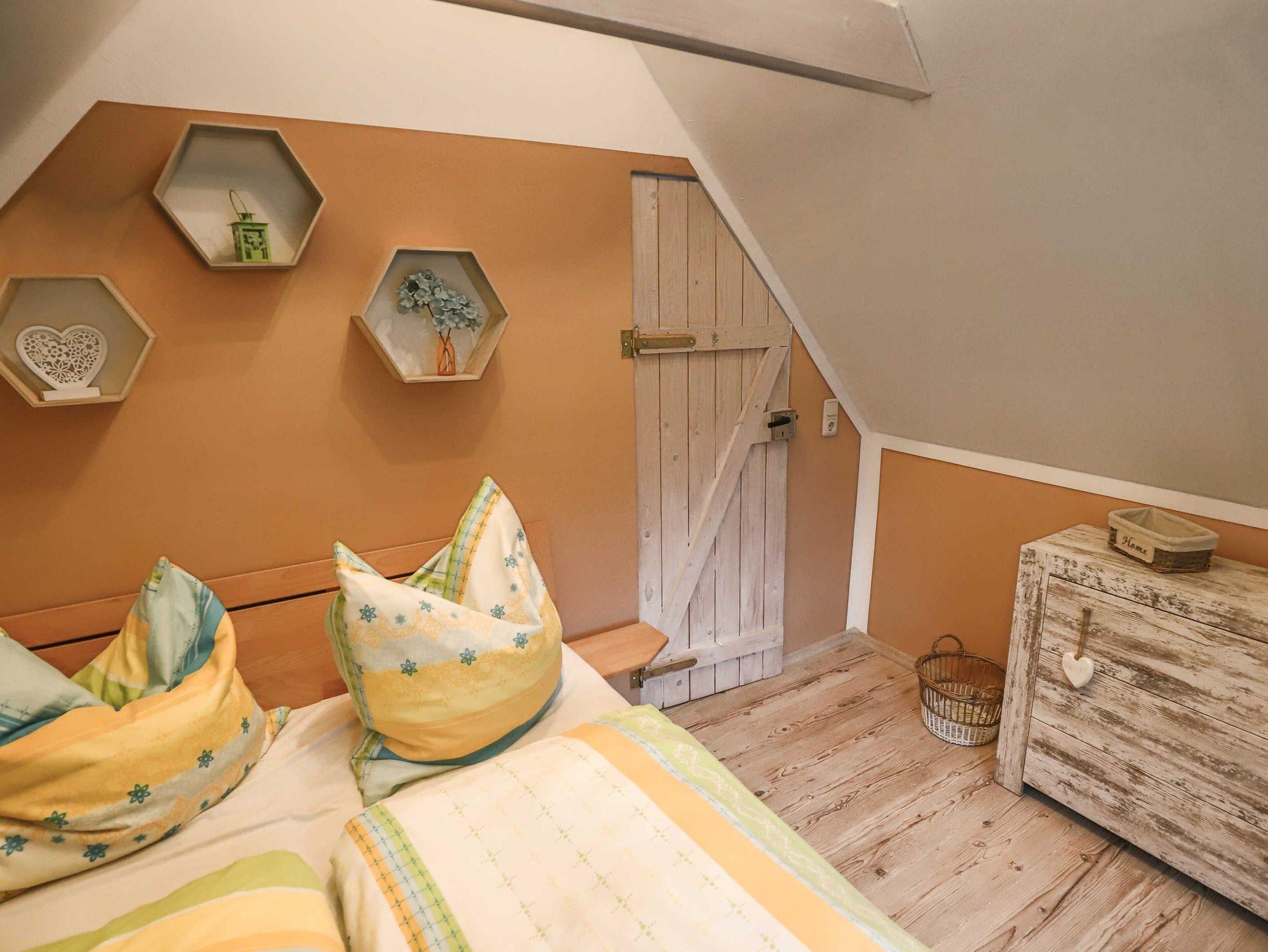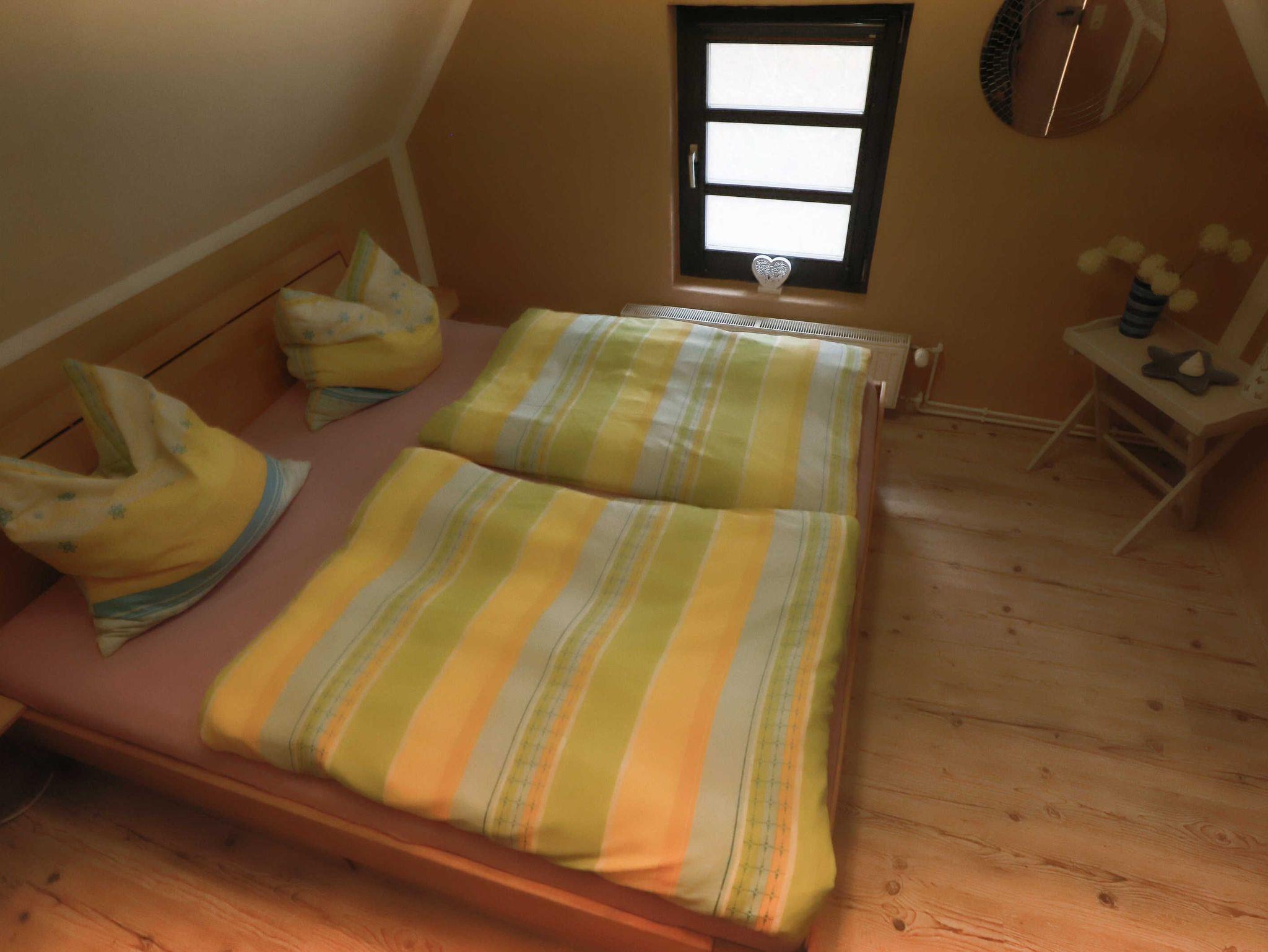 Im Obergeschoss finden Sie die beiden Schlafzimmer mit je einem Doppelbett (1,60 x 2,00 m) und (1,80 x 2,00 m) mit Möbeln im skandinavischen Stil, sowie das Badezimmer mit Dusche und Wc. Letzte Sanierung des Ferienhauses erfolgte 2024. WLAN erhalten sie von uns gratis.