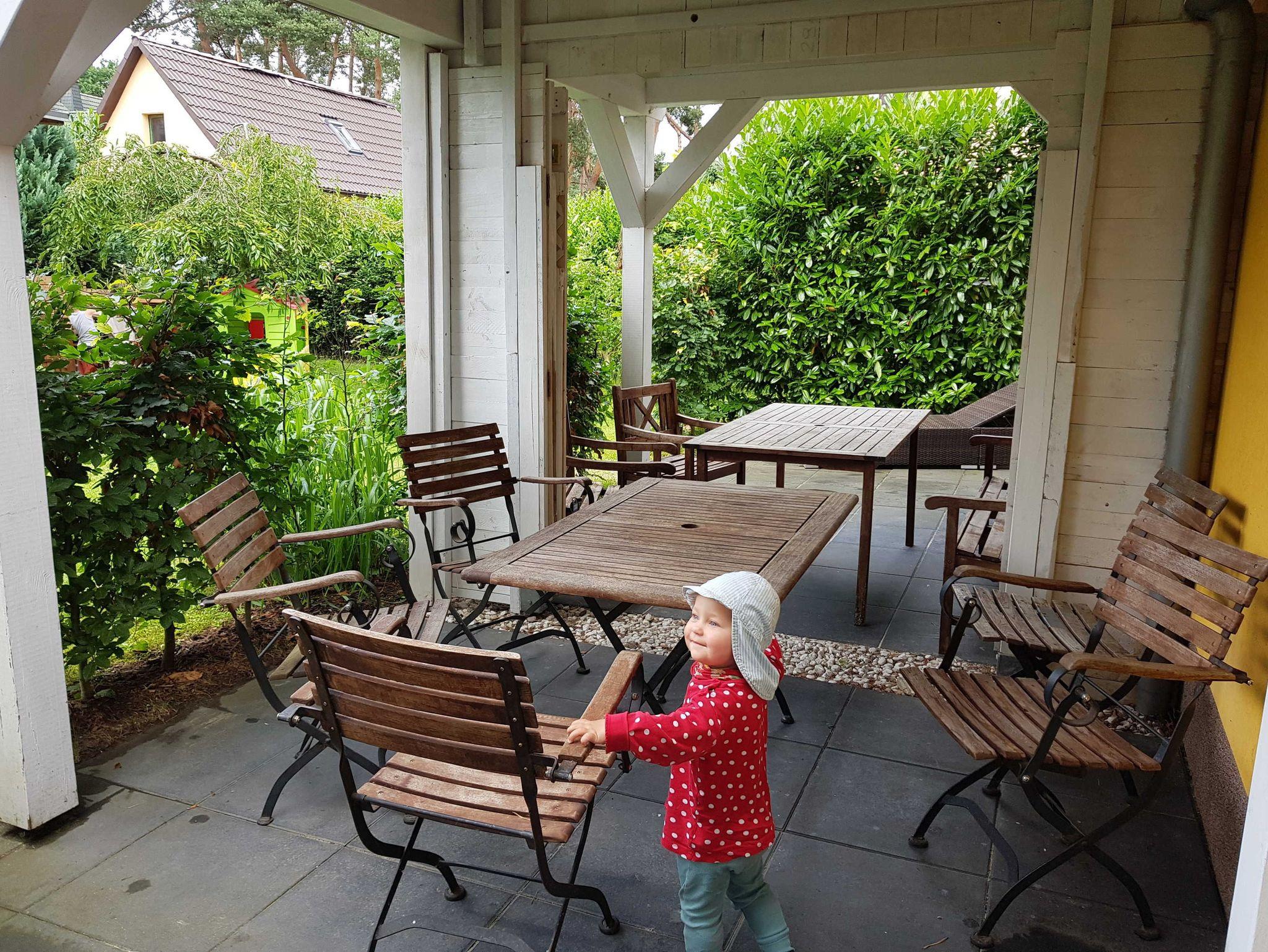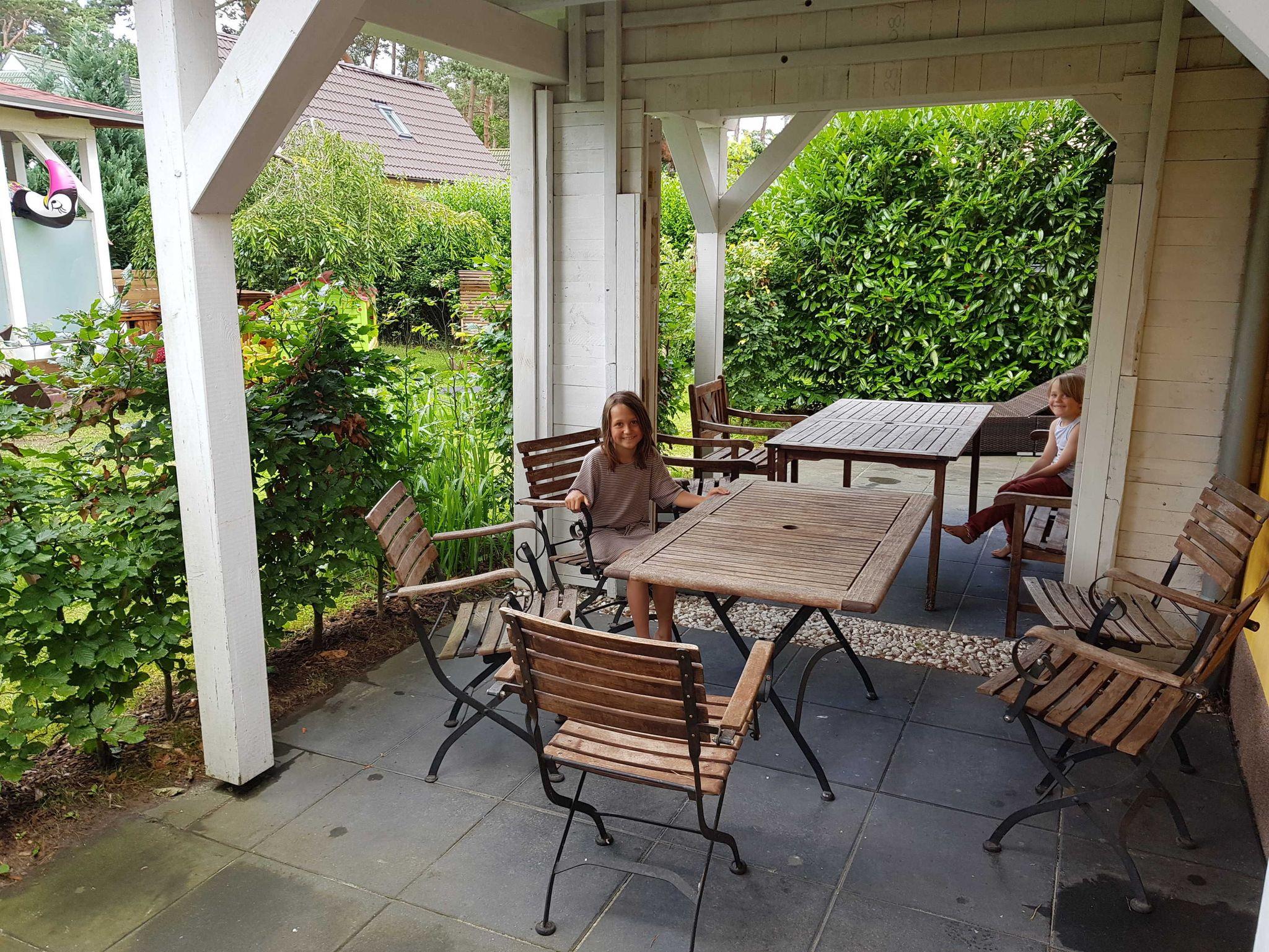 • Großzügigen Terrasse mit Gartenblick und mit Außensauna zur Nutzung. Mit stabiler Sitzgarnitur aus Holz. Für Fewo 1 mit 2 Stühlen, einer Bank und einem Tisch und für Fewo 2 mit 5 Stühlen und einem Tisch. Siehe Fotos. Terrassentür und das Terrassenfenster sind jeweils mit einem Plissee ausgestattet, welches Sie zum Schutz gegen Sonnenlicht oder Blicke nutzen können.