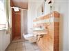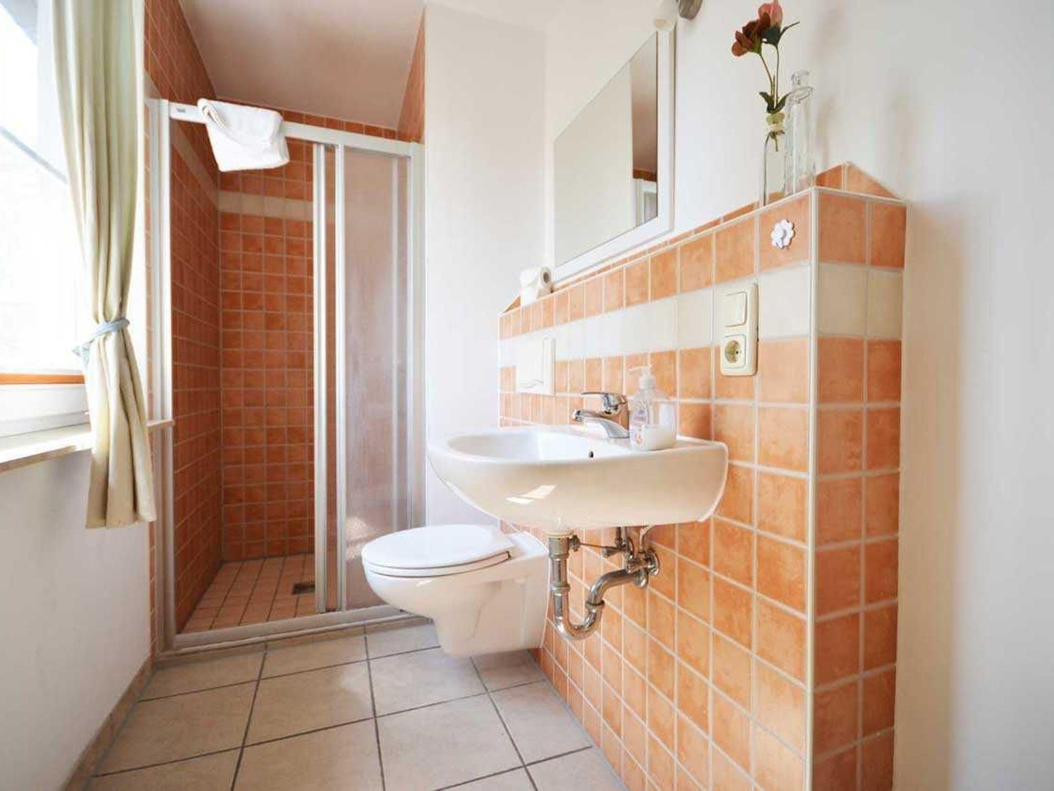 • Im Bad befindet sich die Dusche, Waschbecken, Toilette und ein Handtuchheizkörper. Das Badfenster wurde mit einem Plissee und einem Vorhang ausgestattet.
