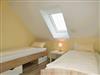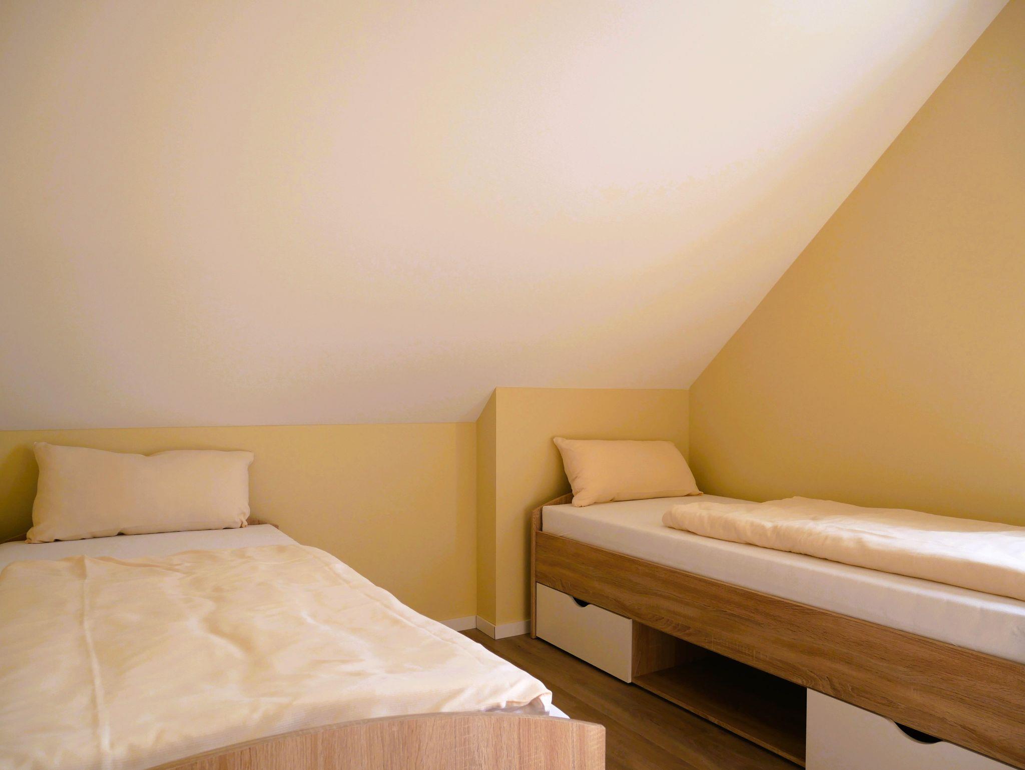 Über eine Treppe mit 15 Stufen gelangen Sie in das Obergeschoss, wo zwei separate Schlafzimmer auf Sie warten: Eines ist mit einem gemütlichen Doppelbett und einem geräumigen Kleiderschrank eingerichtet, das zweite verfügt über zwei Einzelbetten und ebenfalls einen Kleiderschrank. In beiden Schlafräumen sorgen Verdunklungsmöglichkeiten und Insektenschutz an den Fenstern für angenehme Ruhe und erholsamen Schlaf.