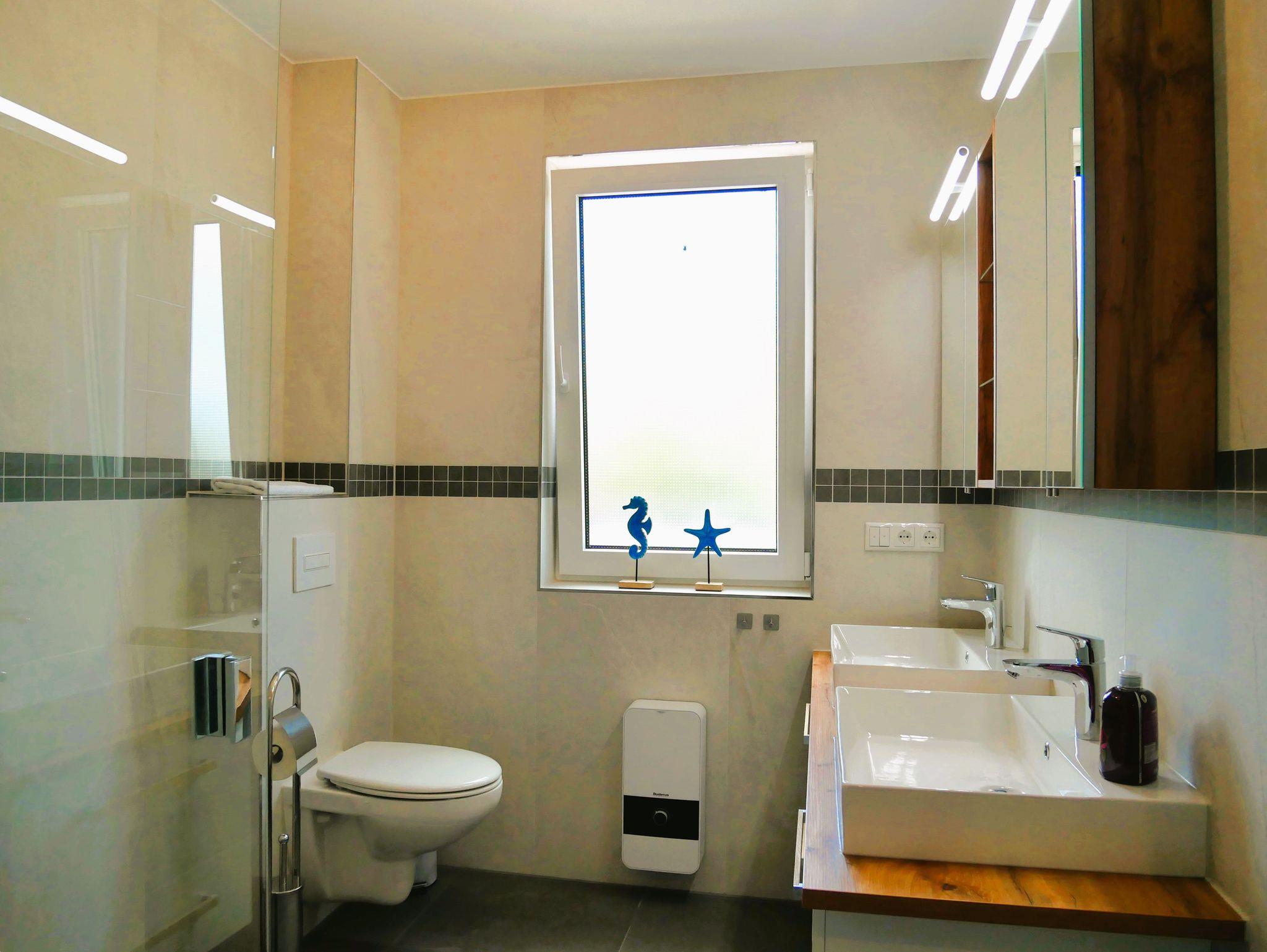 Das helle Tageslichtbad ist mit zwei Waschbecken, einem WC sowie einer ebenerdigen Dusche ausgestattet und verfügt über ein Fenster zur natürlichen Belüftung.