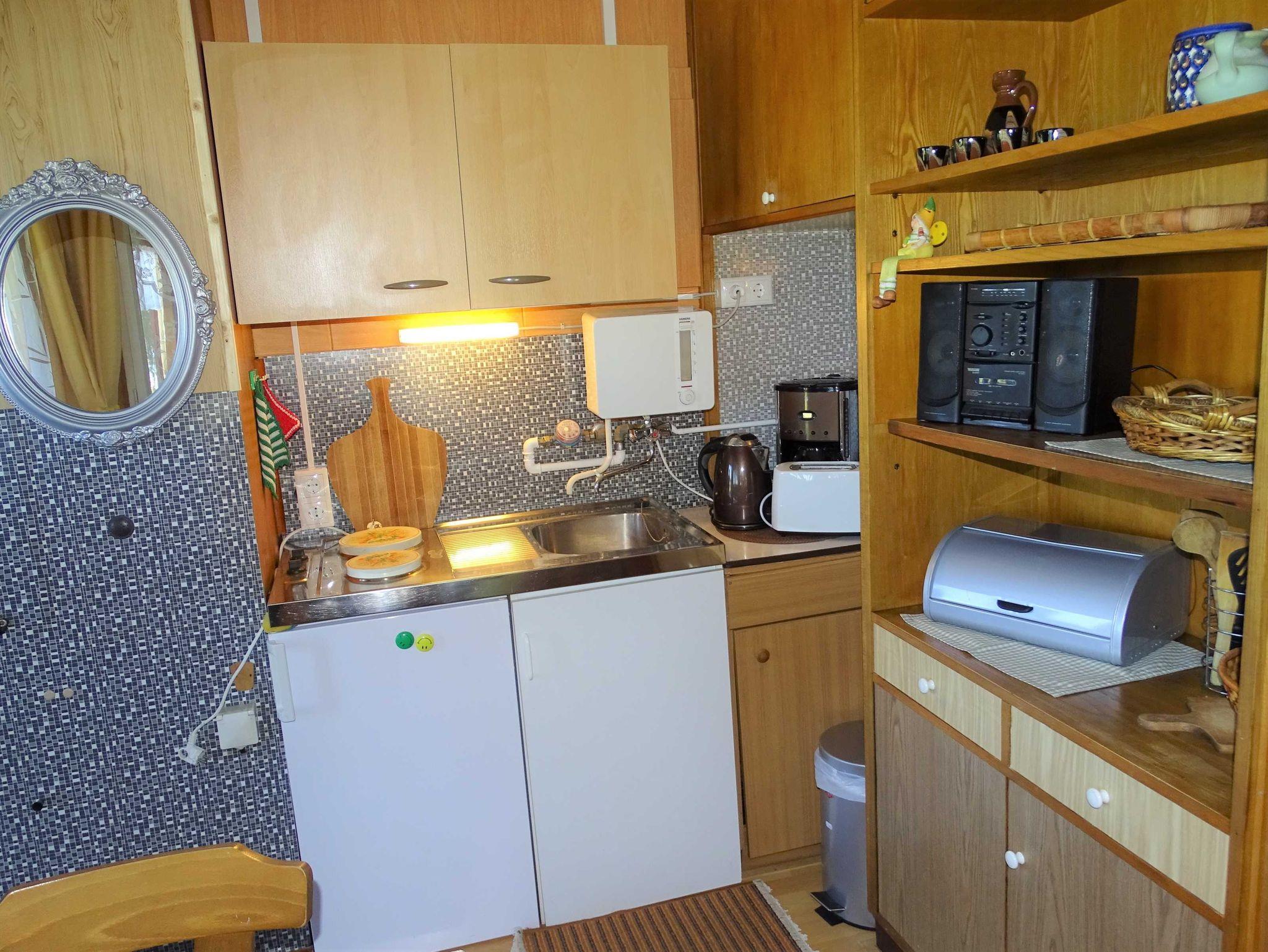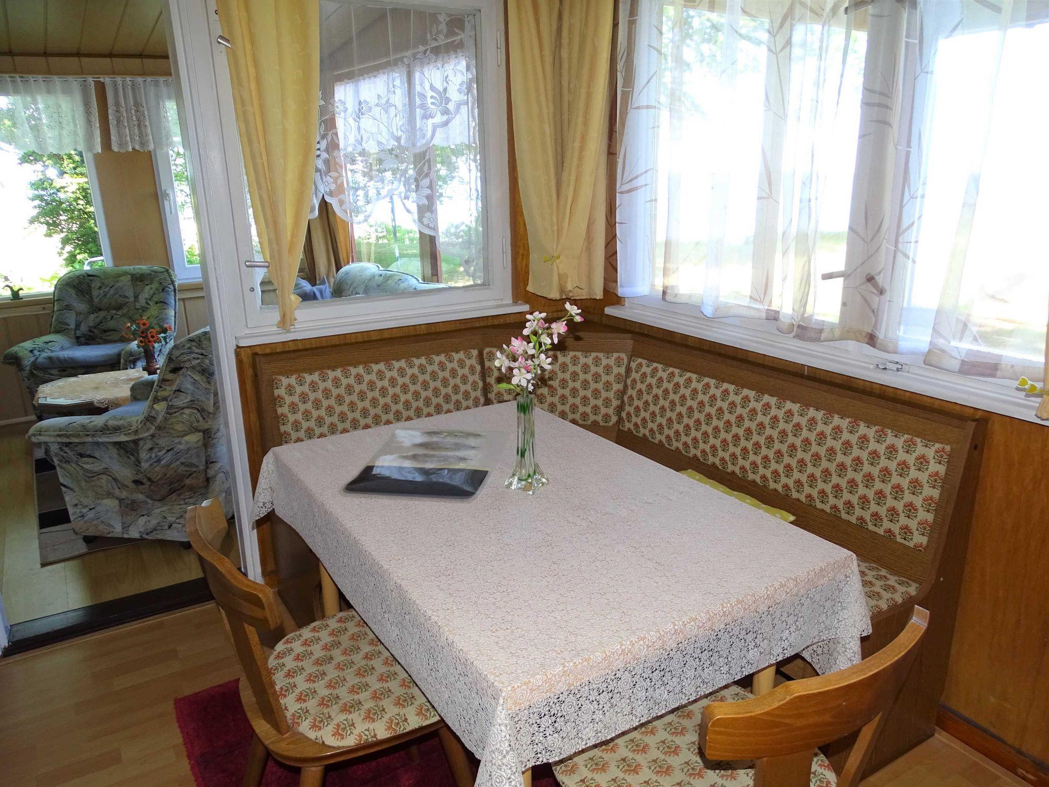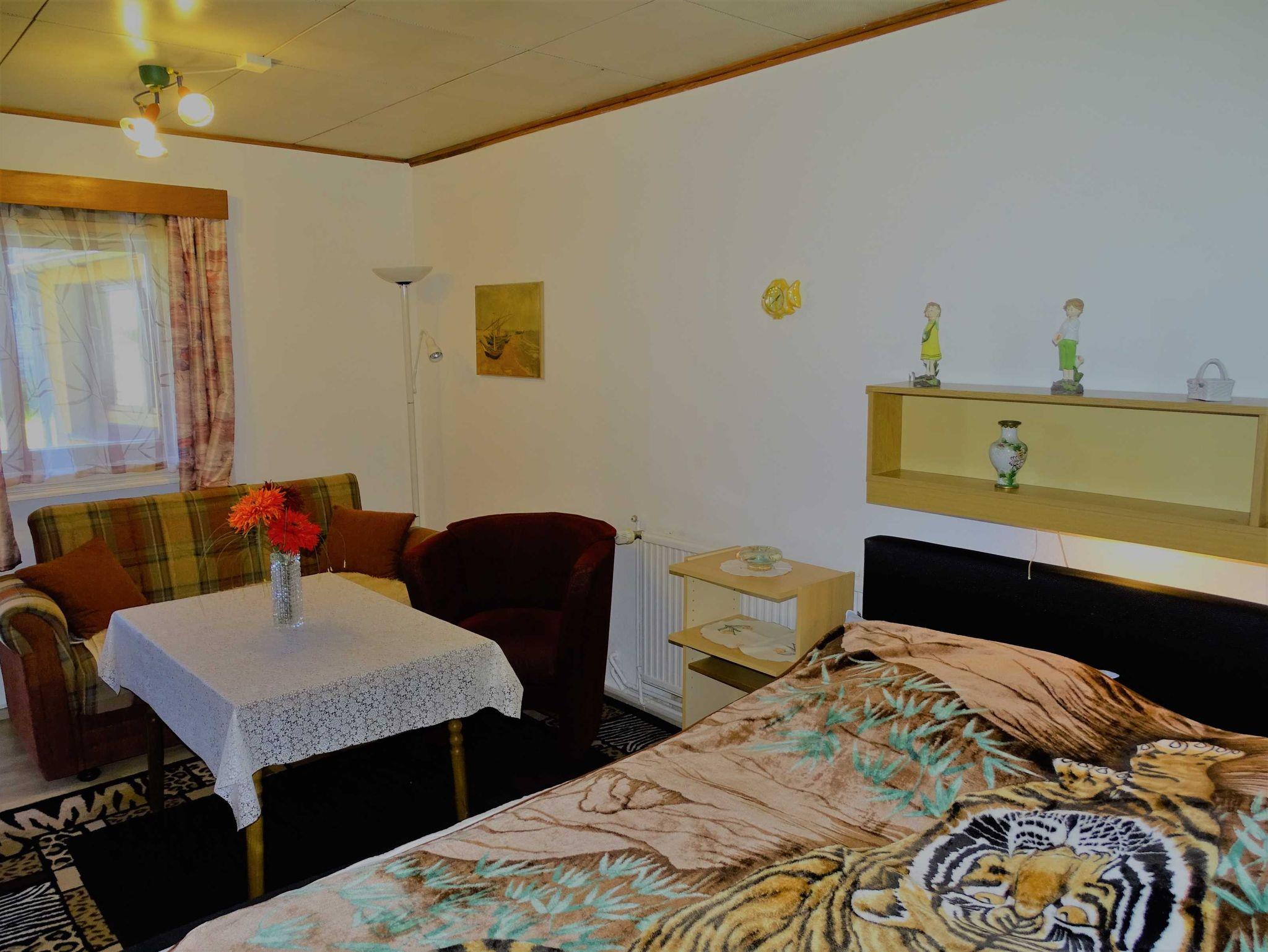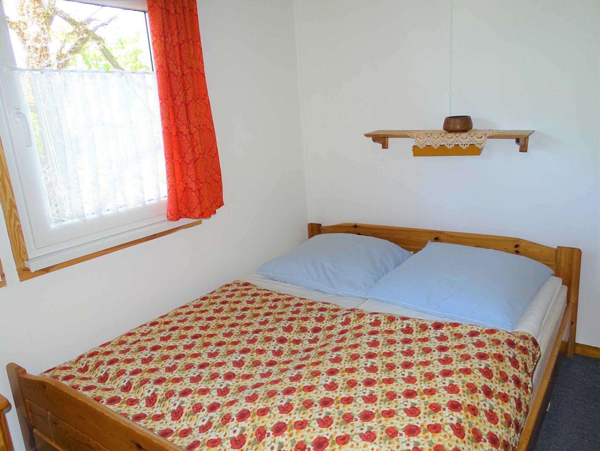 In der Küche befindet sich eine Miniküche und eine Sitzgruppe. Von hier aus gelangen Sie in das Schlafzimmer mit Doppelbett oder ins Wohnzimmer mit Couch, Sesseln und Fernseher. Das Bad ist mit einer ebenerdigen Dusche und WC ausgestattet. Ein separates Zimmer mit Doppelbett, Couchecke, Waschgelegenheit und einem kleinen WC gehört zum Ferienhaus dazu.
