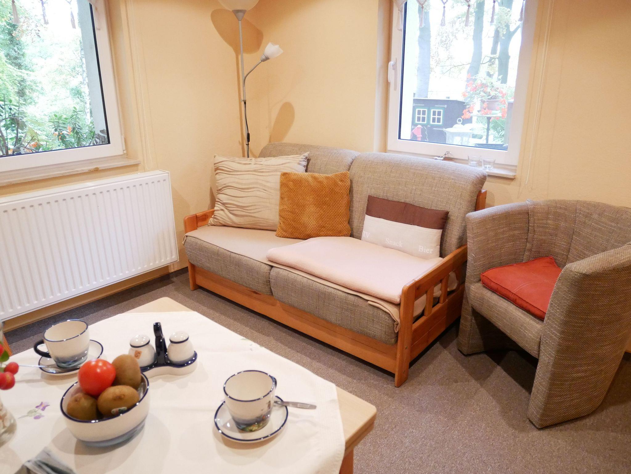 Die gemütliche und modern eingerichtete Ferienwohnung befindet sich im Erdgeschoss. Sie verfügt über ein Schlafzimmer mit 2 getrennten Boxspringbetten und einem Kleiderschrank. Im Wohnzimmer gibt es eine Couch (ausziehbar 140 x 200) mit Tisch, TV, Radio mit CD-Player und einen Essplatz mit 2 Stühlen. Im Dielenbereich befindet sich ein Pantry-Küche mit 2 Platten Herd und Kühlschrank mit Gefrierfach, sowie ein Minibackofen. Ein großes Tageslichtbad mit Dusche/WC und Fön. Eine Sitzecke im Garten, neben der Ferienwohnung lädt zum Verweilen ein. Ein Parkplatz steht kostenfrei auf dem Grundstück zur Verfügung. Nebenkosten inklusive. Bettwäsche kann mitgebracht werden oder gegen Gebühr dazugebucht werden. Bei Anreise liegt eine Erstausstattung Seife, Toilettenpapier, Spülmittel und ein Geschirrhandtuch für Sie bereit.