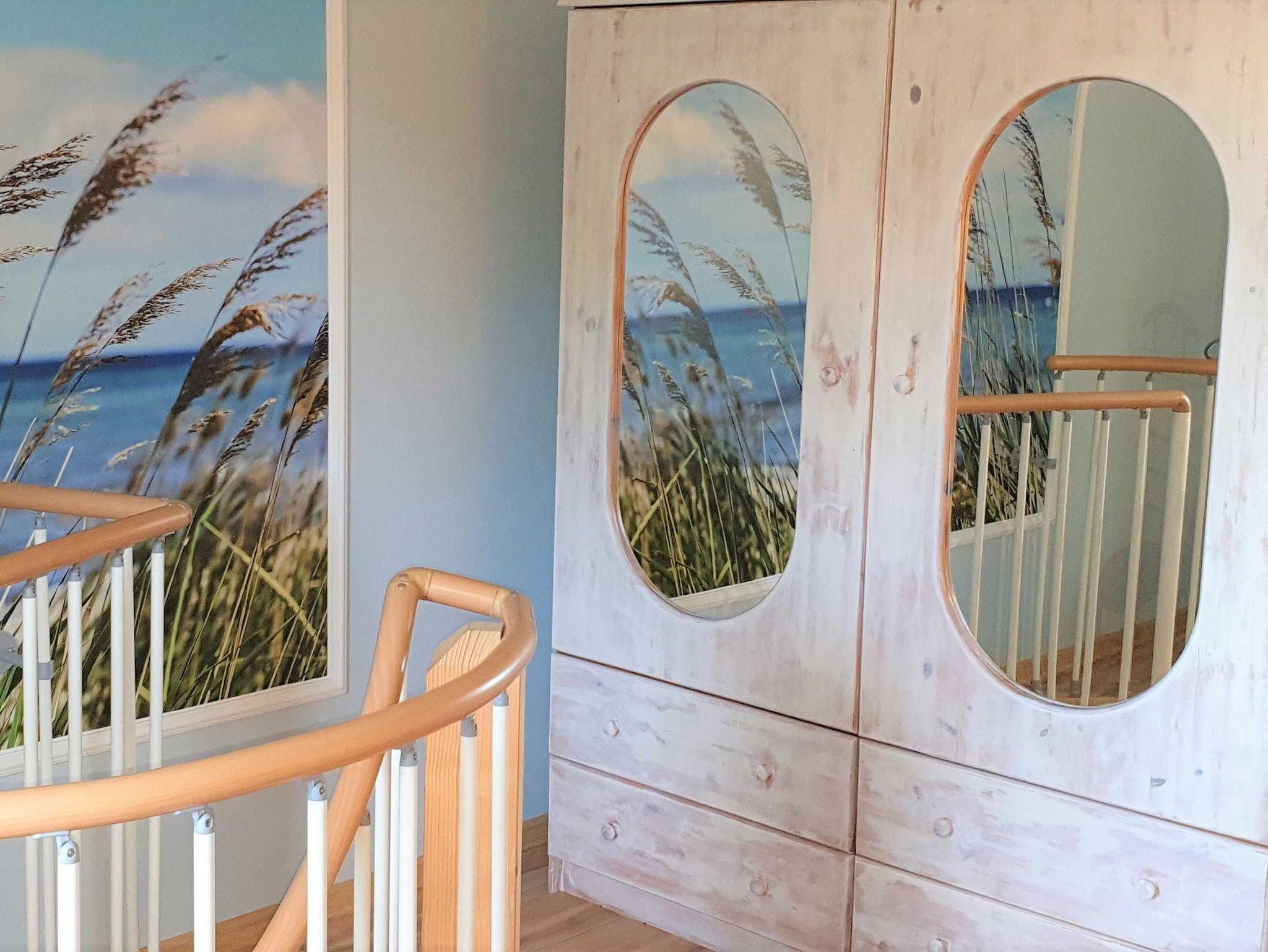 Im Erdgeschoss befinden sich: 1 Schlafzimmer mit Etagenbett, 1 Wohnzimmer mit integrierter Küchenzeile, (komplett mit Toaster, Kaffemaschine und Geschirr), Bad mit bodengleicher Dusche und ein WC. Das zweite Schlafzimmer mit Doppelbett ist über eine Wendeltreppe zu erreichen.