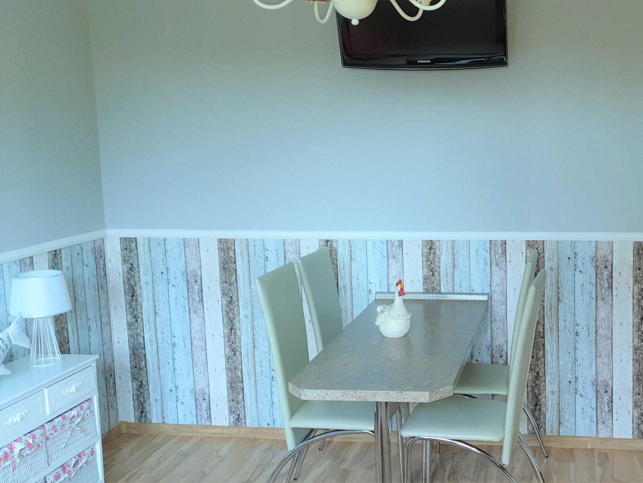 Die Ferienwohnung in der Doppelhaushälfte erstreckt sich über zwei Etagen. Im Erdgeschoss befinden sich das Wohnzimmer mit integrierter Küche (Zwei-Platten-E-Kocher, Kühlschrank, Kaffeemaschine, Toaster, Geschirr etc.), das Bad mit Dusche und WC sowie ein Schlafzimmer mit Etagenbett. Im Frühjahr 2024 wurde die Wohnung noch einmal renoviert.