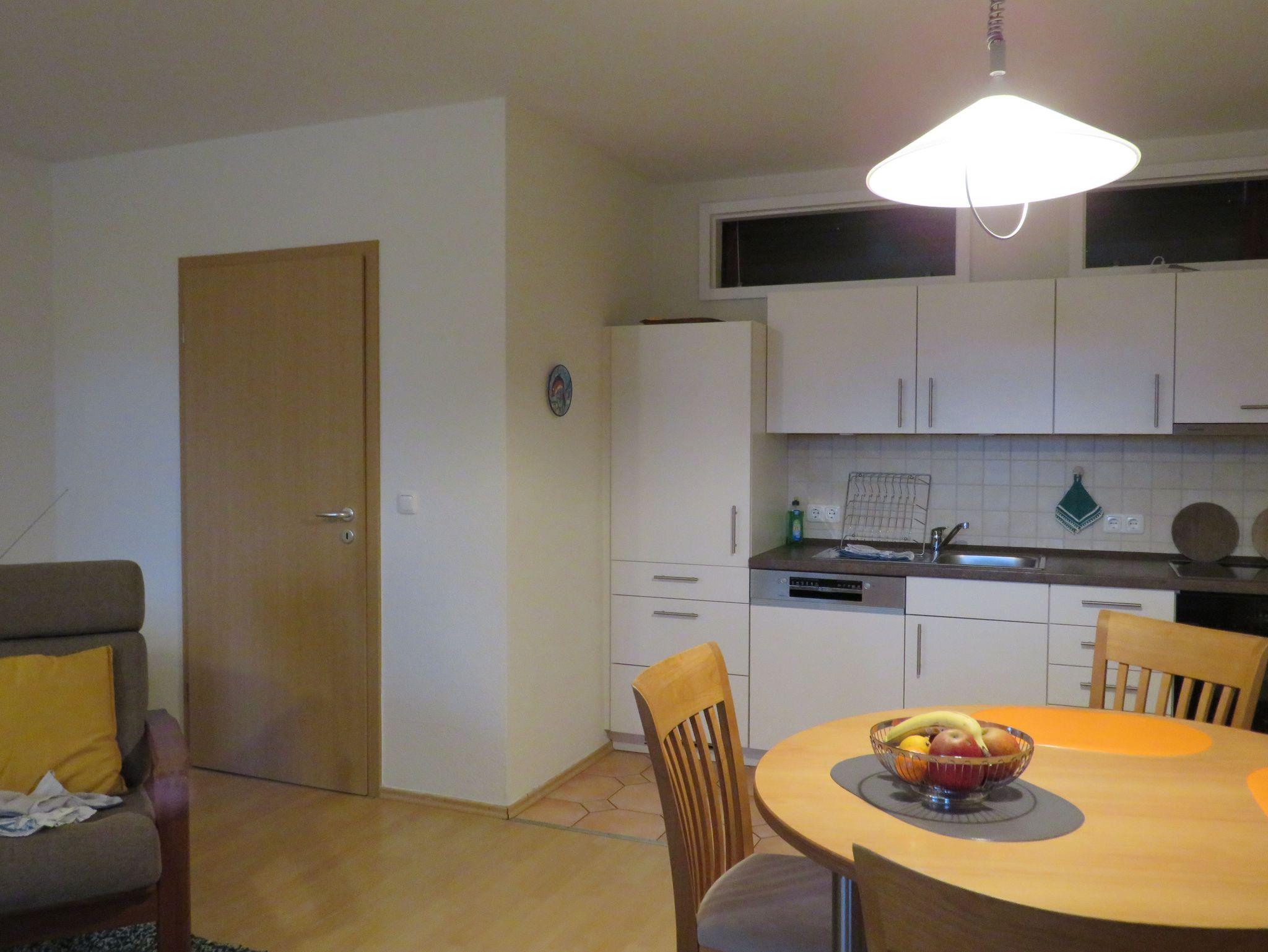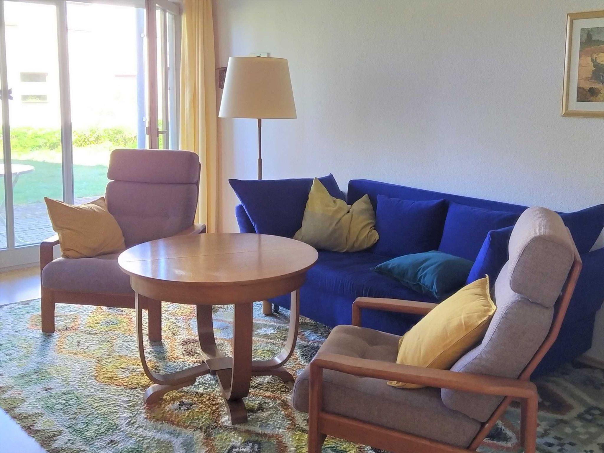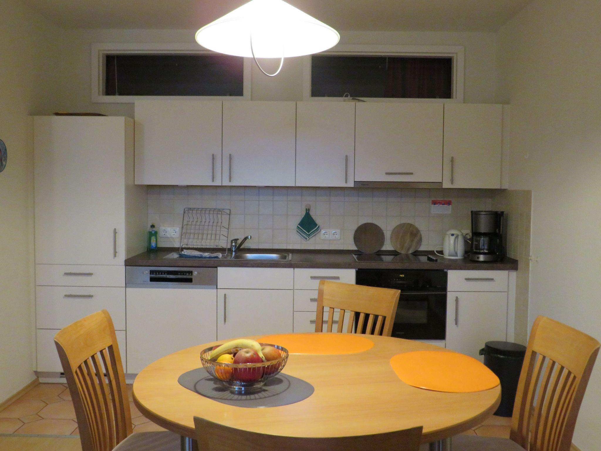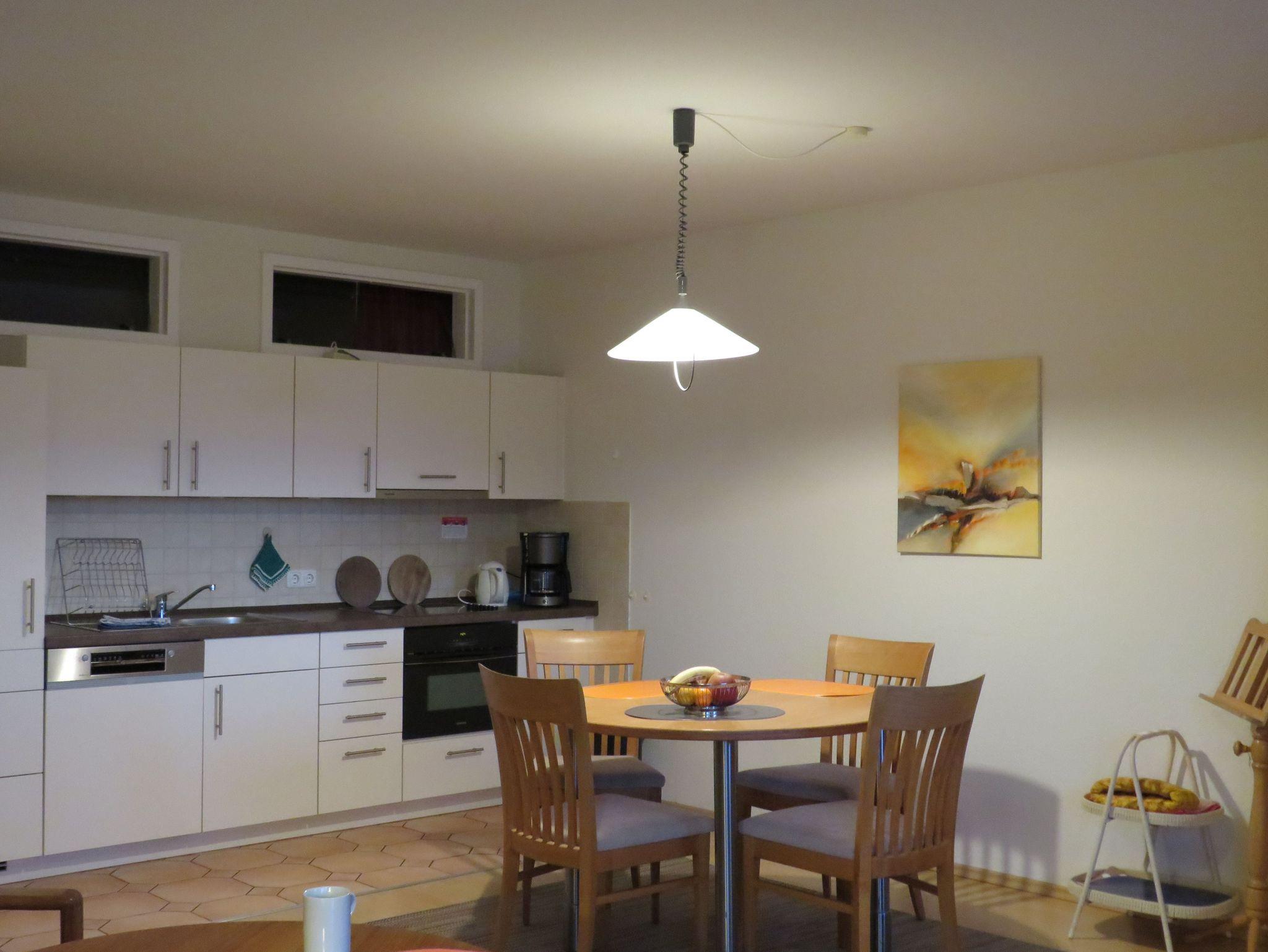 Die gemütliche Ferienwohnung besteht aus einem großen hellen Wohn-Essraum mit einer offenen Küchenzeile (insgesamt ca. 30 m²) und zwei Schlafzimmern. Das größere der Schlafzimmer (ca. 14 m²) ist mit einem Doppelbett und großzügiger Schrankfläche ausgestattet, im 2. Schlafzimmer (ca. 10 m²) stehen zwei Einzelbetten sowie ein Kleiderschrank zur Verfügung. Das 2. Schlafzimmer wird belichtet und belüftet durch Oberlichter über der Küchenzeile im Wohnzimmer. Das Wohnzimmer ist möbliert mit einem Schlafsofa, zwei Sesseln, einer Schrankwand mit Fernseher, in dem sich Bücher, Spiele, Geschirr sowie Karten über die Insel befinden, und einem Esstisch mit 4 Stühlen. Außerdem gibt es ein E-Piano zum Musizieren. Im Duschbad (ca. 6 m²) befindet sich ein Wäscheständer zum Trocknen, außerdem im Badezimmerschrank ein Fön für die Gäste. Die Küchenzeile ist mit Ceranfeld, Backofen mit Mikrowellenfunktion, Kaffeemaschine, Heißwasserkocher, Toaster, Kühlschrank mit Gefrierfach und Spülmaschine ausgestattet.