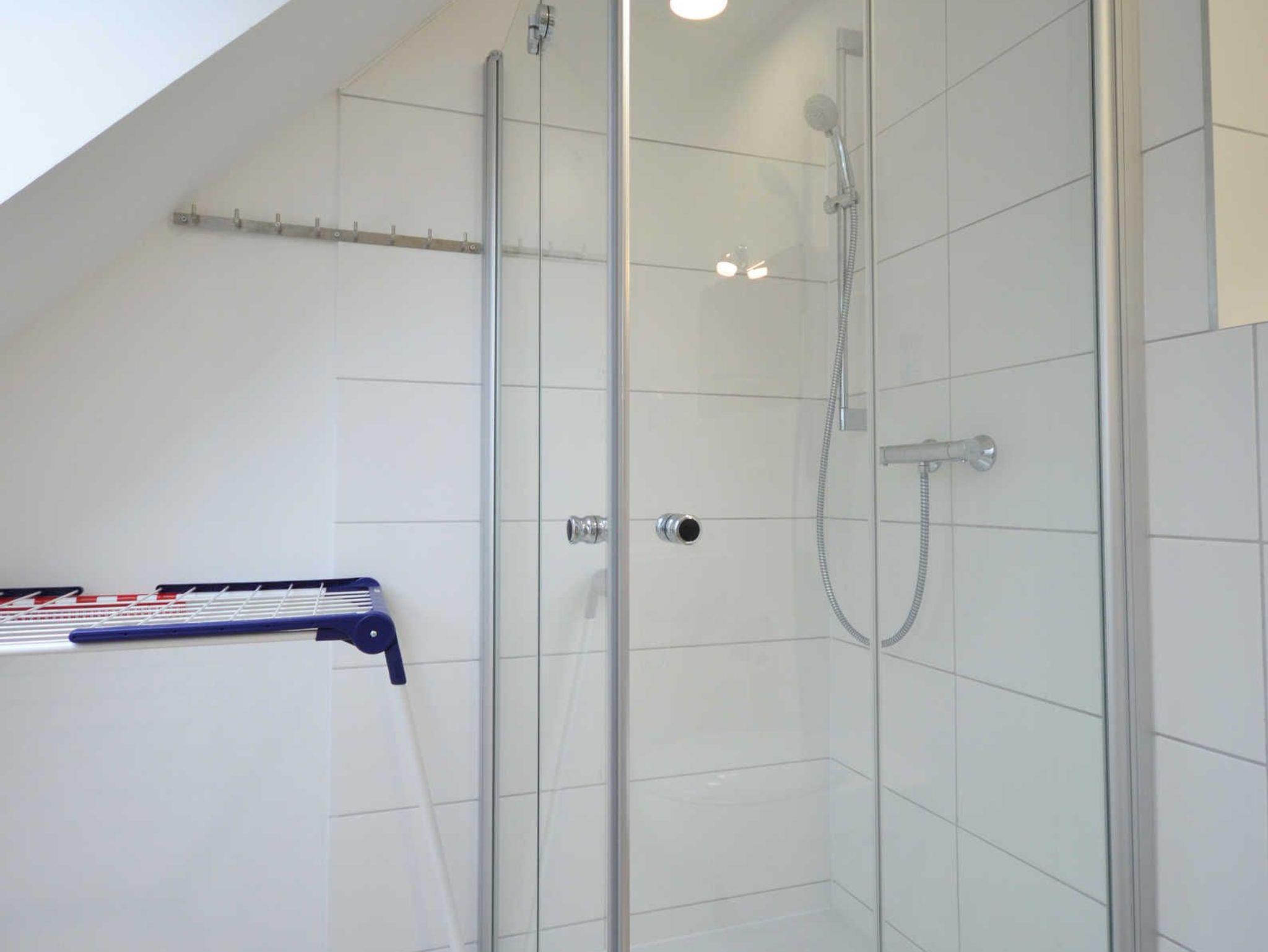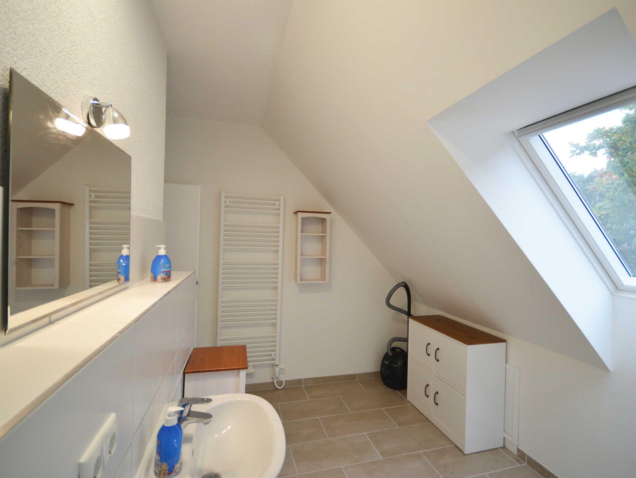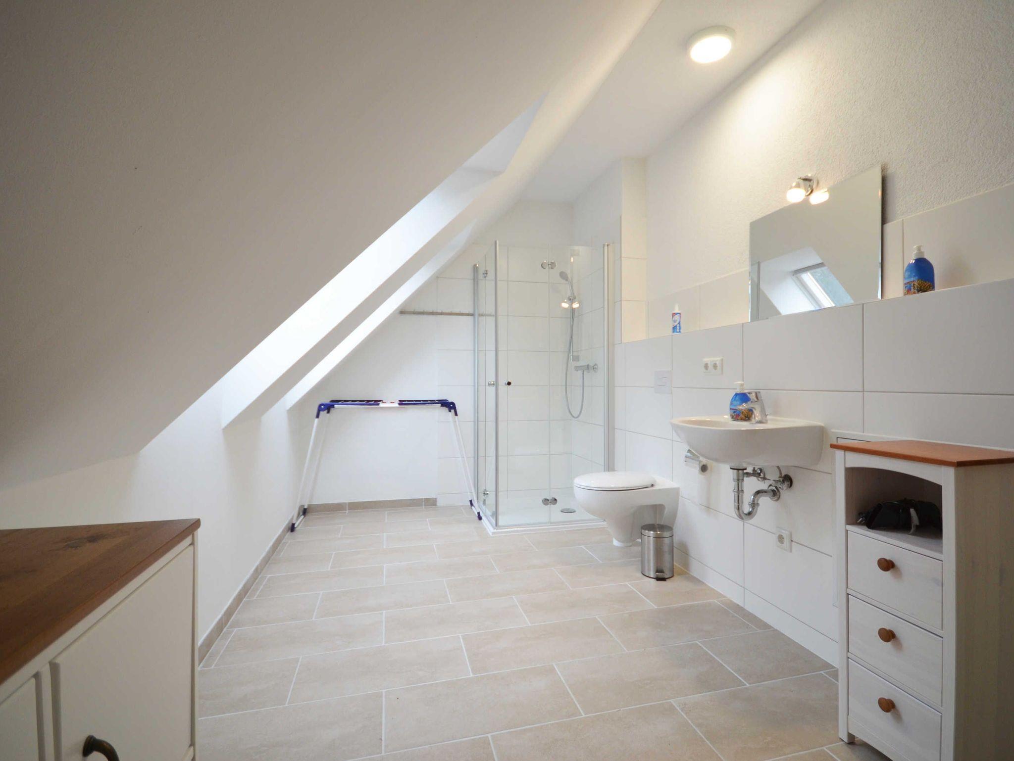 • Im Bad (1. Etage) befindet sich die Dusche, Waschbecken, Toilette und ein Handtuchheizkörper.