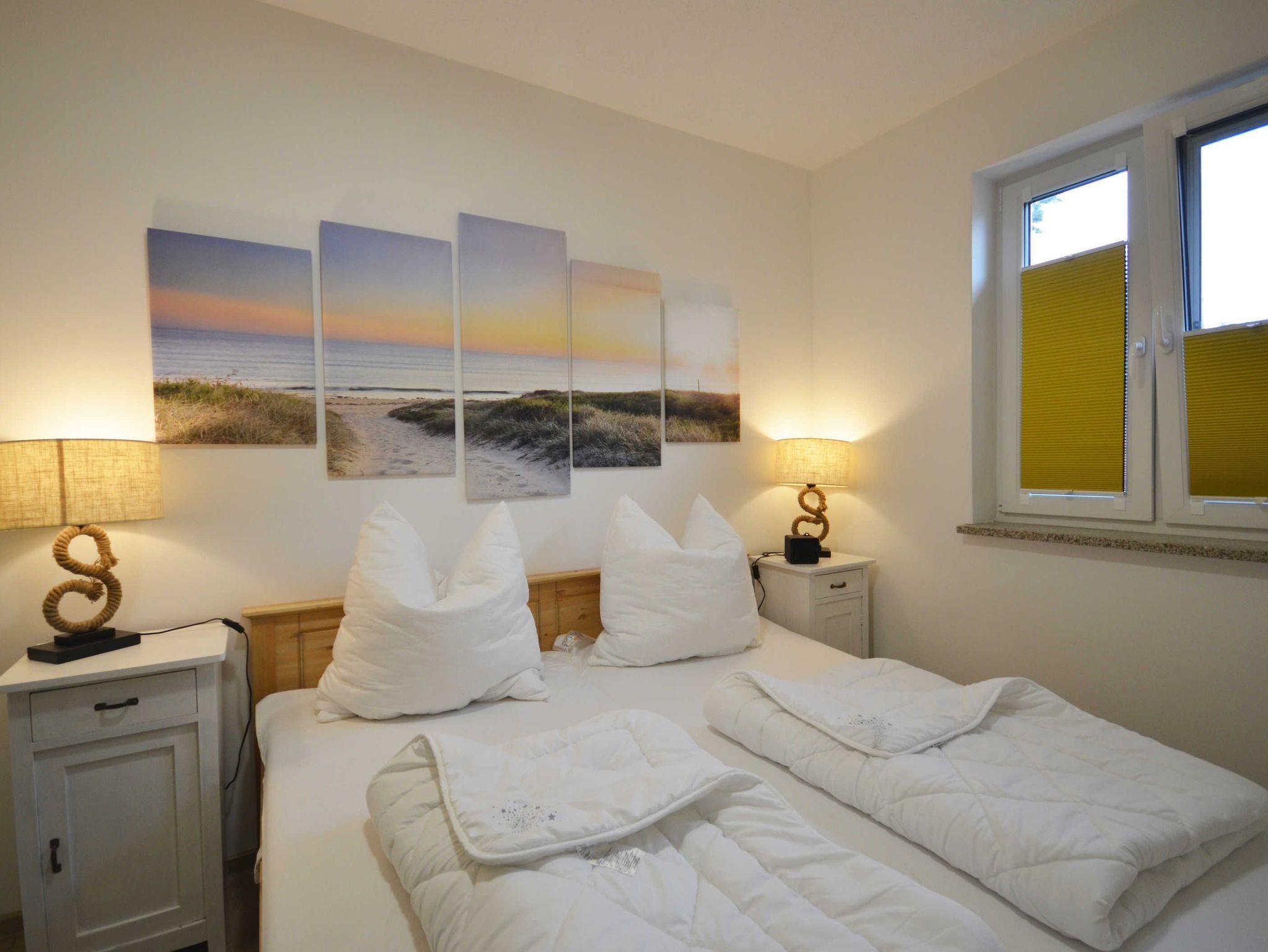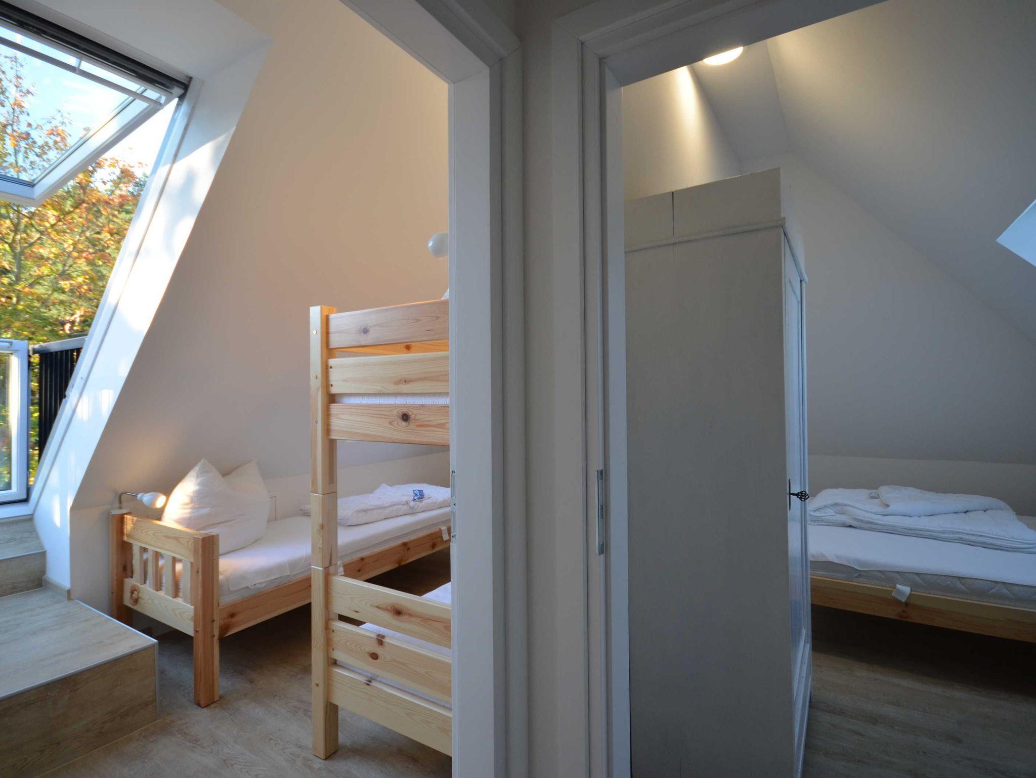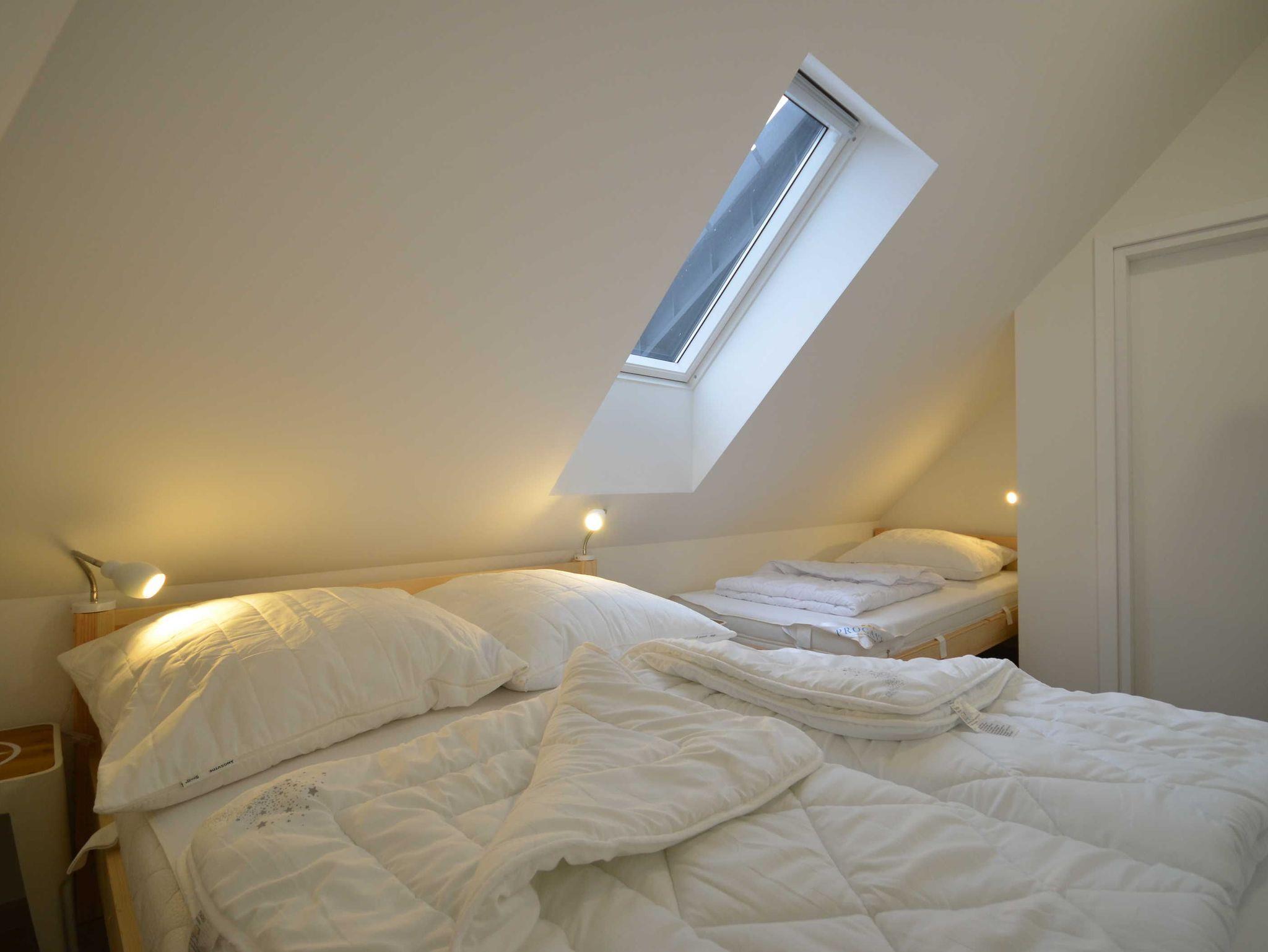 • Schlafzimmer 3 in der Fewo 3 ist mit einem Doppelbett und einem Einzelbett und in der Fewo 4 mit 3 Einzelbetten ausgestattet, wo jeweils 3 Personen Platz finden. Fliegengitter und Verdunkelungsrollo.