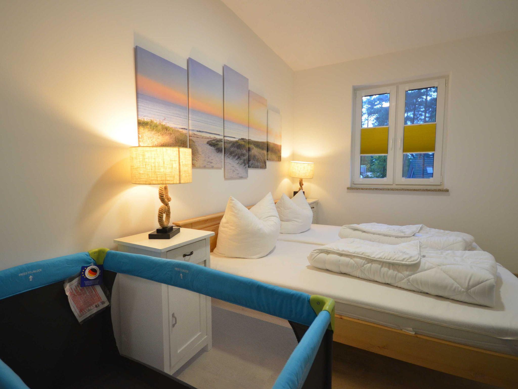 • Schlafzimmer 1 ist mit einem Doppelbett mit einer Größe von 180 x 200 cm in dem auch ein bereits vorhandenes Babybett Platz findet. Fliegengitter und Verdunkelungsplissee.