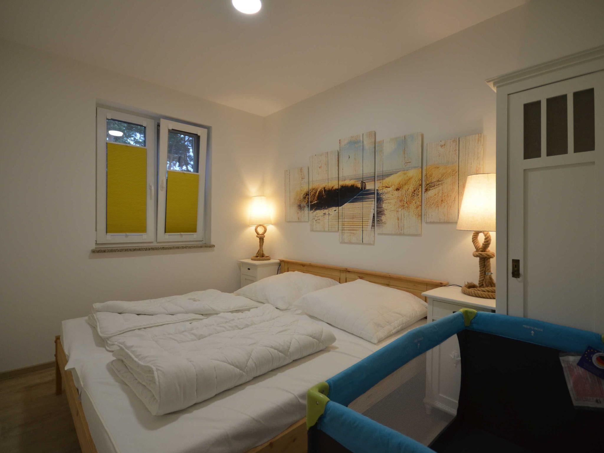 • Schlafzimmer 1 ist mit einem Doppelbett aus Massivholz mit einer Größe von 180x200cm in dem auch ein bereits vorhandenes Babybett Platz findet.