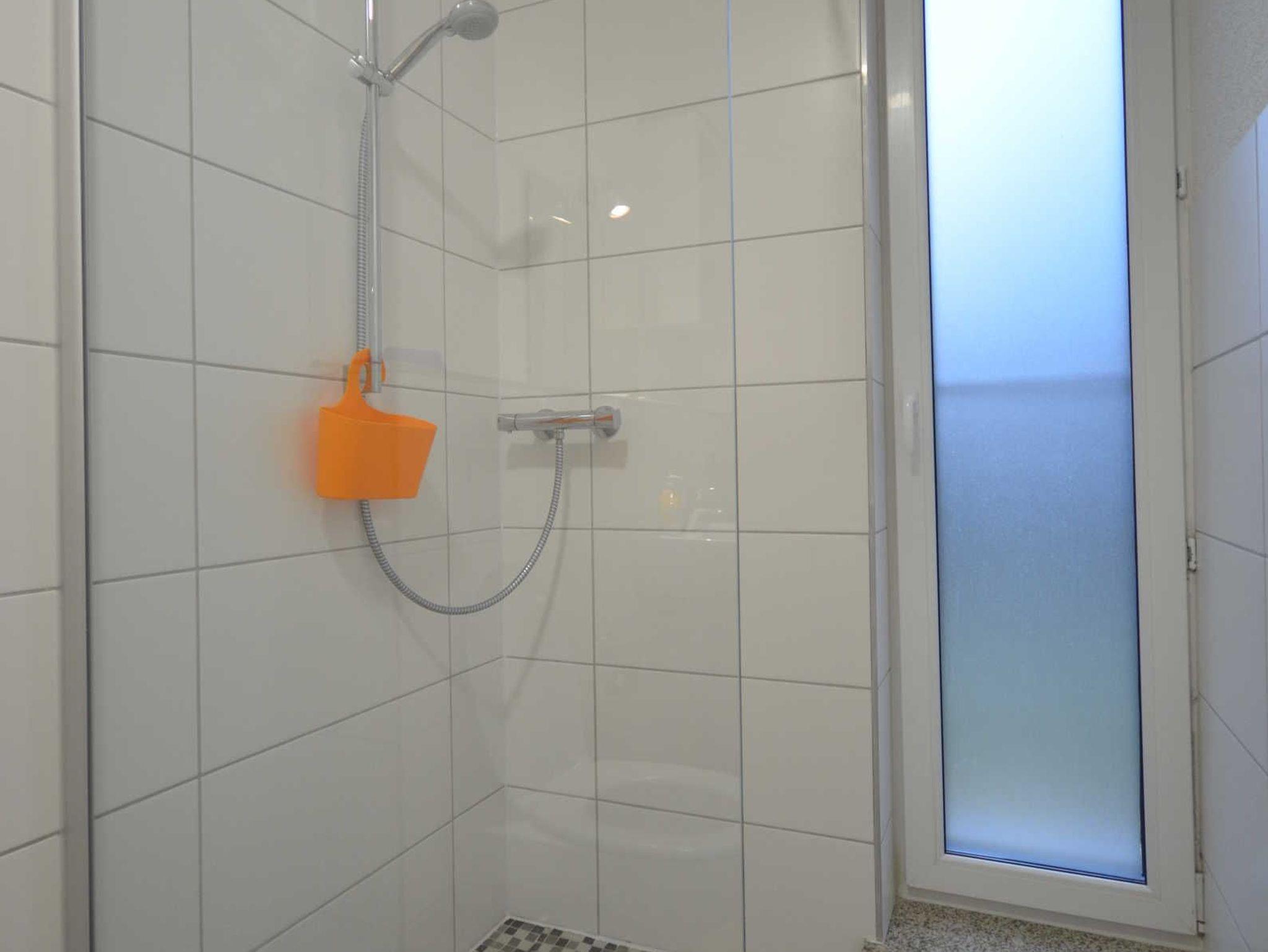 • Im Bad befindet sich die ebenerdige Dusche, Waschbecken, Toilette und ein Handtuchheizkörper.
