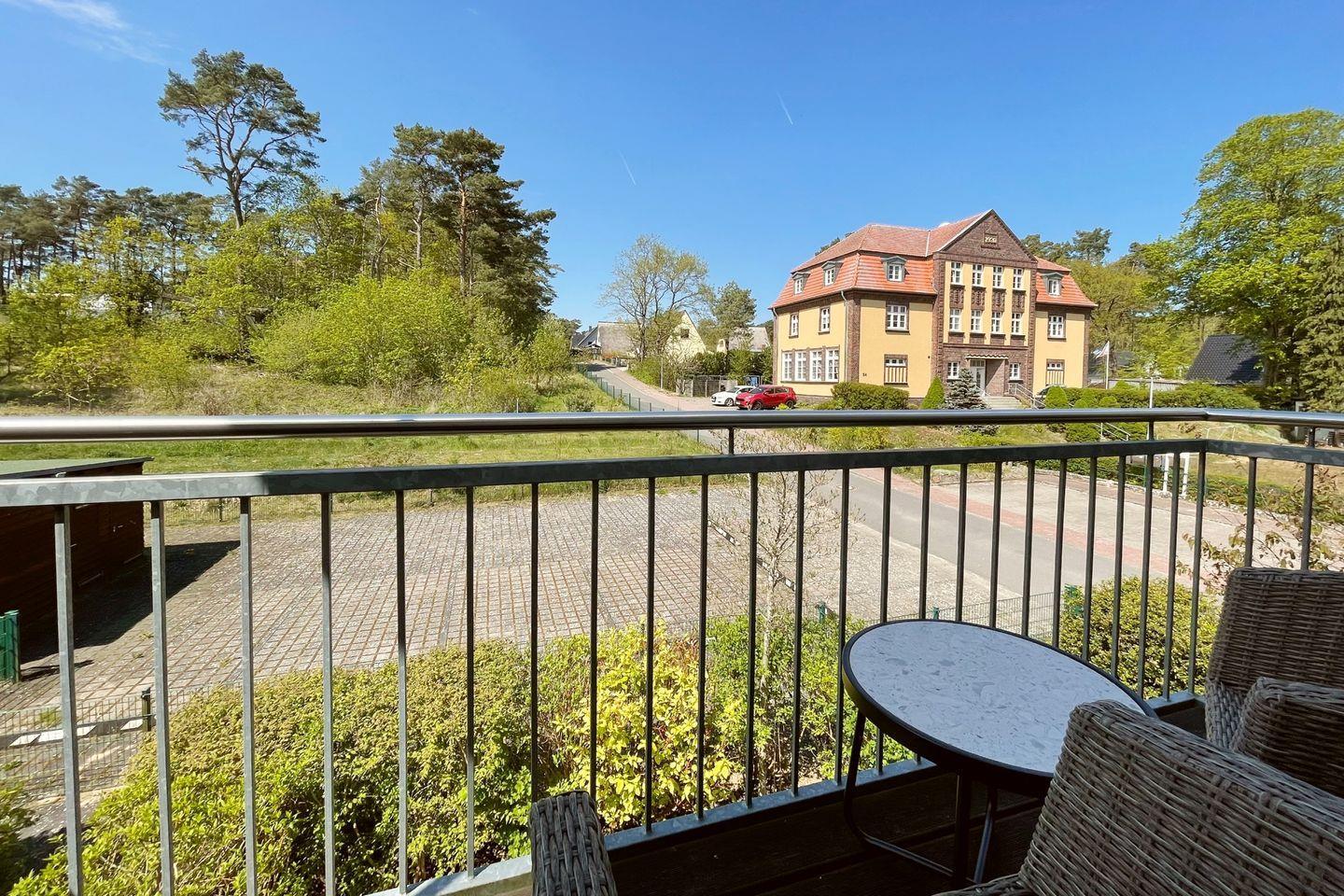 Ein nach Westen zum Garten gelegener Balkon bietet den Blick ins Grüne. Die Wohnung liegt im ersten Obergeschoß und wird durch den Eingang von der Strandstraße über eine Treppe erreicht. Am Eingang befindet sich eine abgeschlossene Garderobe.
