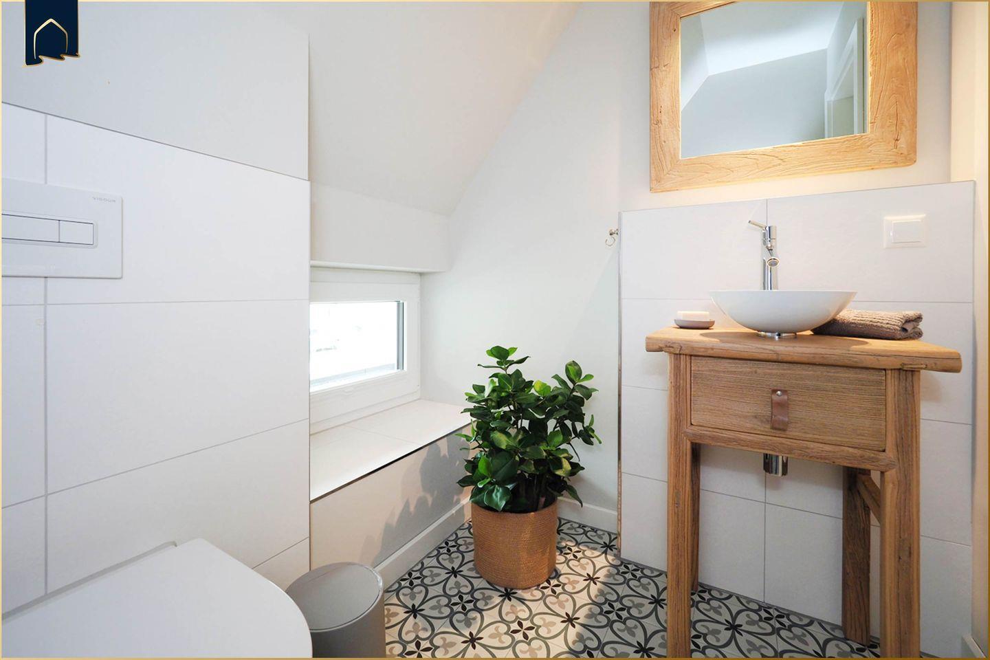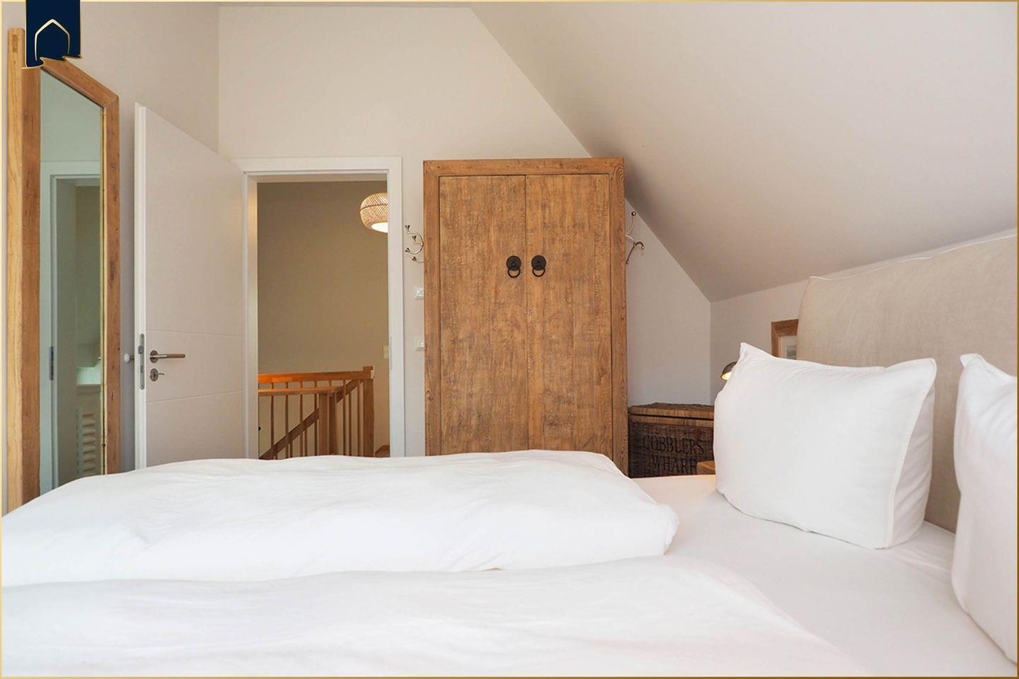 Zwei moderne Badezimmer mit bodengleichen Walk-in-Duschen, eines davon mit Doppelwaschtisch und eigener Sauna, sowie ein zusätzliches Gäste-WC sorgen für den gewissen Luxus. Für den Alltag ist ebenfalls gesorgt: Waschmaschine, WLAN und zwei Parkplätze direkt am Haus stehen Ihnen zur Verfügung.