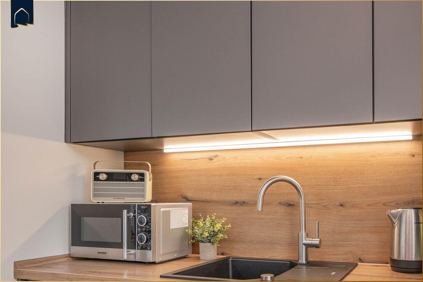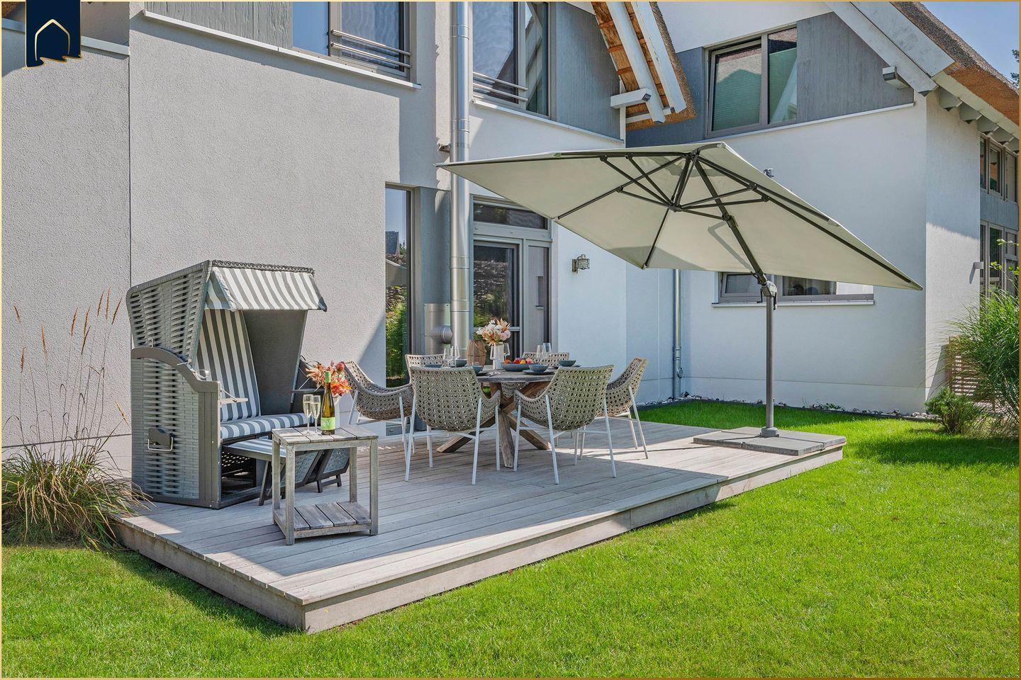 In dem lichtdurchfluteten Wohn- und Essbereich mit offenem Kamin, gemütlicher Sofalandschaft und direktem Zugang zur großen Holzterrasse mit Garten fühlt man sich sofort wohl. Die offene Designküche ist voll ausgestattet und lädt zum gemeinsamen Kochen und Genießen ein – ob schnelles Frühstück oder ausgedehntes Dinner. Draußen erwarten Sie Loungemöbel, ein Strandkorb und ein Elektrogrill – perfekt für entspannte Abende in der Sonne oder unter den Sternen.
