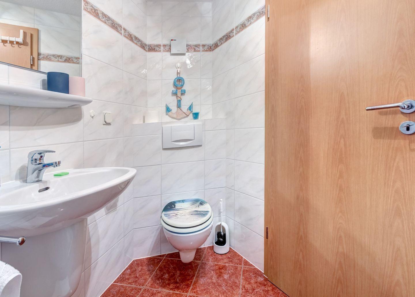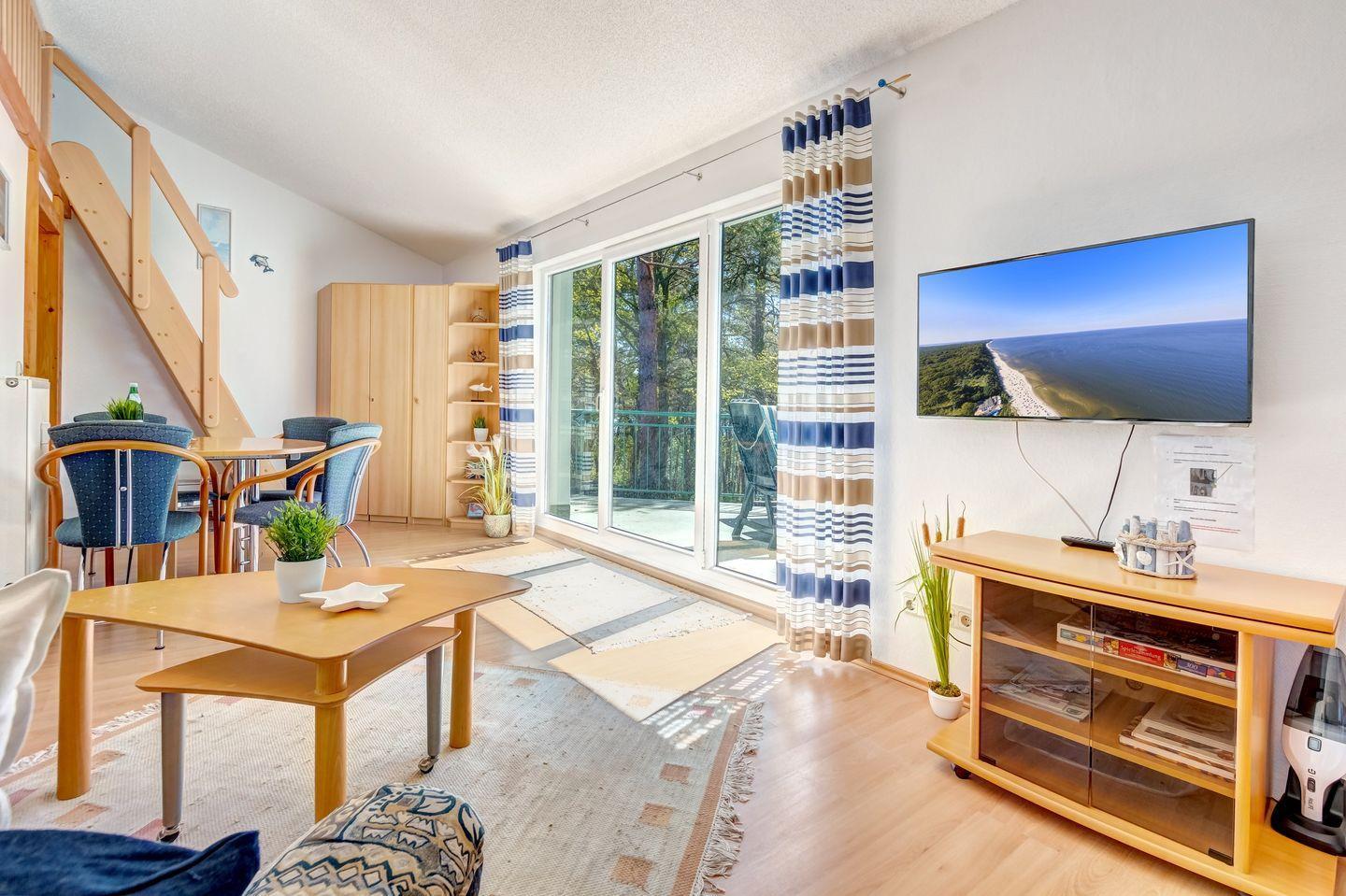 Die Ferienwohnung Krabbengalerie bietet einen großen Südbalkon mit Gartenmöbeln und seitlichem Blick auf das Achterwasser. Die gemütlich eingerichtete Wohnung im Obergeschoss hat sichtbare Holzbalken und eine Galerie mit Schlafmöglichkeiten für abenteuerlustige Kinder (keine Stehhöhe). Der Wohn-/Schlafraum verfügt über ein Doppelbett, eine ausziehbare Couch und einen Essplatz mit Balkonzugang. Die gut ausgestattete Küche ist ideal für Selbstversorger, und das Bad bietet eine Waschmaschine.