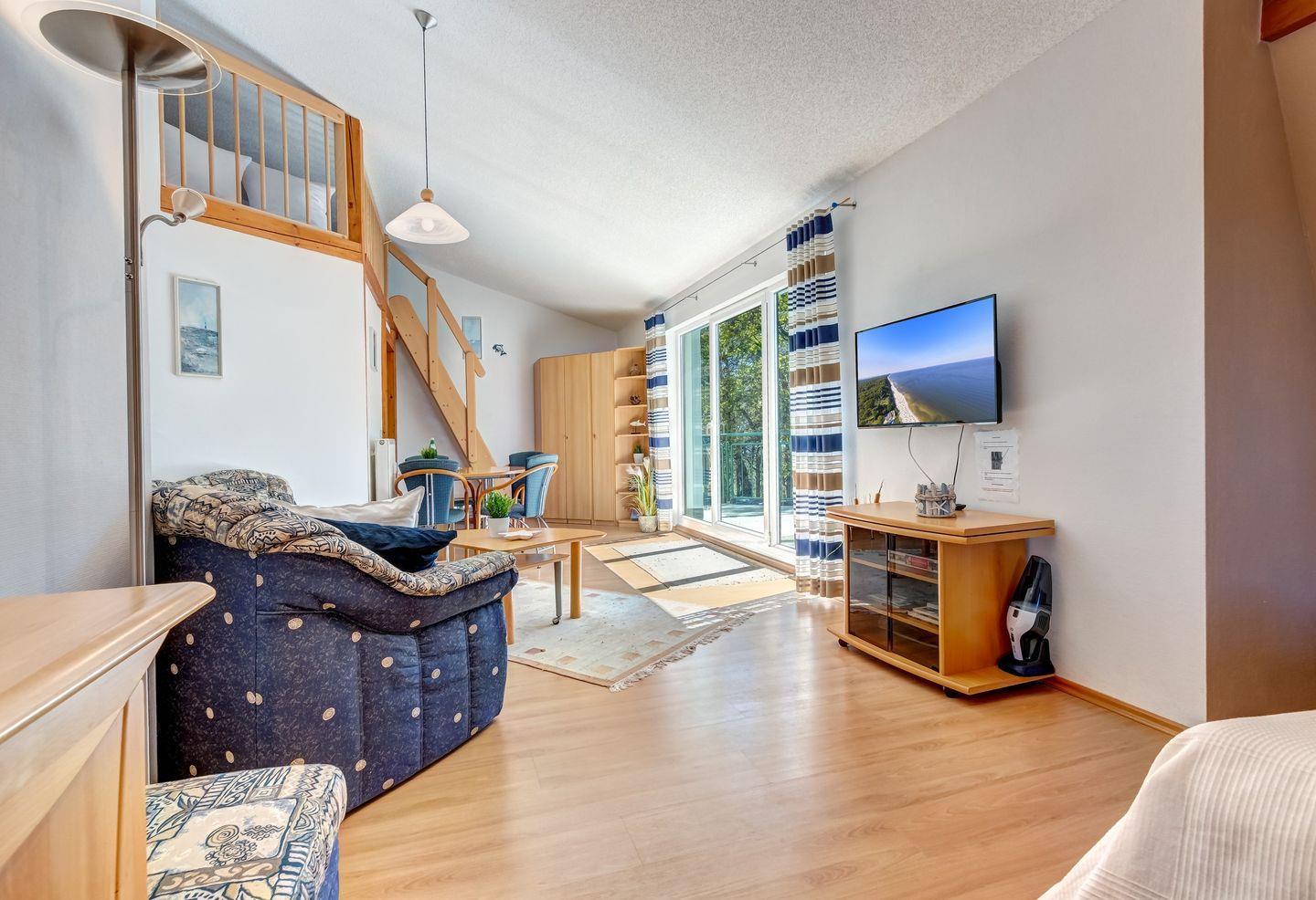 Im Wohn-/Schlafraum erwarten Sie ein Doppelbett, eine ausziehbare Couch und ein Essplatz mit Balkonzugang. Die Südausrichtung sorgt für eine helle Atmosphäre.