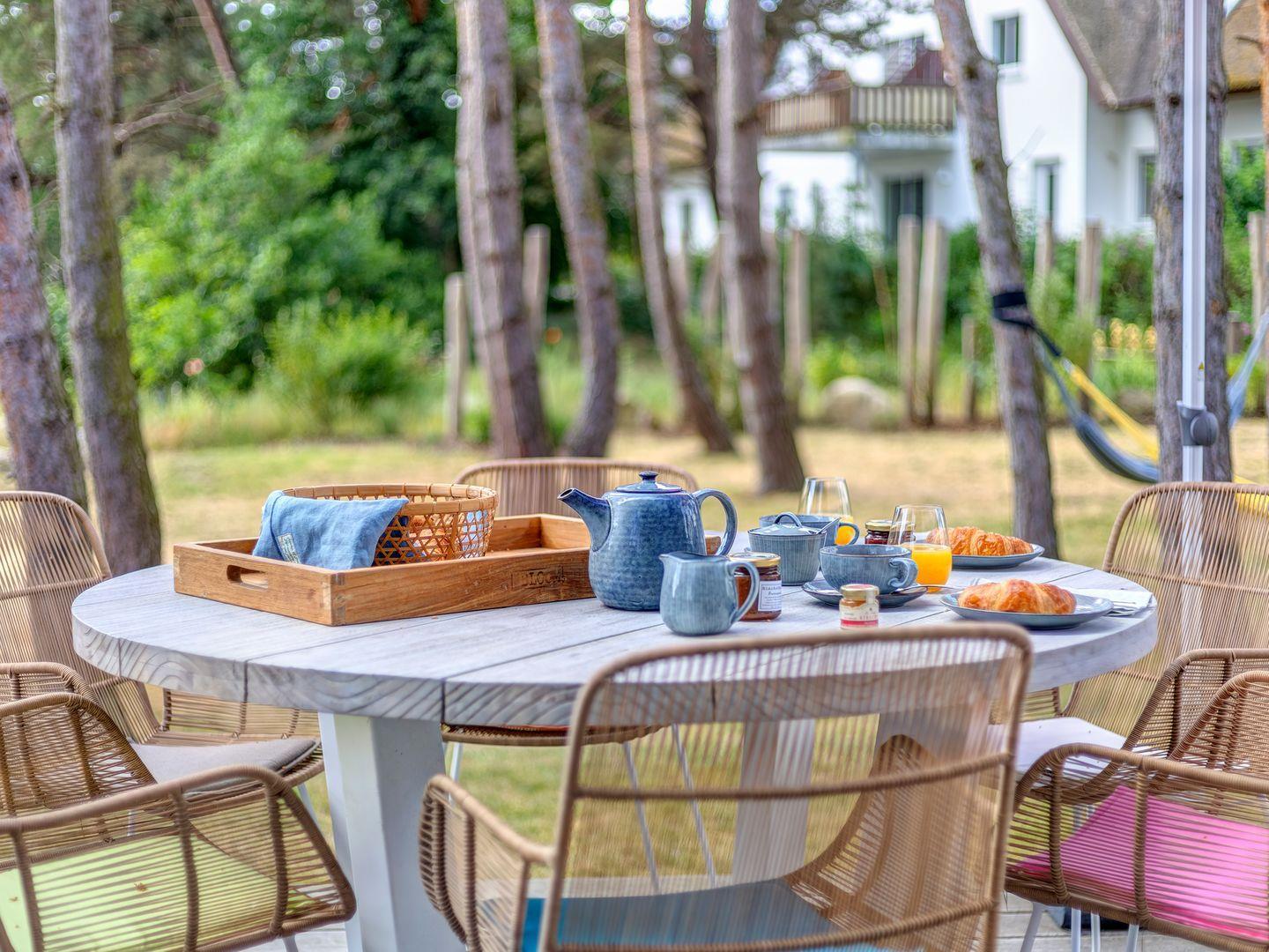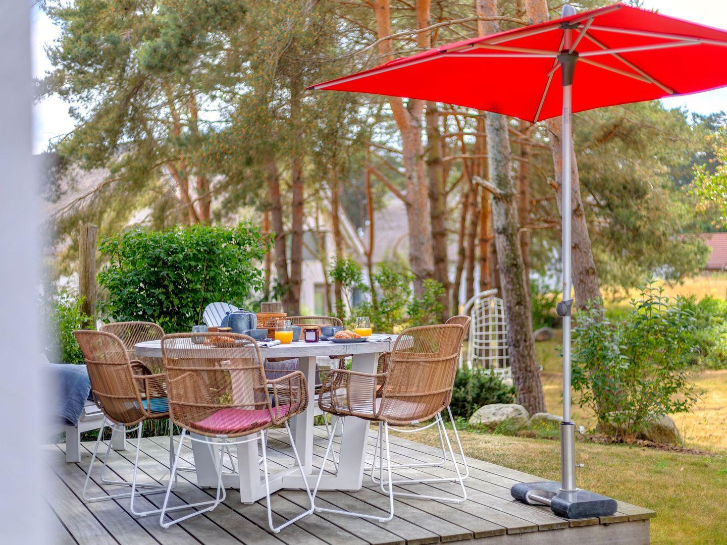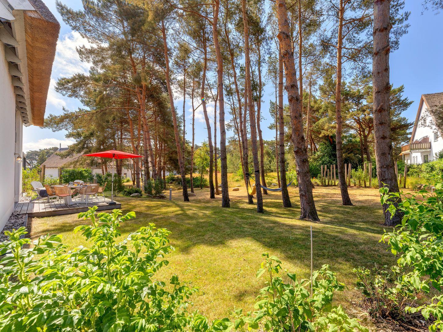 Sommergäste können den Garten von der Holzterrasse aus mit 6 Sitzplätzen um den Teakholztisch zum Frühstück oder beim abendlichen Grillen genießen oder in den 2 vorhandenen Hängematten in der lichten Sonne ihre Seele im Kiefernwäldchen baumeln lassen. Im hinteren Bereich unter einem lauschigen Kieferndach lädt eine Gartenbank zu einem Kaffeepäuschen ein.
