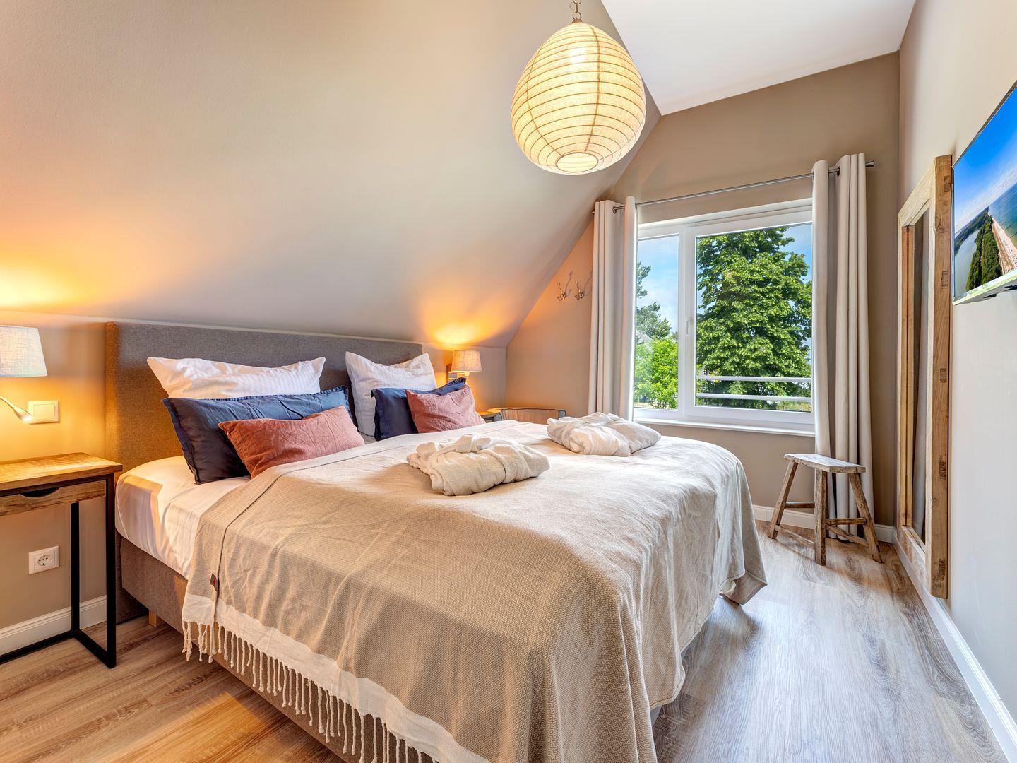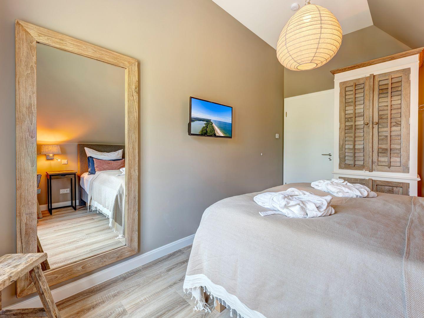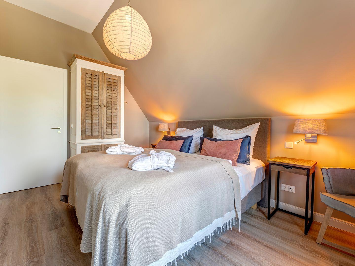 Zwei Schlafzimmer mit Doppelbetten im Obergeschoss und ein Schlafzimmer im Erdgeschoss mit zwei Einzelbetten lassen einen himmlisch schlafen auf Treca-Paris Boxspring Betten (französische Betten-Manufaktur). Auch alle Schlafzimmer sind mit Flatscreenbildschirm mit Sat-TV und Smartfunktion ausgestattet.
