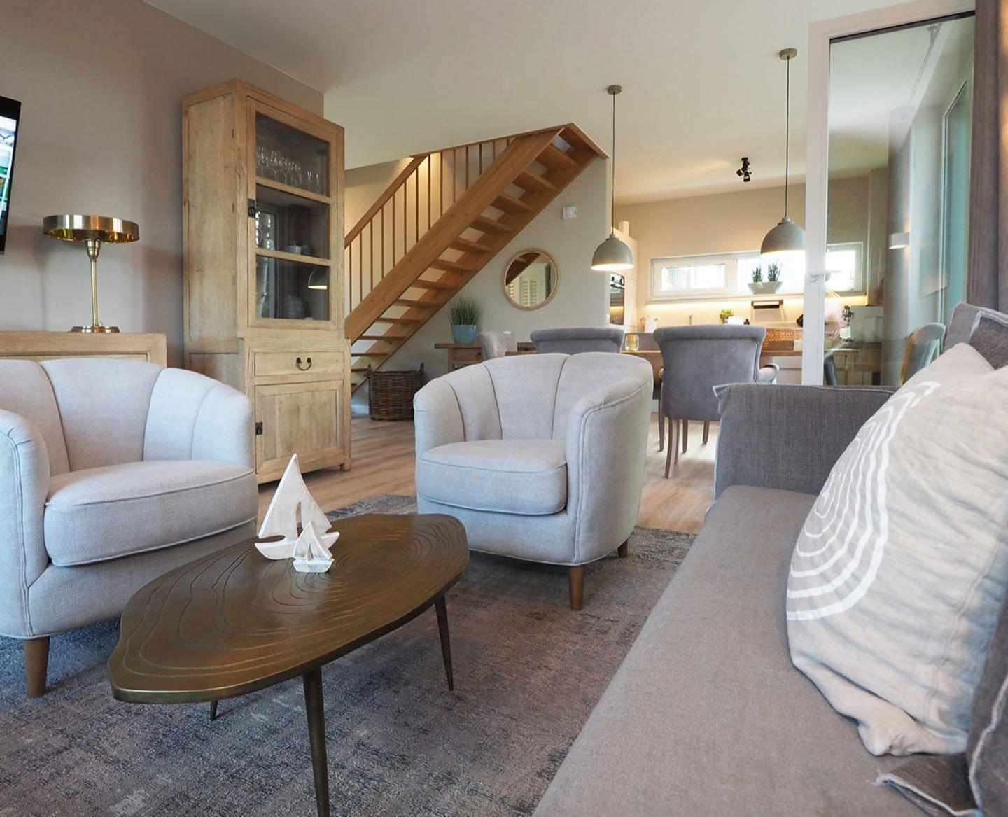 Im Wohnzimmer mit seiner gehobenen Ausstattung aus Naturholzmöbel und einladender bequemer Sitzgruppe kann man entspannte Momente allein mit einer Zeitung und auch mit Freunden und Familie in gemütlicher Runde genießen.