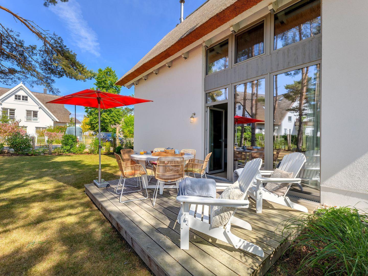 Freuen Sie sich auf ca. 135 qm Wohnfla¨che mit hochwertiger Ausstattung, 700 qm Grundstu¨ck mit kleinem Kiefernwa¨ldchen, 3 Schlafzimmer, 2 Badezimmer und 3 WC, WLAN, eigene Ladestation für Ihr E-Auto, Kaminofen, Sauna, Grill, Garten und Terrasse; Entfernung zum Sandstrand ca. 2 km, Achterwasser ca. 400 m, 2 Restaurants in ca. 800 m.