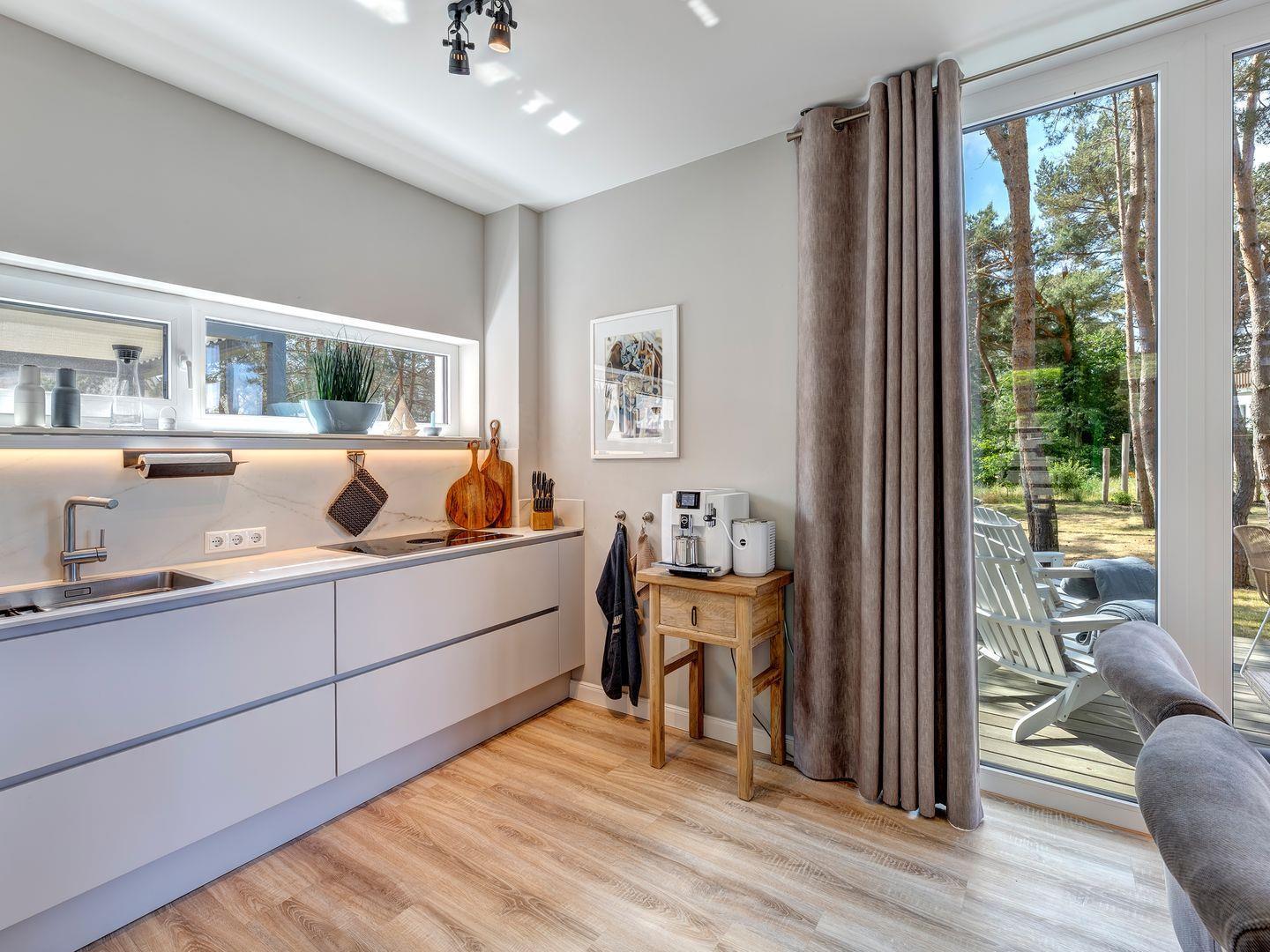 Die moderne Küche mit hochwertiger Geräteausstattung (Backofen, Induktionskochfeld, Kühlschrank mit Gefrierfach, Geschirrspüler, Toaster, Wasserkocher, Jura-Kaffeevollautomat und Filterkaffeemaschine) bietet alles für den kulinarischen Genuss.