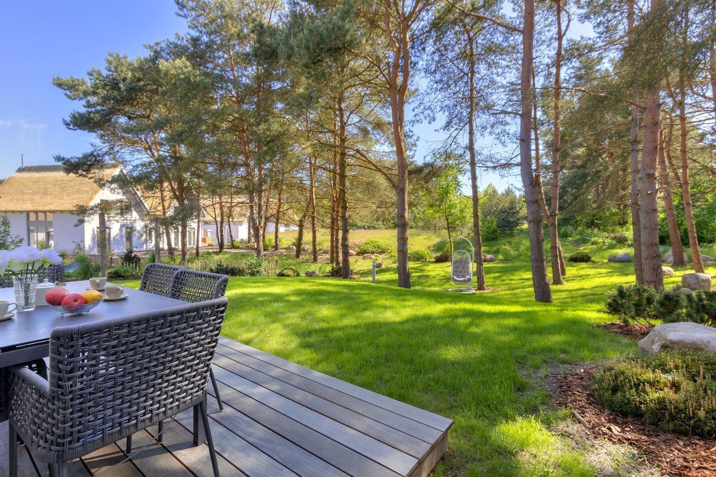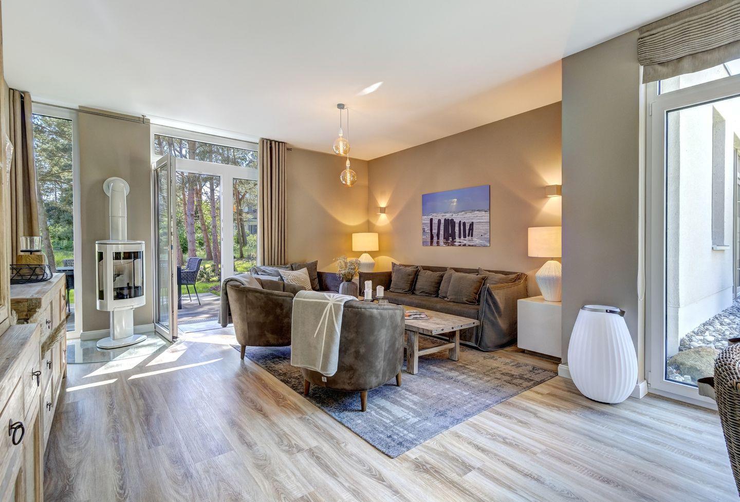 Exklusives 5 Sterne Ferienhaus am Achterwasser im Seebad Loddin mit Garten, Sauna und Kamin sowie einer Elektroladestation für Autos (kostenpflichtig).
