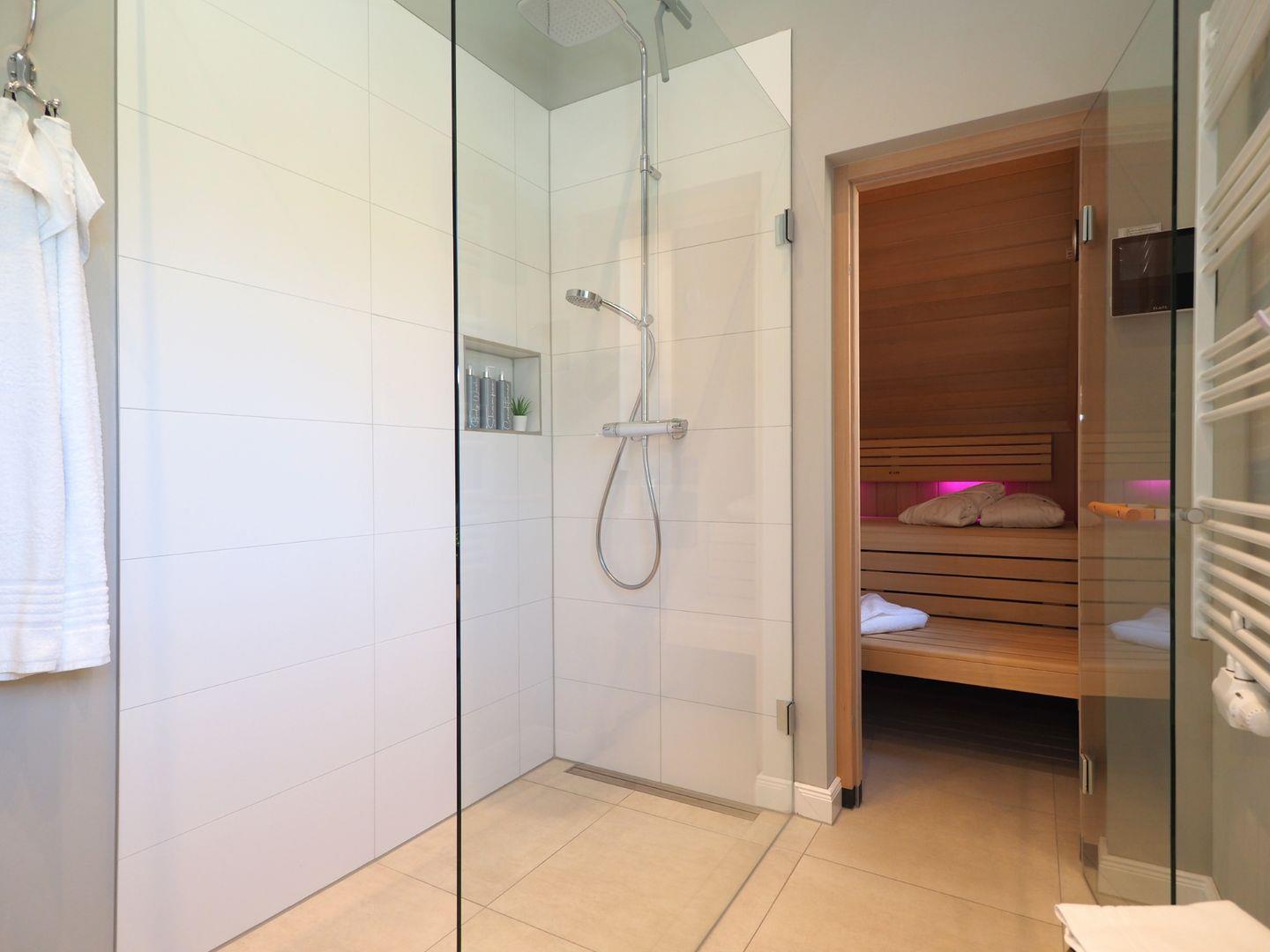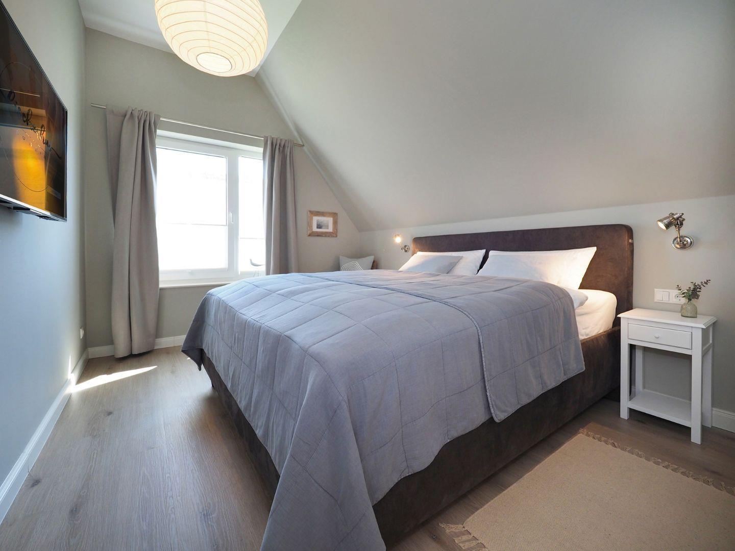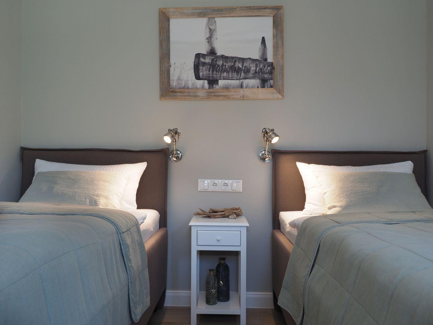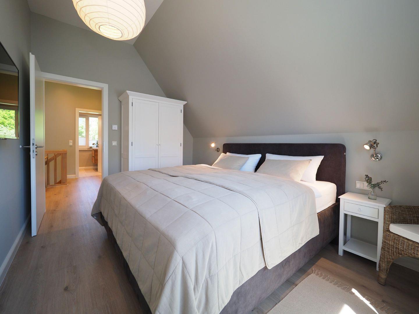 Im Obergeschoss gibt es zwei Schlafzimmer für je 2 Personen mit hochwertigen Doppelbetten, welche für einen angenehmen Schlafkomfort sorgen. Ein internetfähiger Sat-TV ist in jedem der Schlafzimmer vorhanden. Bei Ihrer Anreise sind die Betten natürlich bezogen und die Handtücher (Erstausstattung) liegen für Sie bereit. Außerdem finden Sie ein separates WC und ein Wellness-Badezimmer mit großer Walk-In-Dusche und Premium-Sauna. Die exklusive KLAFS-Sauna aus Hemlockholz mit mehrfarbiger Sunset-Beleuchtung sowie Bluetooth-Audiosystem lässt kühle Herbst- und Wintertage zu einem einzigartigen Wellnesserlebnis werden.