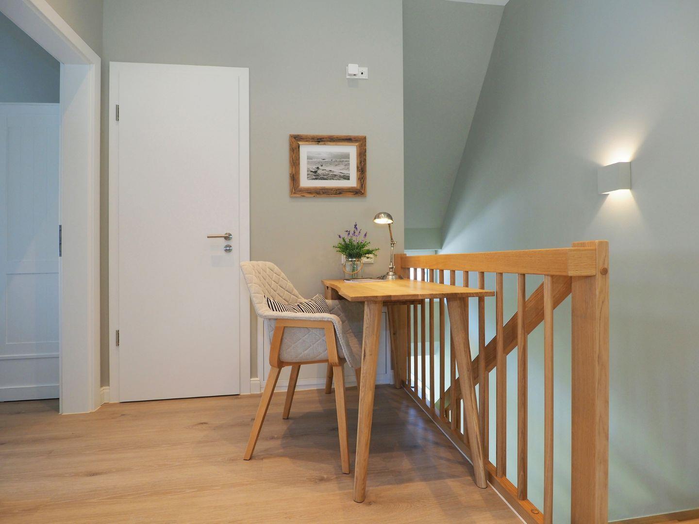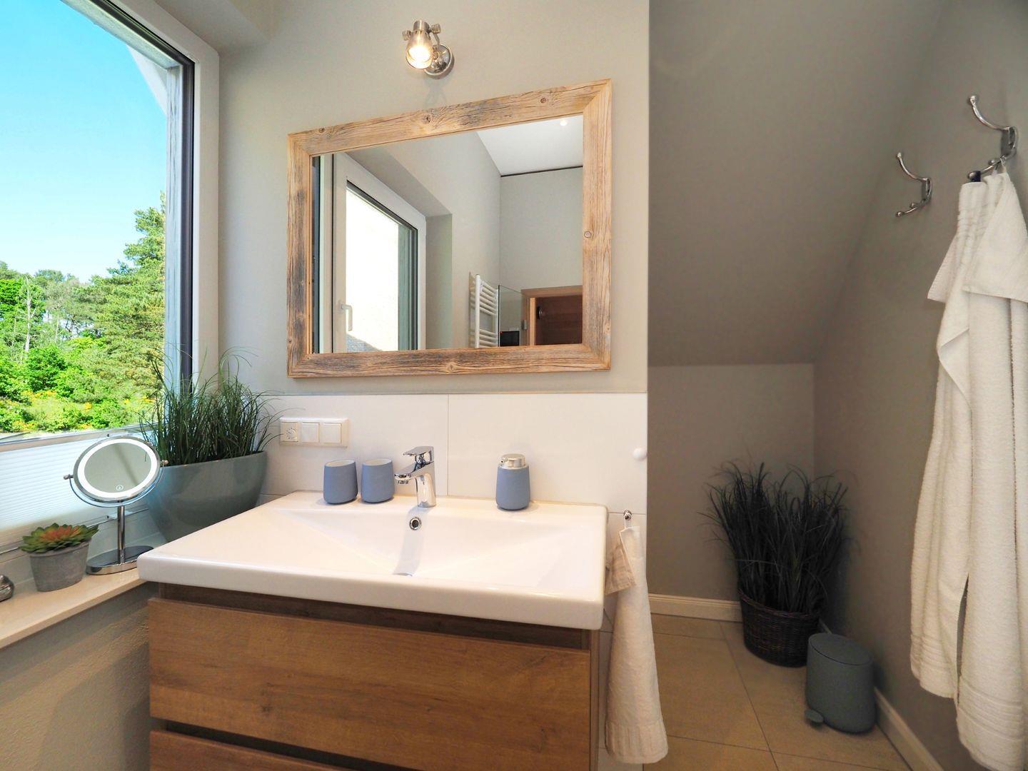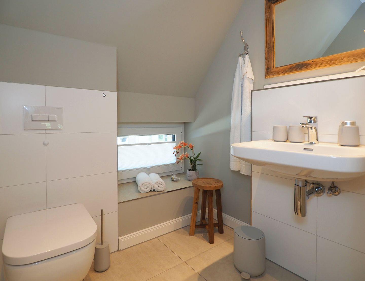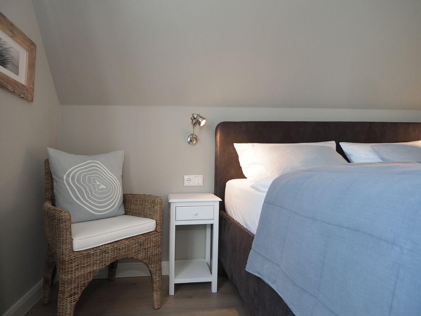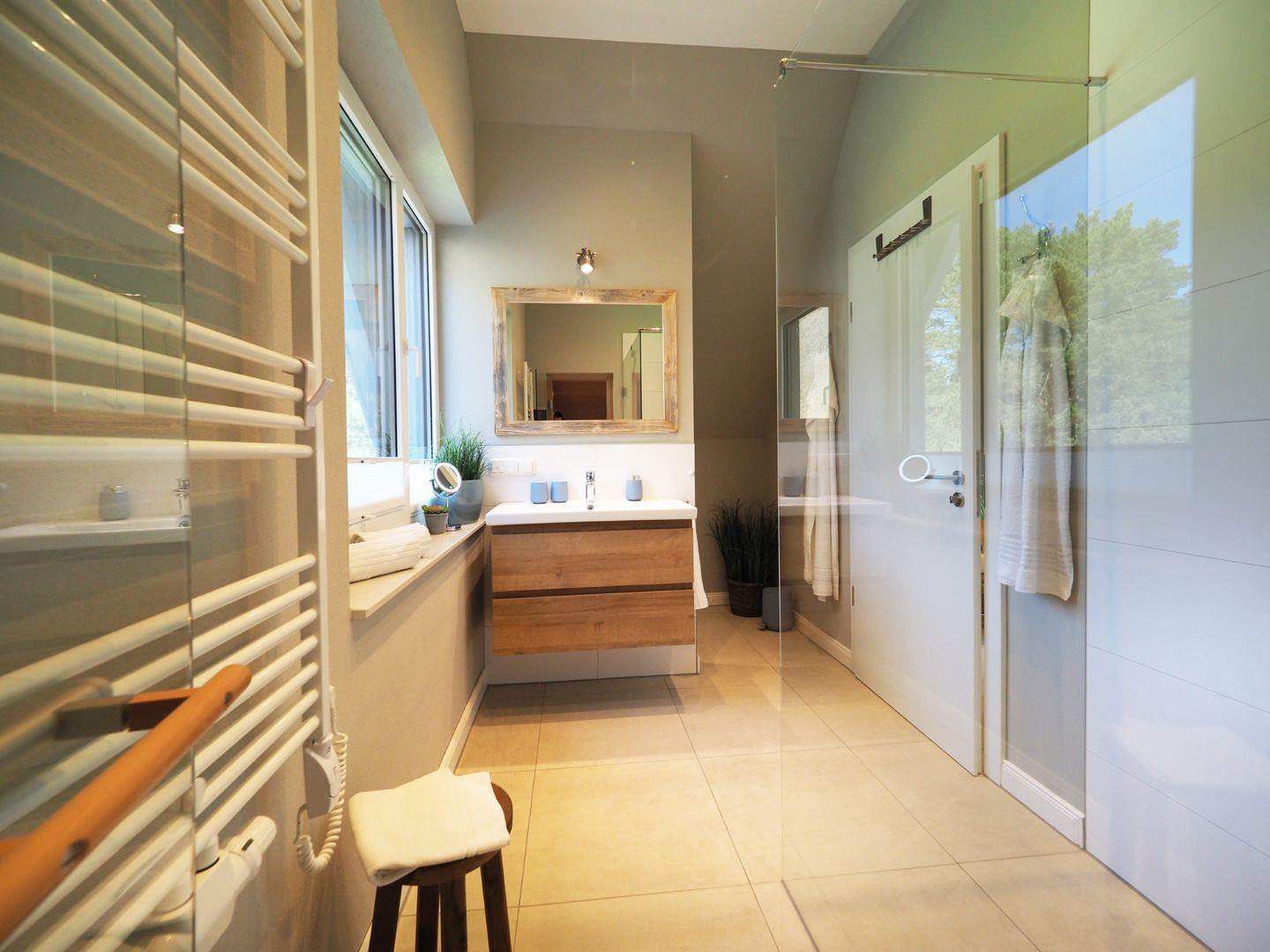 Im Obergeschoss gibt es zwei Schlafzimmer für je 2 Personen mit hochwertigen Doppelbetten, welche für einen angenehmen Schlafkomfort sorgen. Ein internetfähiger Sat-TV ist in jedem der Schlafzimmer vorhanden. Bei Ihrer Anreise sind die Betten natürlich bezogen und die Handtücher (Erstausstattung) liegen für Sie bereit. Außerdem finden Sie ein separates WC und ein Wellness-Badezimmer mit großer Walk-In-Dusche und Premium-Sauna. Die exklusive KLAFS-Sauna aus Hemlockholz mit mehrfarbiger Sunset-Beleuchtung sowie Bluetooth-Audiosystem lässt kühle Herbst- und Wintertage zu einem einzigartigen Wellnesserlebnis werden.