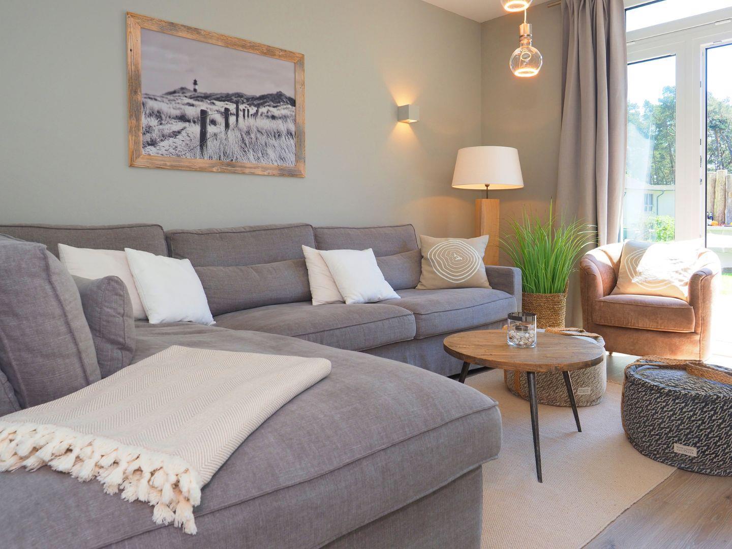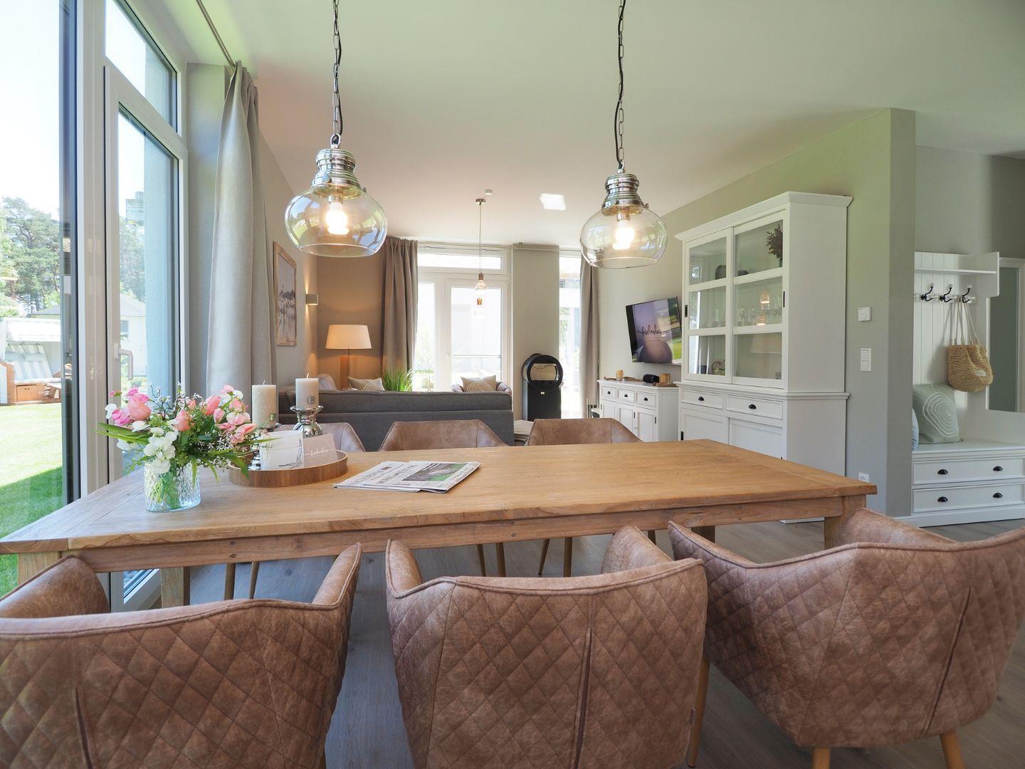 Im Erdgeschoss empfängt Sie ein lichtdurchfluteter Wohn-Essbereich mit offener Küche, welche durch hochwertige Einbaugeräte und alle notwendigen Utensilien zum gemeinsamen Kochen und Backen einlädt. Im Wohnbereich mit gemütlicher Sitzecke und Kamin lassen Sie gemeinsame Abende bei einem Glas Wein ausklingen. Der Essbereich bietet einen traumhaften Blick in den schönen Garten und den angrenzenden Kiefernwald. Des Weiteren befindet sich im Erdgeschoss ein Schlafzimmer mit zwei bequemen Einzelbetten und einem internetfähigen Sat-TV sowie ein großes Bad mit Walk-In-Rainshower vis-à-vis.