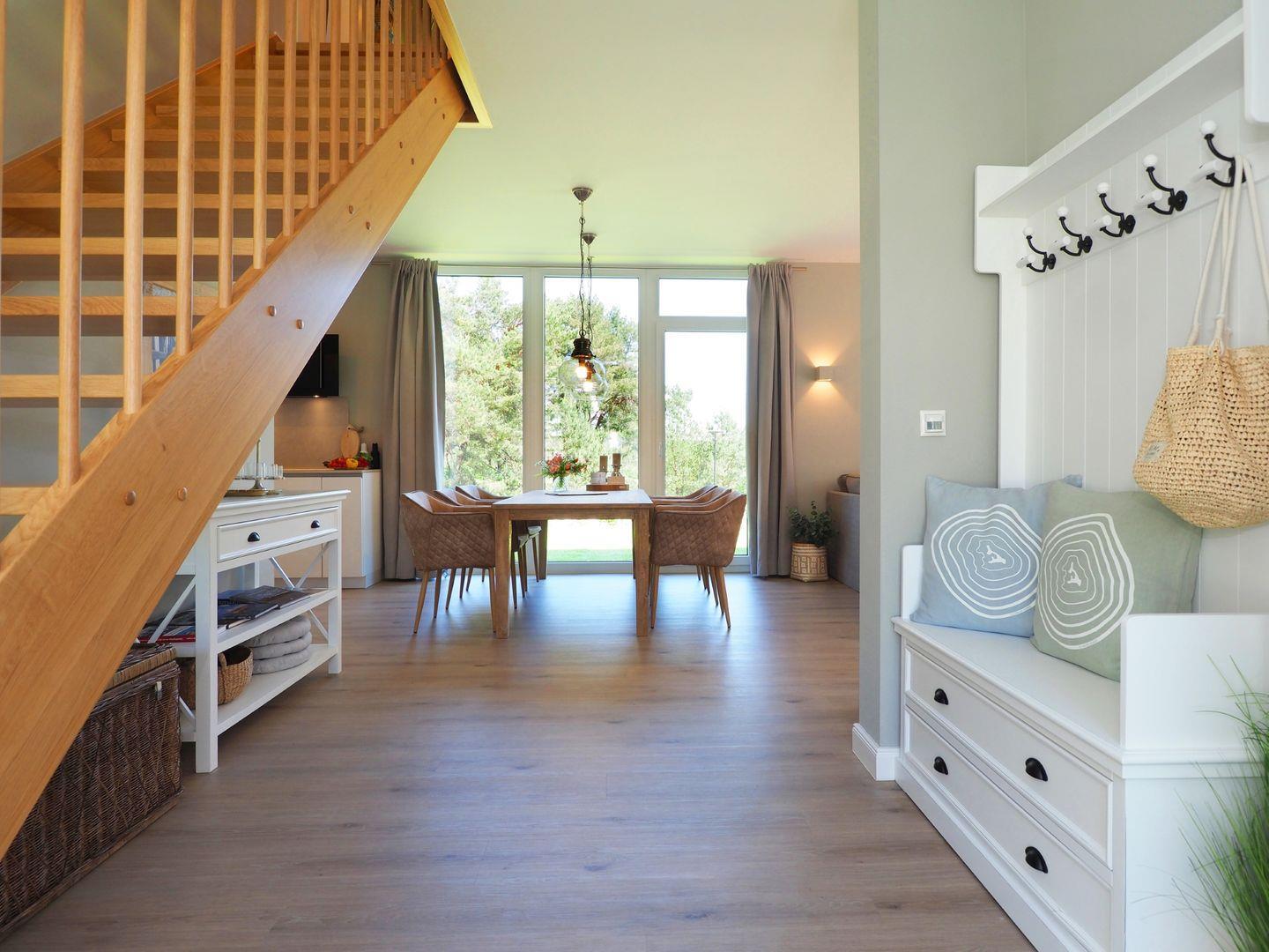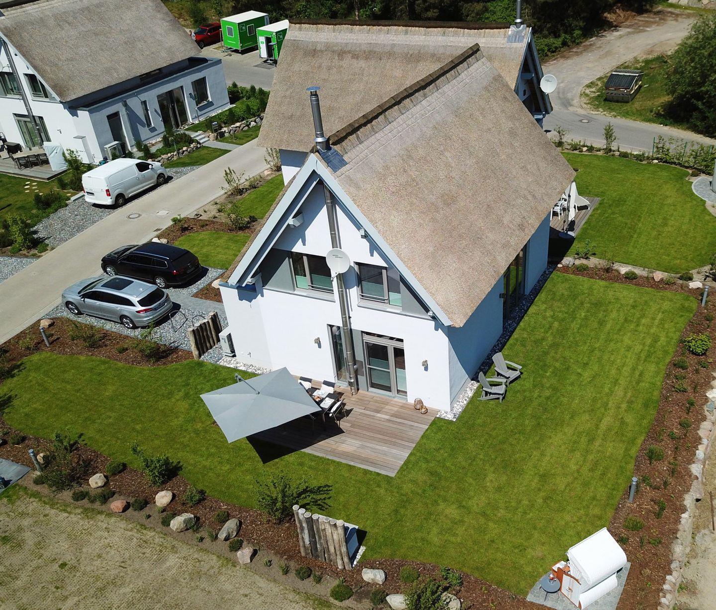 Unser im Jahr 2021 neu erbautes 5-Sterne- Reethaus bietet auf einer Wohnfläche von ca. 135 m² verteilt auf 2 Etagen einen großzügigen Wohn-Essbereich mit offener Küche und Kamin, 3 Schlafzimmer, 2 Bäder mit großen Walk-In-Duschen, ein weiteres Gäste-WC, einen kleinen Relax- sowie einen Saunabereich. Alle Zimmer sind mit Fußbodenheizung sowie Insektenschutz ausgestattet. Durch die großzügigen Fensterflächen lässt sich die Natur auch im Haus erleben!