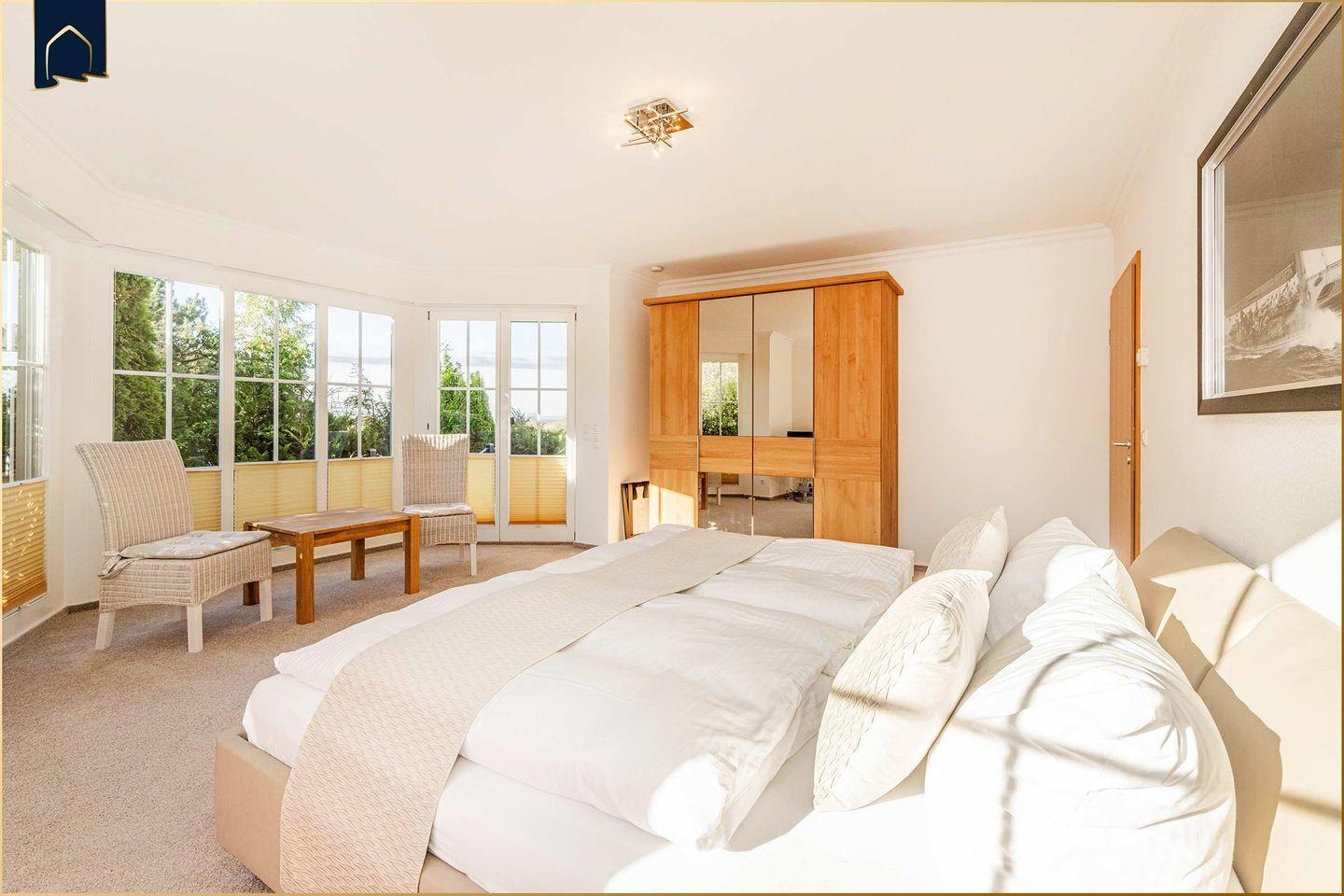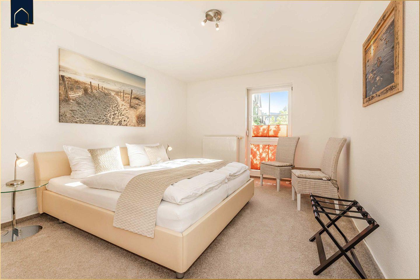 Zwei geschmackvoll eingerichtete Schlafzimmer mit Doppelbetten garantieren erholsamen Schlaf. Bei Bedarf bieten hochwertige Zustellbetten Platz für zwei weitere Personen. Das große Badezimmer verwöhnt mit Badewanne, separater Dusche und Fußbodenheizung. Zusätzlich steht ein separates Gäste-WC zur Verfügung. Für entspannte Wellness-Momente sorgt die Gemeinschaftssauna mit Panoramablick und Ruheraum – ideal nach langen Spaziergängen am Strand.