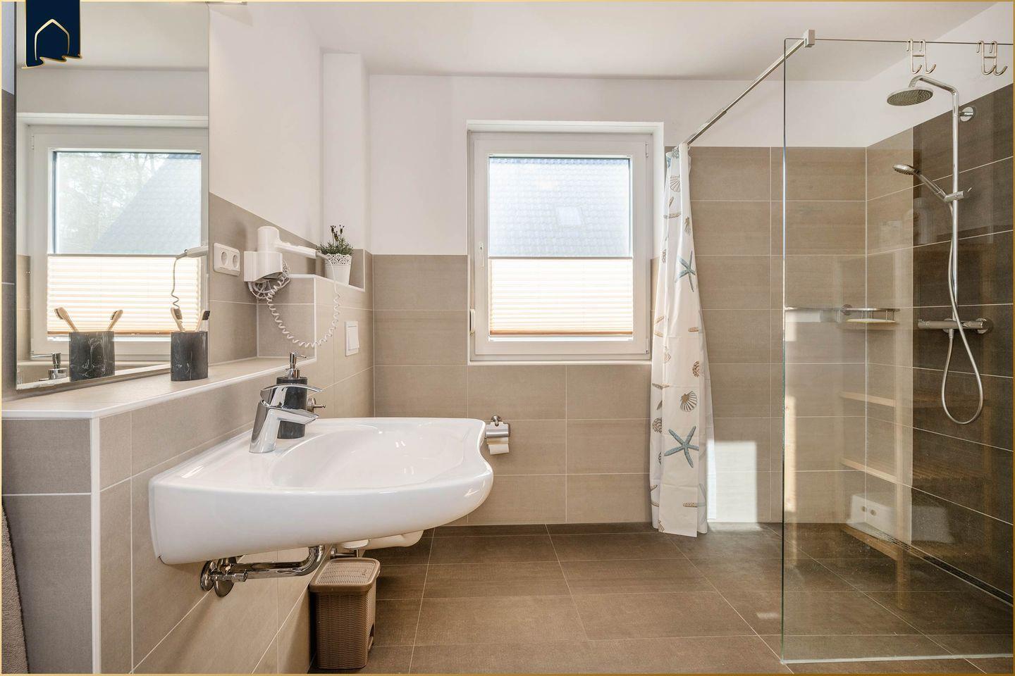 Die Ferienwohnung verfügt über zwei gemütliche Schlafzimmer und ein modernes Badezimmer mit bodengleicher Dusche. Die offene Küche ist vollständig ausgestattet mit Backofen, Herd, Mikrowelle, Geschirrspüler, Kühlschrank mit Gefrierfach, Toaster, Wasserkocher und Kaffeemaschine – ideal für Selbstversorger. Ein gemütliches Wohnzimmer mit Sofaecke, zwei Fernsehern (inkl. internationaler Kanäle), CD-/DVD-Player und Gesellschaftsspielen lädt zu entspannten Abenden ein. Für den Komfort sorgen außerdem WLAN, Waschmaschine, Trockner, Fußbodenheizung und ein privater Parkplatz direkt am Haus.