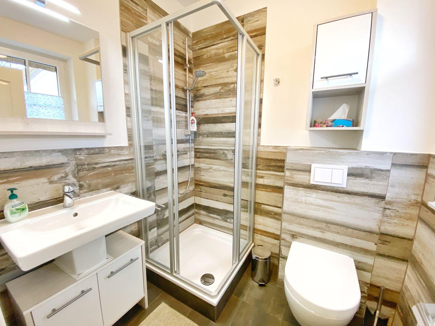 Auf 87qm Wohnfläche finden 4 Personen ausreichend Platz. Im Erdgeschoß der Doppelhaushälfte befindet sich das gemütliche Wohn-Esszimmer mit offener Küche. Von dort gelangt man auf die vorgelagerte Terrasse und in den Garten. Der Wohnbereich ist in warmen Farben und Holzoptik gemütlich und modern eingerichet. Die moderne Einbauküche verfügt über Geschirrspüler, Induktionsherd, Mikrowelle, Kühlschrank mit Gefrierfach, Wasserkocher, Kaffeemaschine Toaster und zahlreiche Küchenutensilien. Im Obergeschoß befinden sich die beiden Schlafzimmer. Das eine Schlafzimmer verfügt über ein bequemes Boxspring-Doppelbett und das andere Schlafzimmer über ein Einzelbett, welches man durch Auszug zu einem Doppelbett vergrößern kann. Im Haus gibt es zwei Bäder, ein kleineres im Erdgeschoß mit Dusche. Das größere Bad im Obergeschoß verfügt zusätzlich zur Dusche auch über eine Badewanne. Zum Haus gehört eine Terrasse mit Gartenmöbeln, ein Carport für den Pkw und ein Schuppen im Garten.