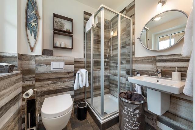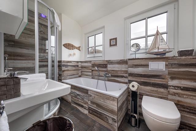 Im Haus gibt es zwei Bäder, ein kleineres im Erdgeschoß mit Dusche. Das größere Bad im Obergeschoß verfügt zusätzlich zur Dusche auch über eine Badewanne. Waschmaschine und Trockner stehen zur Verfügung.