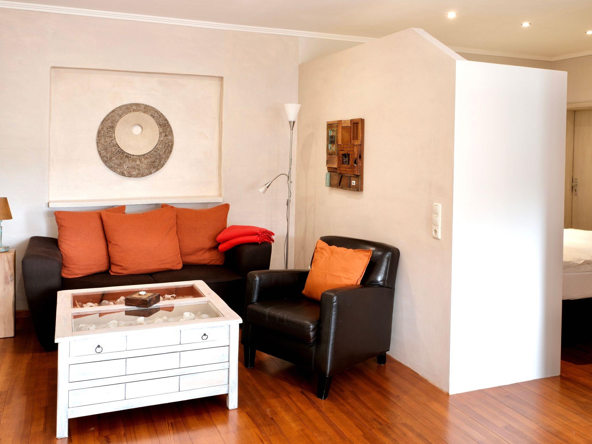 Das Studio Strandgut ist eine 36 qm große 1-Raum-Wohnung für 1 - 2 Personen und besteht aus einem kombinierten Wohn-/Schlafraum mit integrierter Küchenzeile, Bad, Terrasse (8 qm).
