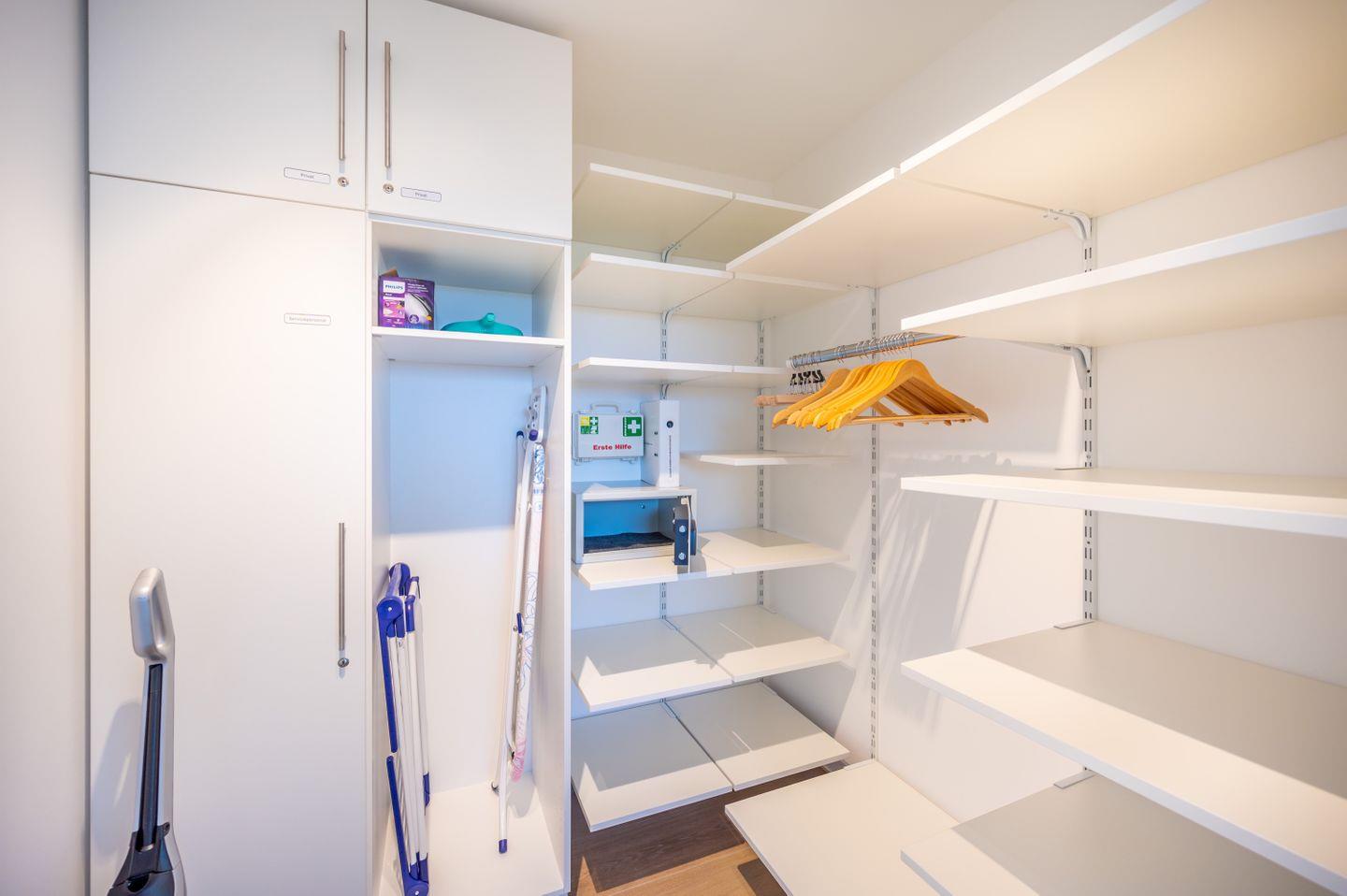 Das moderne Duschbad ermöglicht einen entspannten Start in den Tag. Das maßangefertigte Badinterieur bietet viel Stauraum und Platz (großes Waschbecken). Ein Waschtrockner (Kombigerät) zur freien Verfügung ist ebenfalls bedacht.