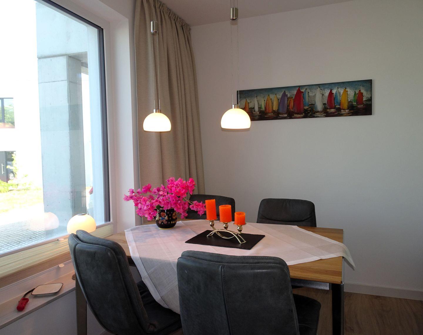 Der offene Wohn- und Essbereich mit bodentiefen Fenstern sorgt für viel Tageslicht und Wohlfühlatmosphäre. Hochwertige Möbel und ein modernes Design schaffen ein elegantes Ambiente. Die offene Küche ist voll ausgestattet – perfekt für entspannte Kochmomente. Auf dem Schlafsofa finden zwei Kinder oder eine erwachsene Person bequem Platz.
