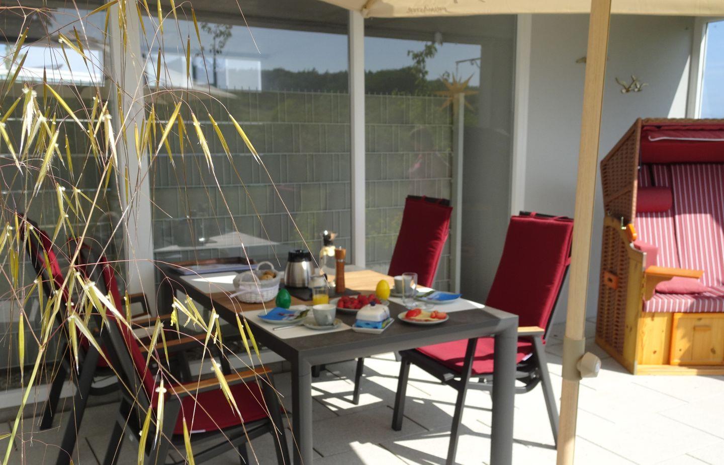 Die sonnige Terrasse mit windgeschütztem Bereich und angrenzendem Garten lädt zum Frühstück im Freien oder abendlichen Glas Wein ein. Genieße die frische Ostseeluft und den Blick auf die Natur – auch mit Hund.