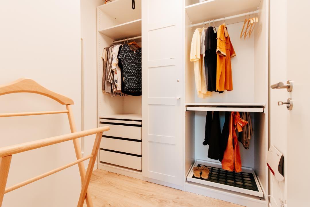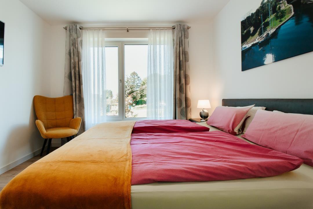 Das Schlafzimmer ist mit einem komfortablen Doppelbett (180?×?200?cm) und einer praktischen Ankleide ausgestattet. Verdunklungsvorhänge sorgen für erholsamen Schlaf und Privatsphäre.