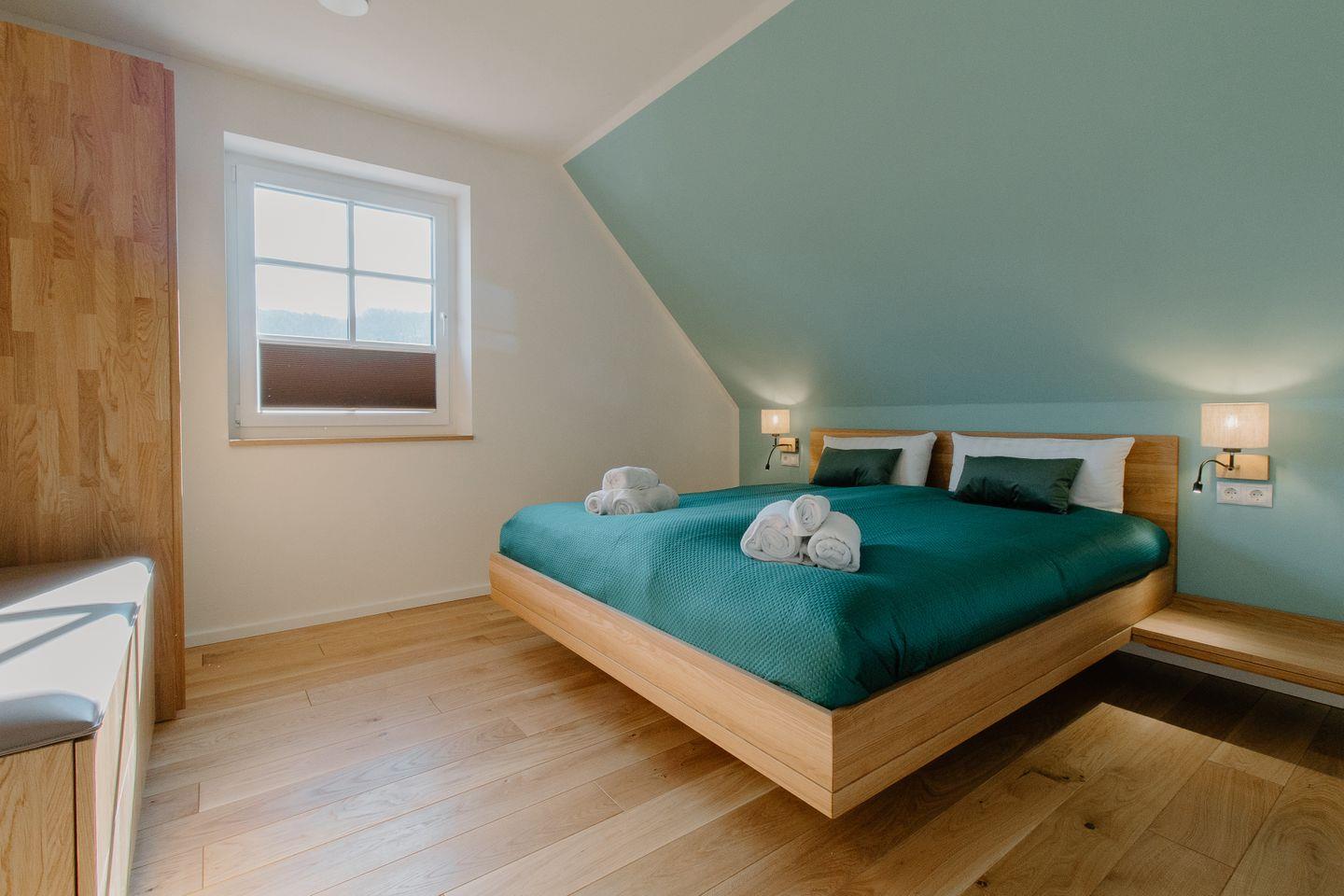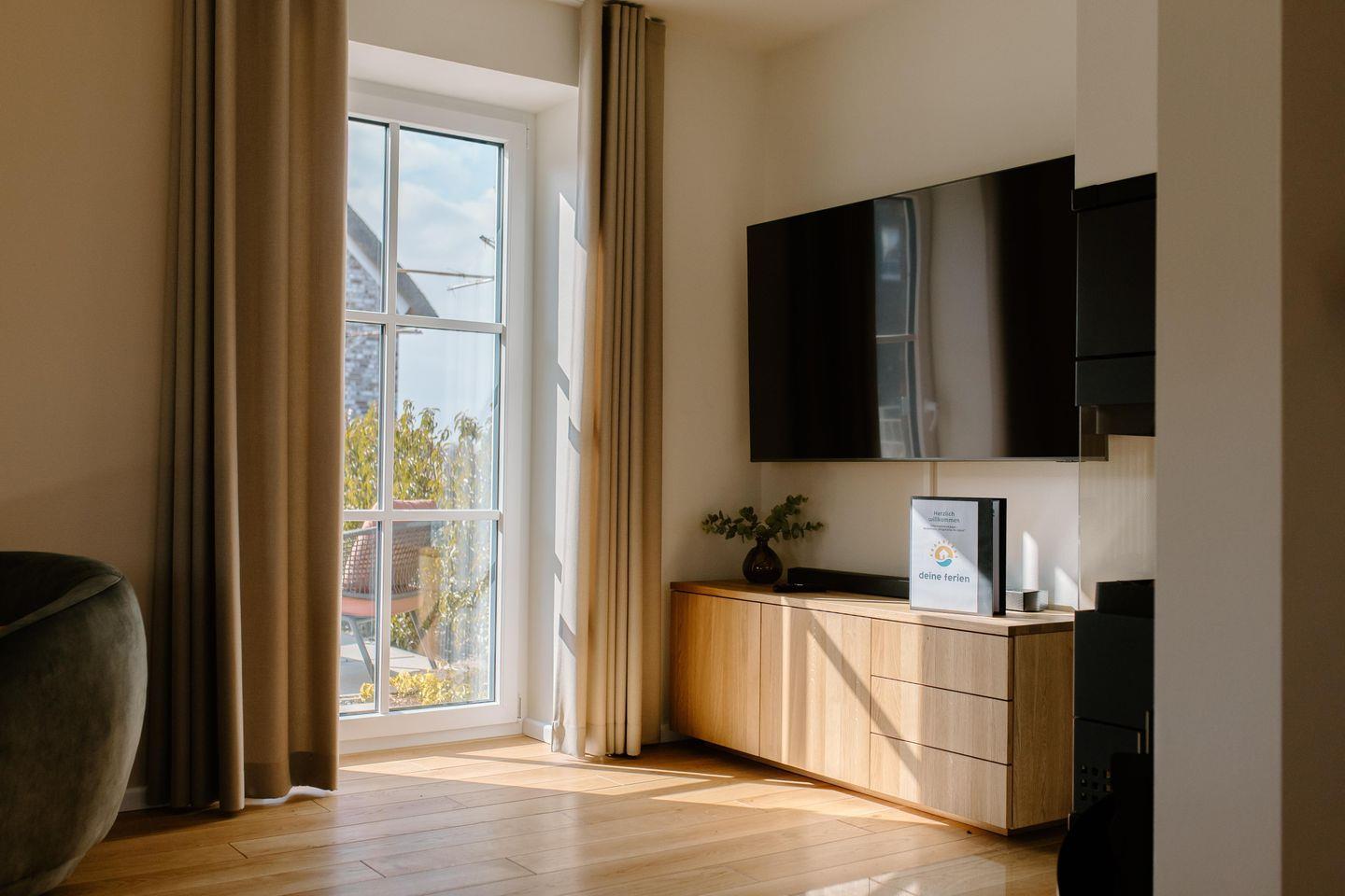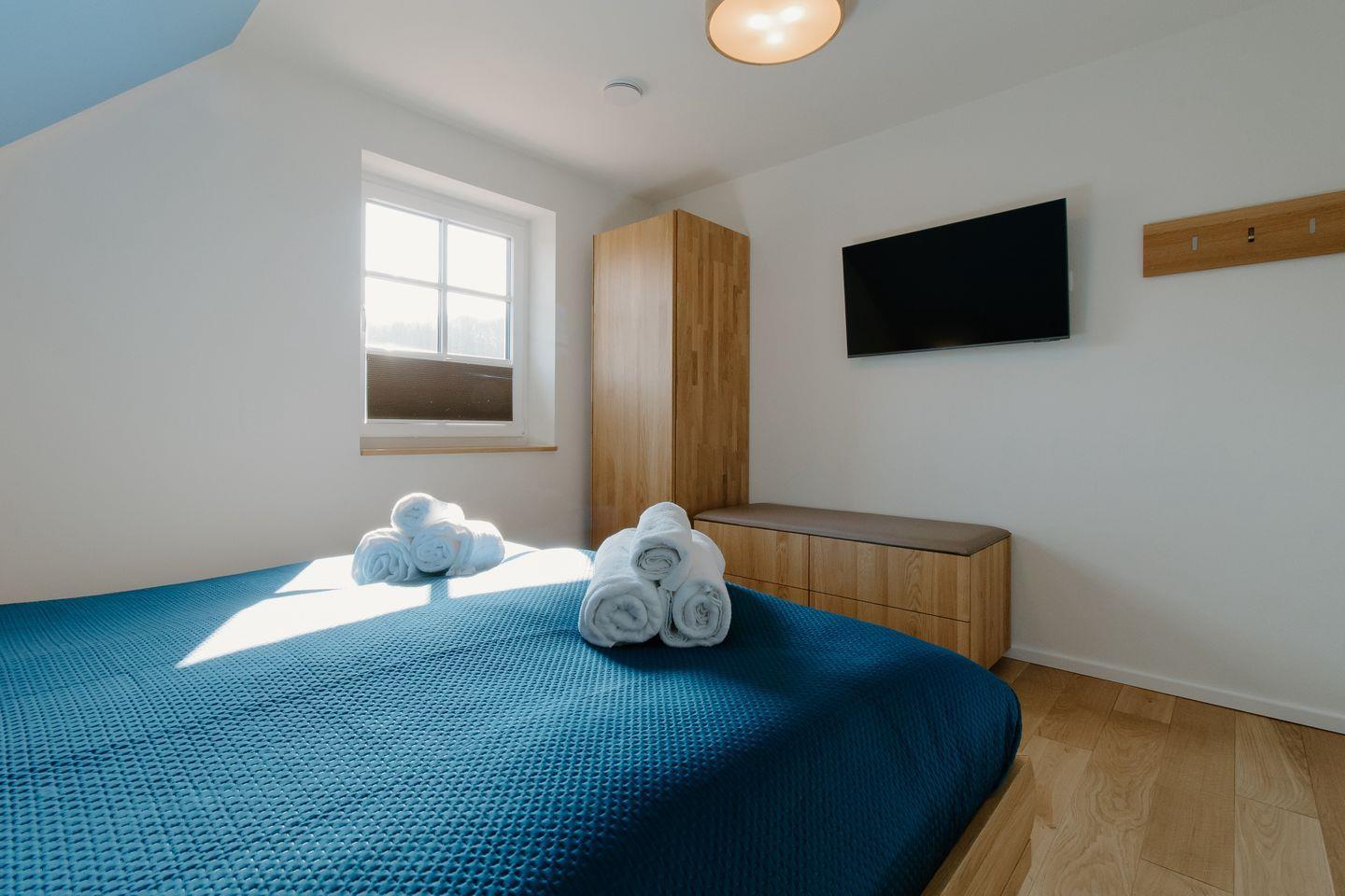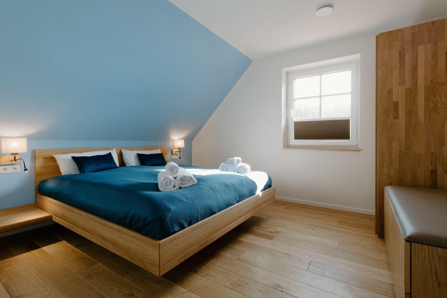 Die drei Schlafzimmer im Obergeschoss versprechen erholsame Nächte. Zwei davon sind mit komfortablen Doppelbetten und Smart-TVs ausgestattet, während das dritte über zwei Einzelbetten verfügt, die sich bei Bedarf zusammenschieben lassen. Verdunkelungsplissees sorgen in allen Räumen für entspannte Ruhe zu jeder Tageszeit.