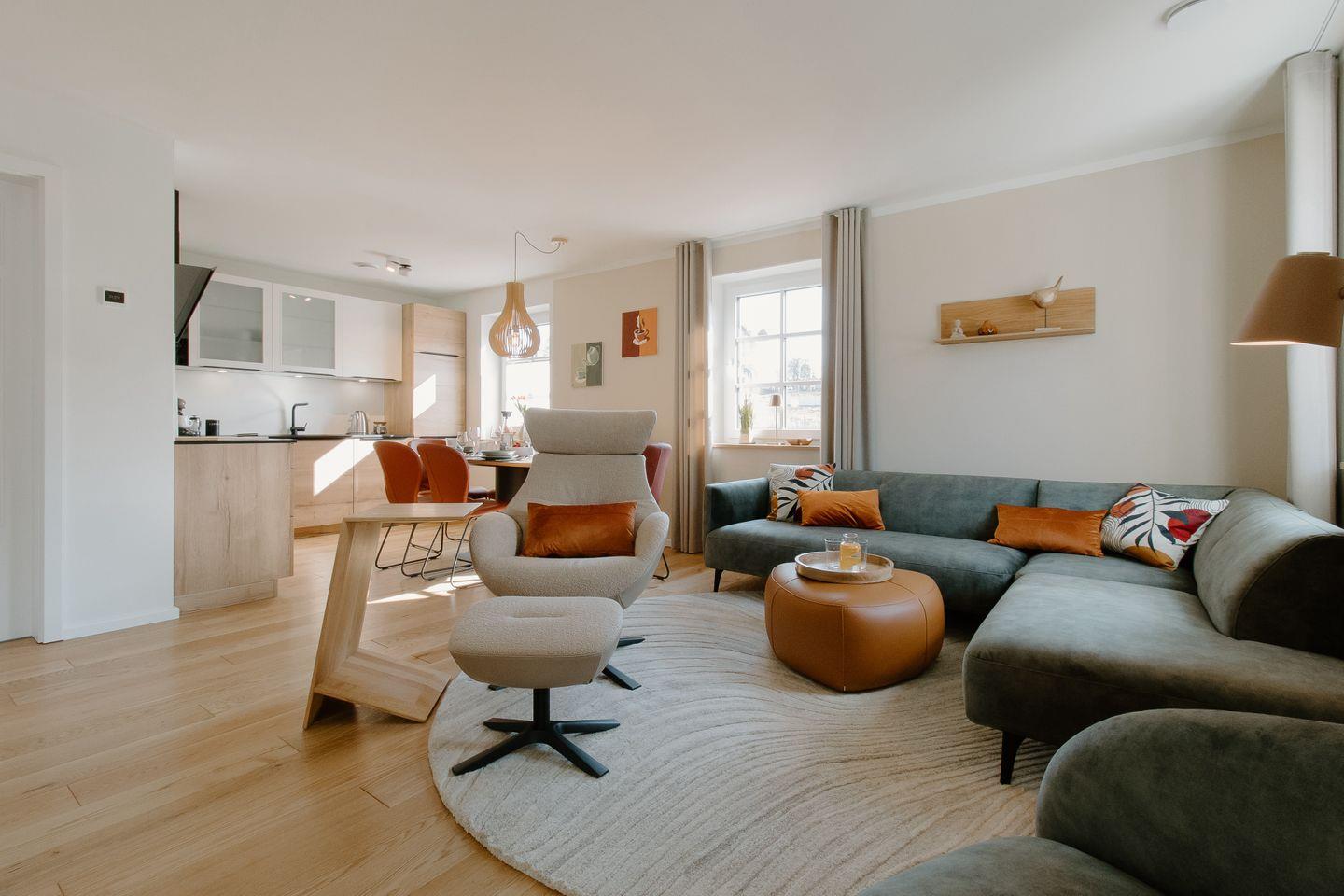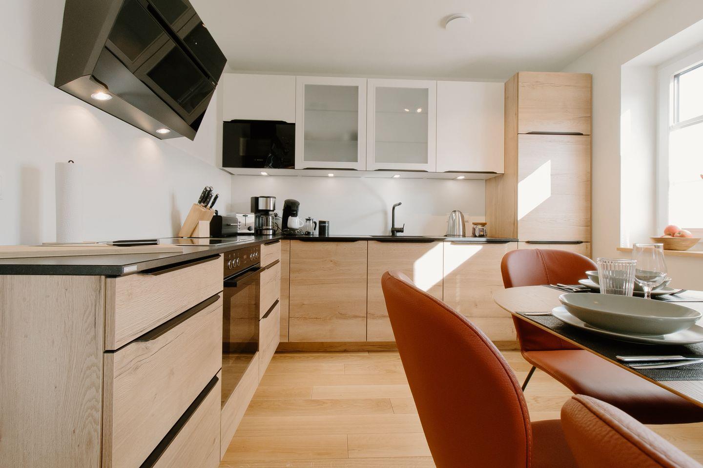 Im offen gestalteten Wohnbereich genießt du eine große Sitzlandschaft, einen modernen Kaminofen für gemütliche Abende und beste Unterhaltung mit Smart-TV und Soundbox. Die Küche ist ein echter Wohlfühlort für Genießer – komplett ausgestattet mit Backofen, Mikrowelle, verschiedenen Kaffeebereitern und sogar einem Smoothie-Mixer. Beim Frühstück am Esstisch oder auf der sonnigen Terrasse mit Gartenblick beginnt dein Urlaubstag ganz entspannt.