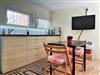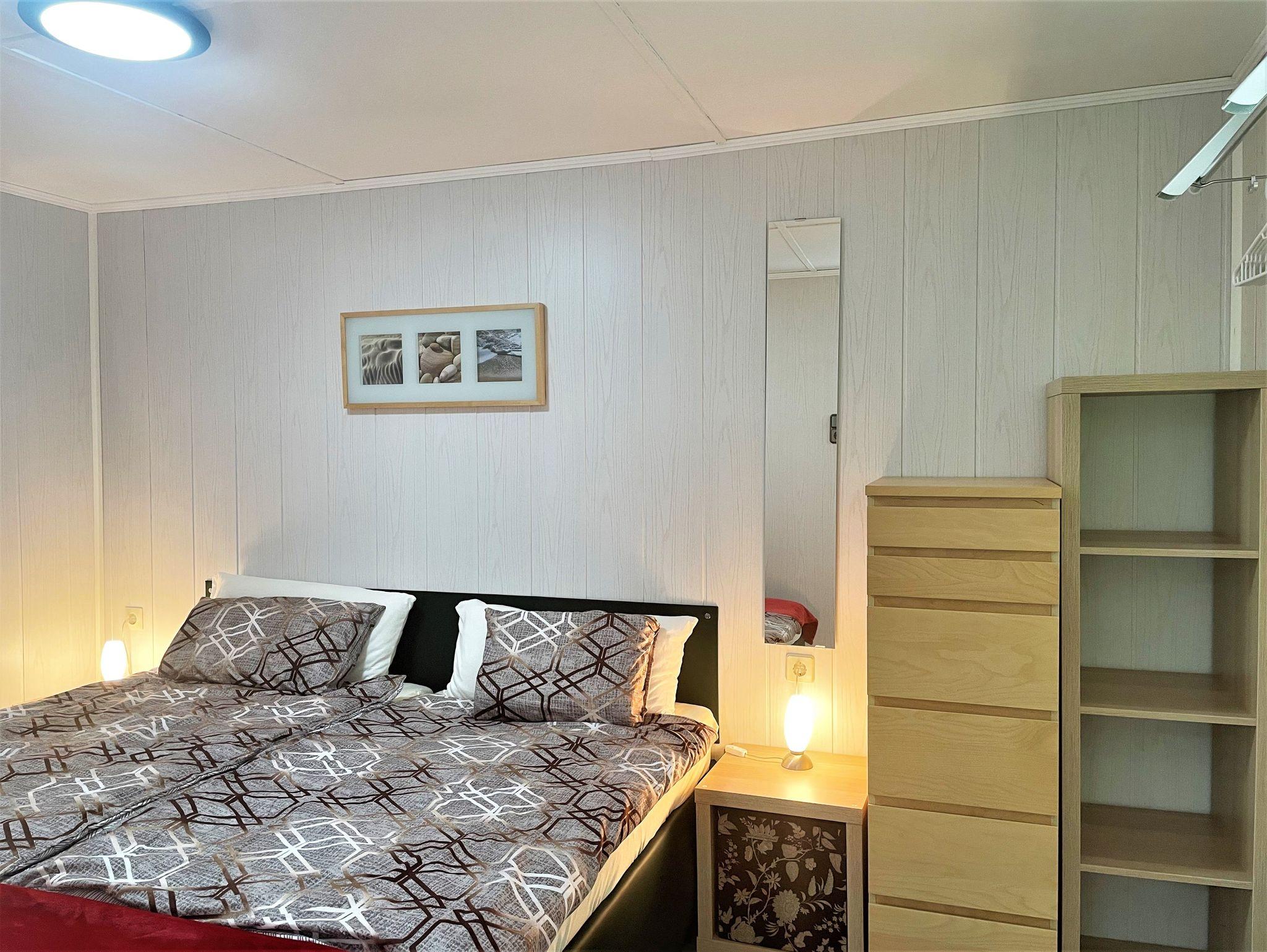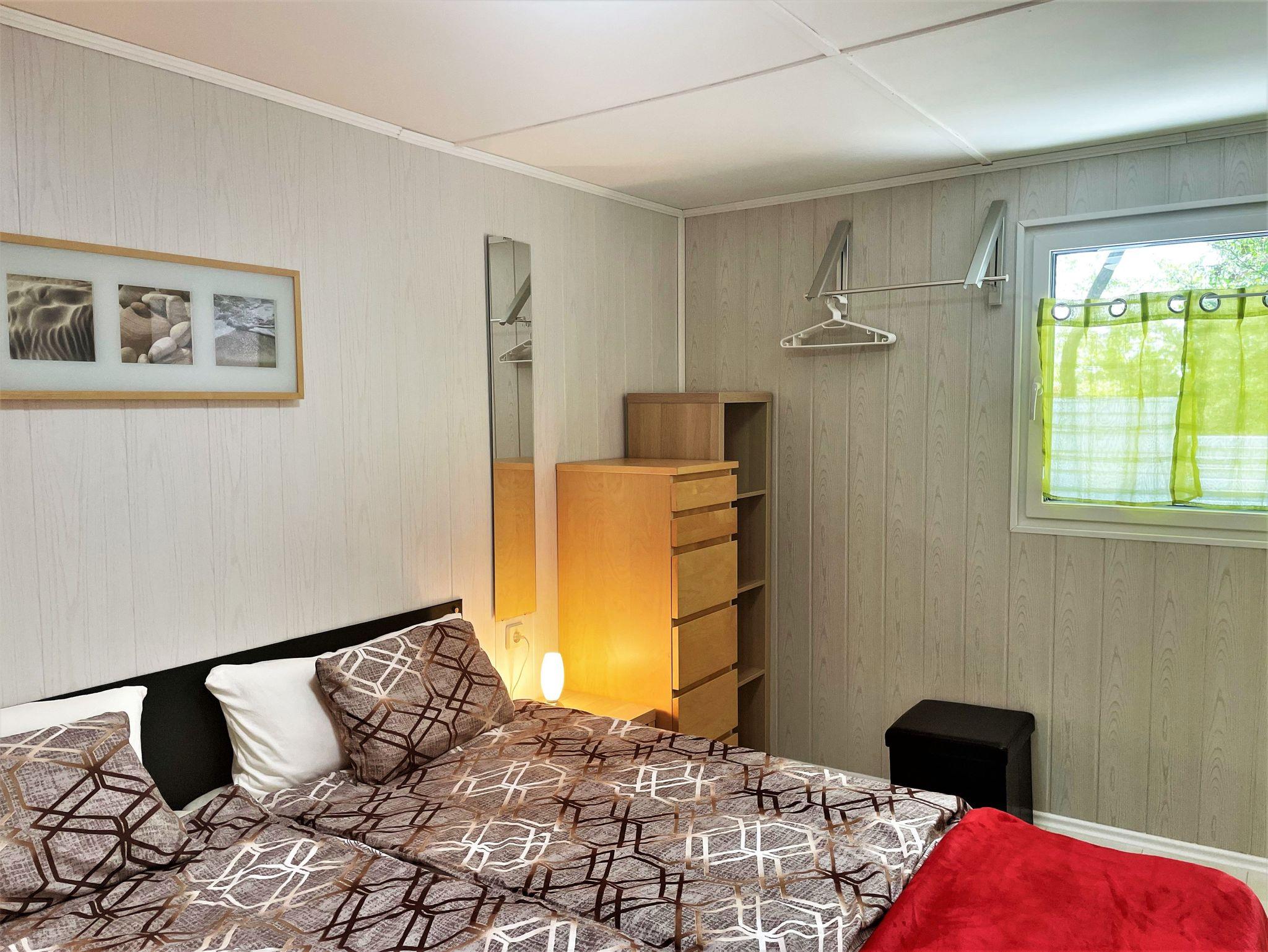 Der 27 m² große Bungalow kann bis zu 3 Personen beherbergen. Er verfügt über einen Wohn.-Schlafbereich mit einer offenen Küche, separaten Schlafzimmer und einem Bad. Im Wohnbereich befindet sich eine gut ausgestattete Küchenzeile mit einem E-Herd, Kühlschrank mit Frostfach, einer Mikrowelle mit Grillfunktion, Kaffeemaschine und weiteren Annehmlichkeiten für den Aufenthalt. Der Wohnbereich verfügt über eine komfortable ausziebare Recamiere, die für eine Person als Aufbettung dient. Für Unterhaltung sorgt ein an der Wand angebrachter TV-Flachbildschirm. Ein separates Schlafzimmer ist mit einem Doppelbett und verschiedenen Regelteilen möbliert. Das modern gestaltete Bad verfügt über eine Dusche, Waschtisch mit Spiegel und einem WC. An kühlen Tagen sorgt ein Ölradiator für angenehme Temperaturen in der Unterkunft.