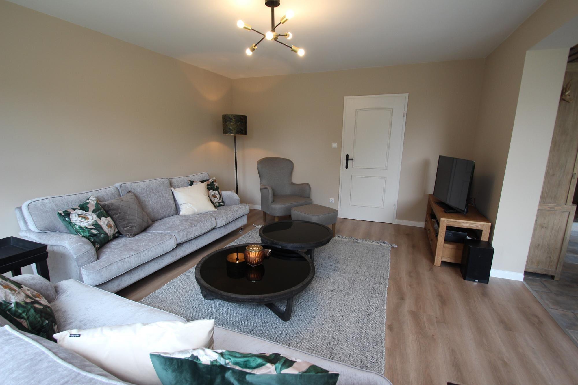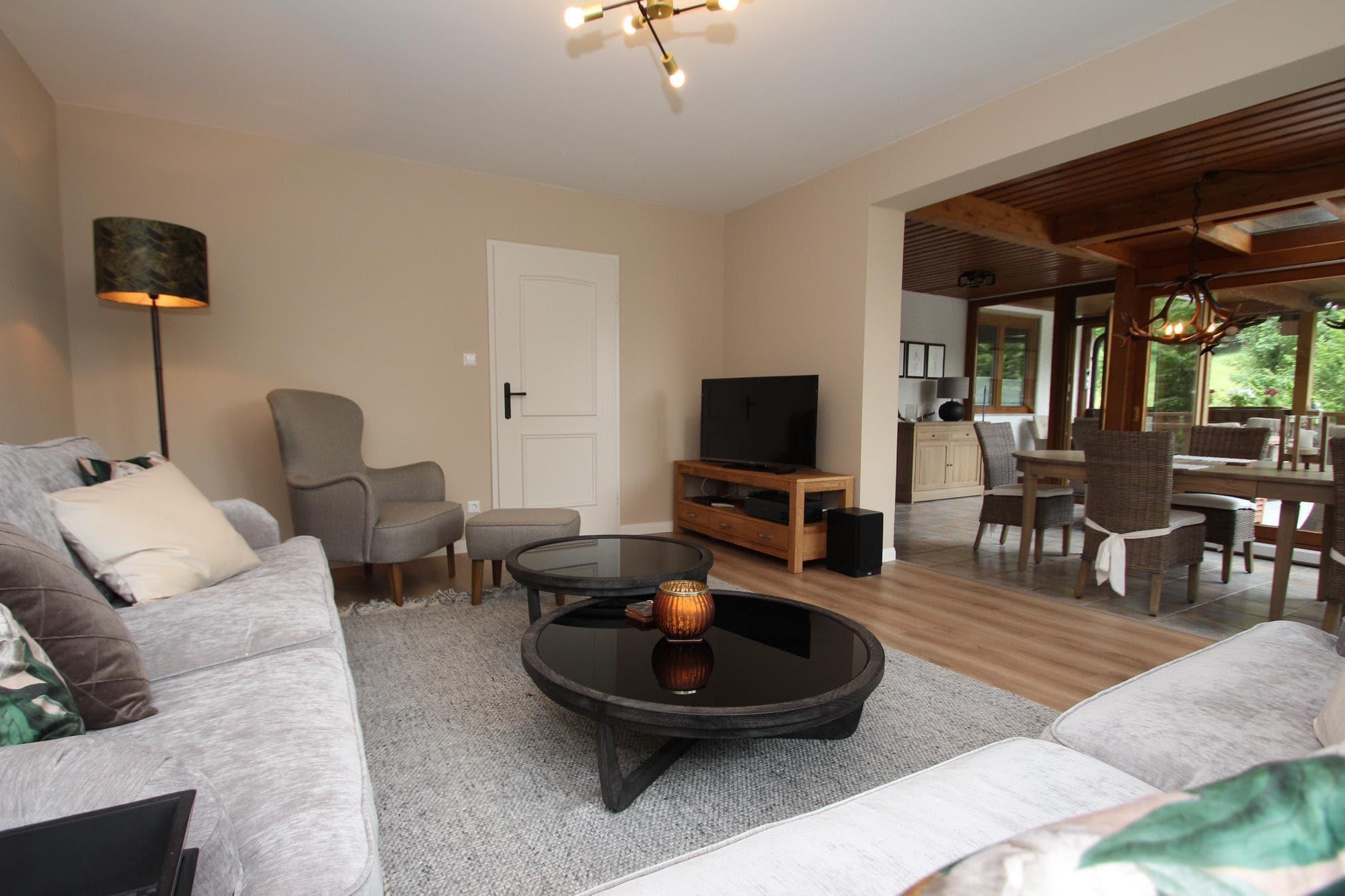 Mellemetage: (Køkken(kogeplade(Komfur med fire kogeplader, glaskeramisk), elkedel, brødrister, kaffemaskine, ovn, mikrobølgeovn, opvaskemaskine , køleskab, fryser), stue / spisestue(Fjernsyn(parabol), spisebord, pejs, sofahjørne, DVD-afspiller, radio, CD-afspiller), soveværelse(dobbeltseng), soveværelse(enkeltseng, enkeltseng), svalegang soveværelse(dobbeltseng), badeværelse(badekar, bruser, håndvask, toilet, bidet, føntørrer), badeværelse(bruser, håndvask, toilet, føntørrer)) carport, grill, sauna(privat), varme(gas), terrasse, have, cykelopbevaring(deles med andre gæster), havemøbler, solstole, grill, parkering, liggestole, Parasol, barnestol, strygebræt, hyggespil, baby crib(free)
