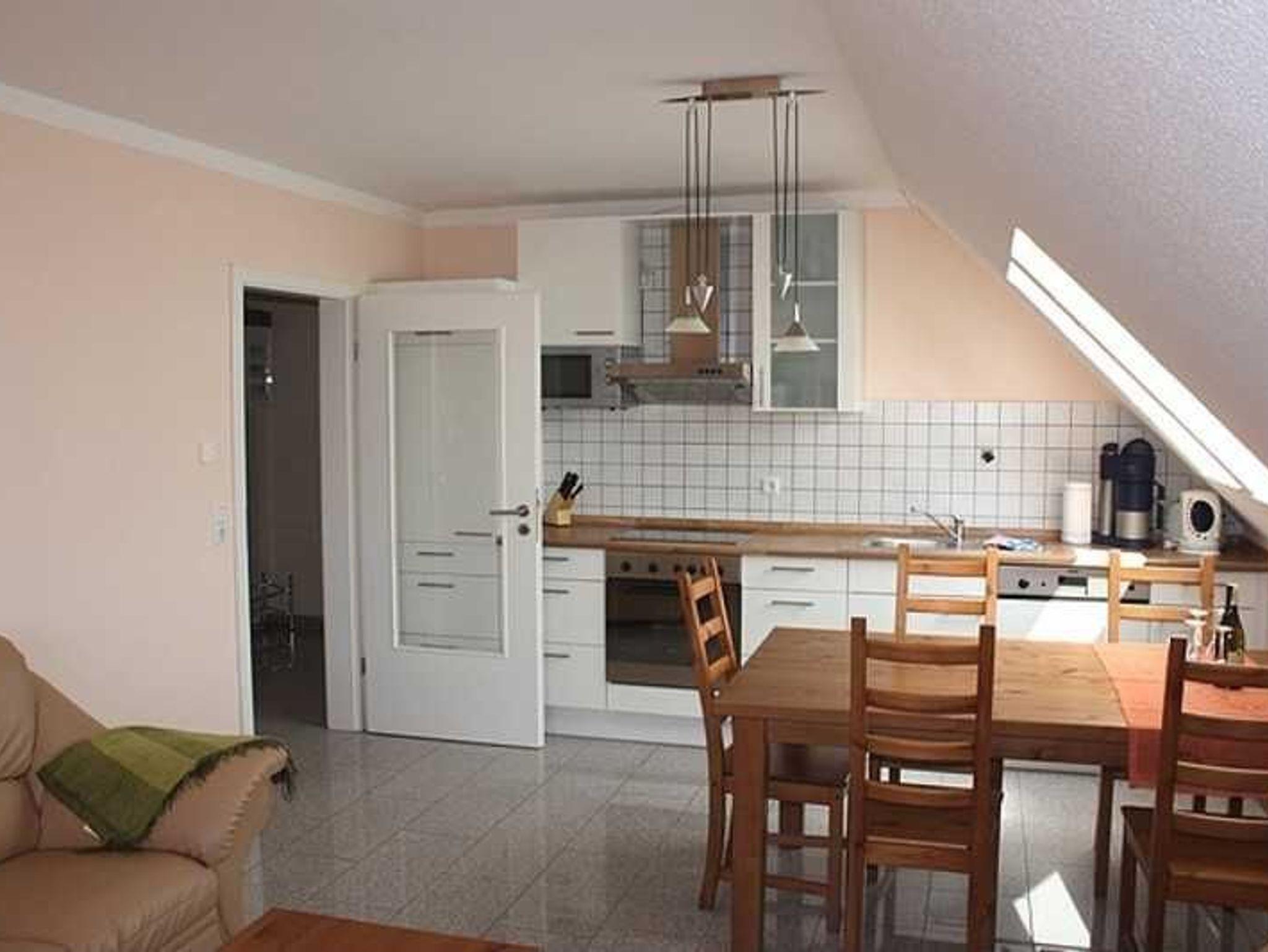 Die Ferienwohnung in der 1. Etage besitzt 1 Wohnraum mit komplett ausgestatteter Küchenzeile, 1 Eßplatz,